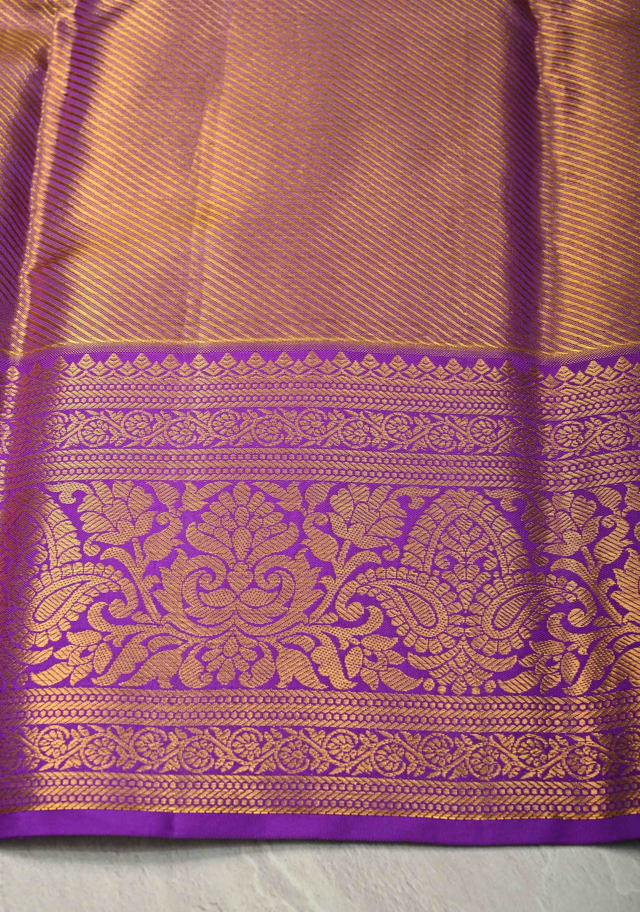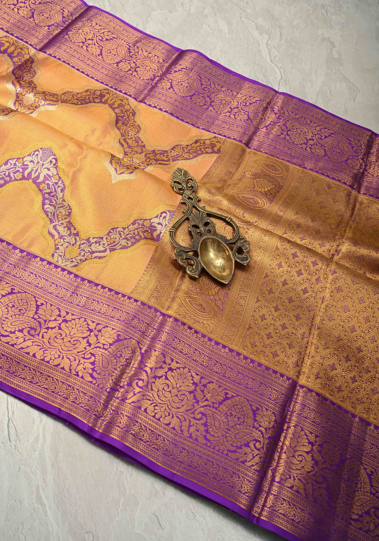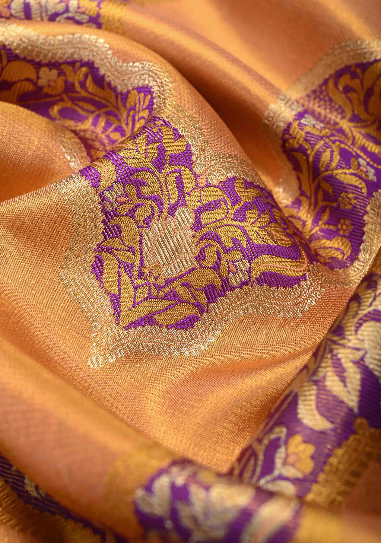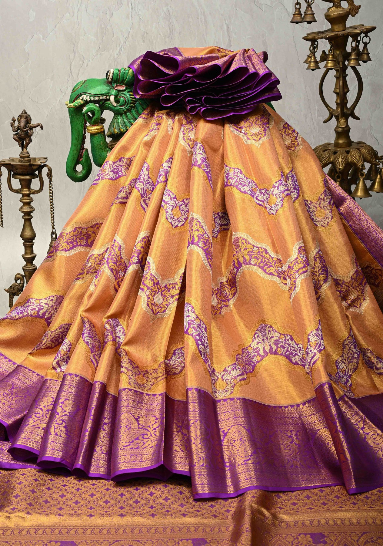 The Orange–Gold Dual Tone Tissue Kanjivaram Pure Silk Saree is a radiant blend of traditional grandeur and artistic finesse. Crafted from tissue Kanjivaram pure silk, this saree features a luminous orange–gold dual tone that shimmers with regal elegance. The body is beautifully adorned with intricate Meenakari leheria (wave) designs, adding graceful movement and vibrant handcrafted detail. A zari border frames the saree with classic Kanjivaram richness, enhancing its timeless appeal. Opulent and graceful, this saree is perfect for weddings, bridal trousseaus, and grand festive celebrations.