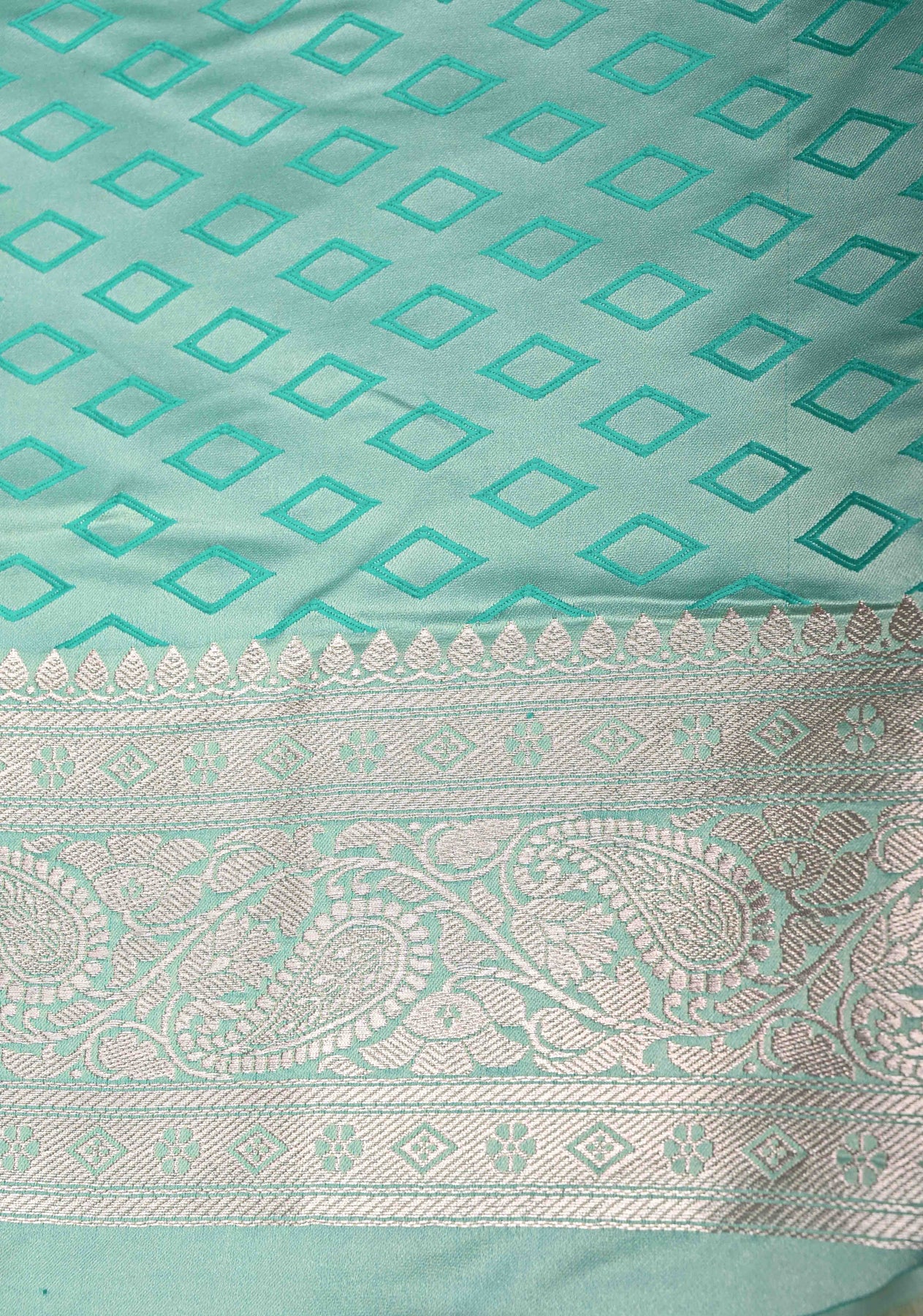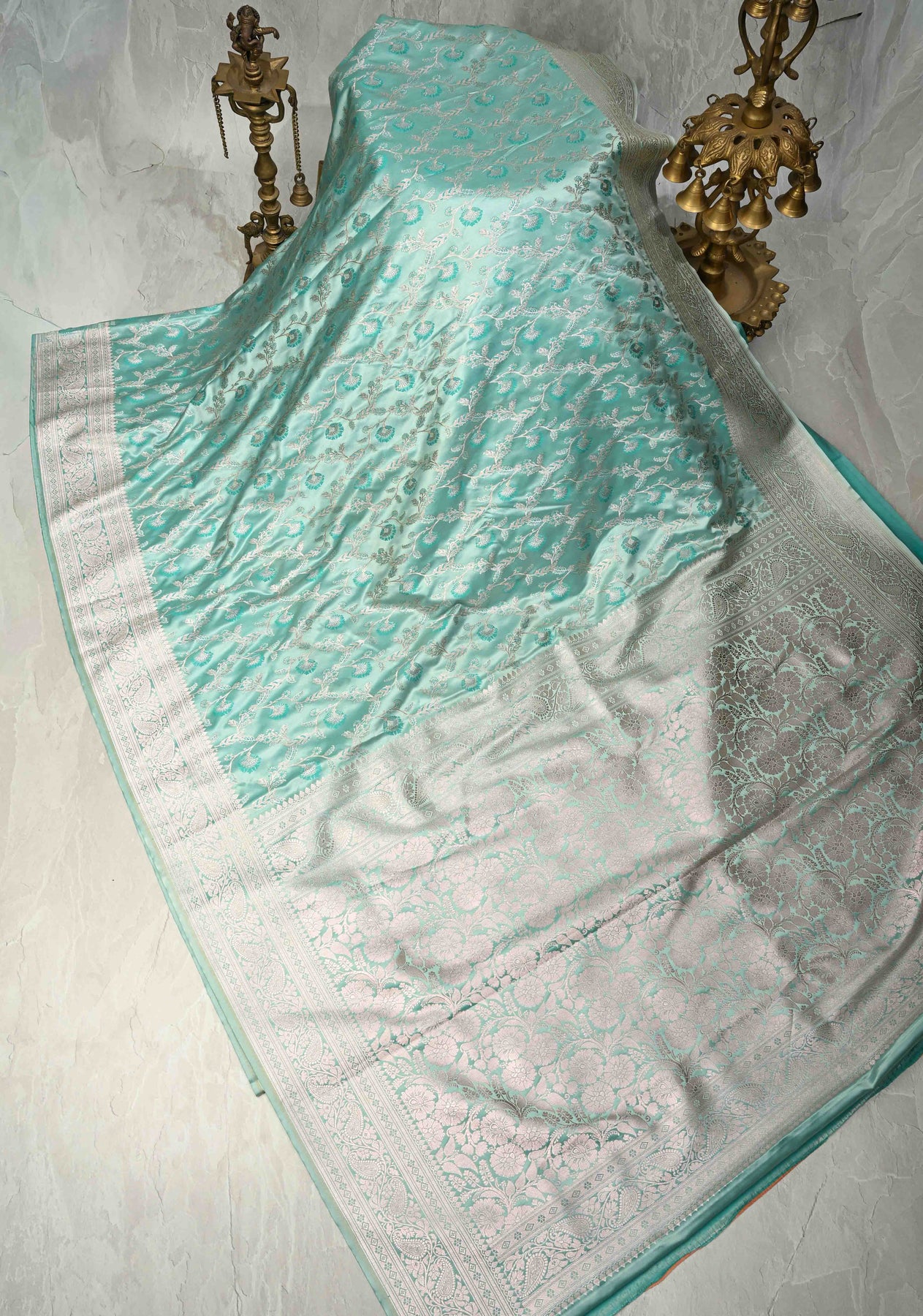 This pale teal Banarasi semi Mashru silk saree exudes understated elegance and timeless charm. The body is adorned with intricate Meenakari floral jaal work, adding delicate artistry and a subtle pop of color. A rich zari border frames the saree, enhancing its traditional appeal and giving it a luxurious finish. Crafted from a semi Mashru silk blend, it offers a soft, comfortable drape with a gentle sheen that catches the light beautifully. Perfect for weddings, festive occasions, and cultural celebrations, this saree combines classic Banarasi craftsmanship with contemporary grace.