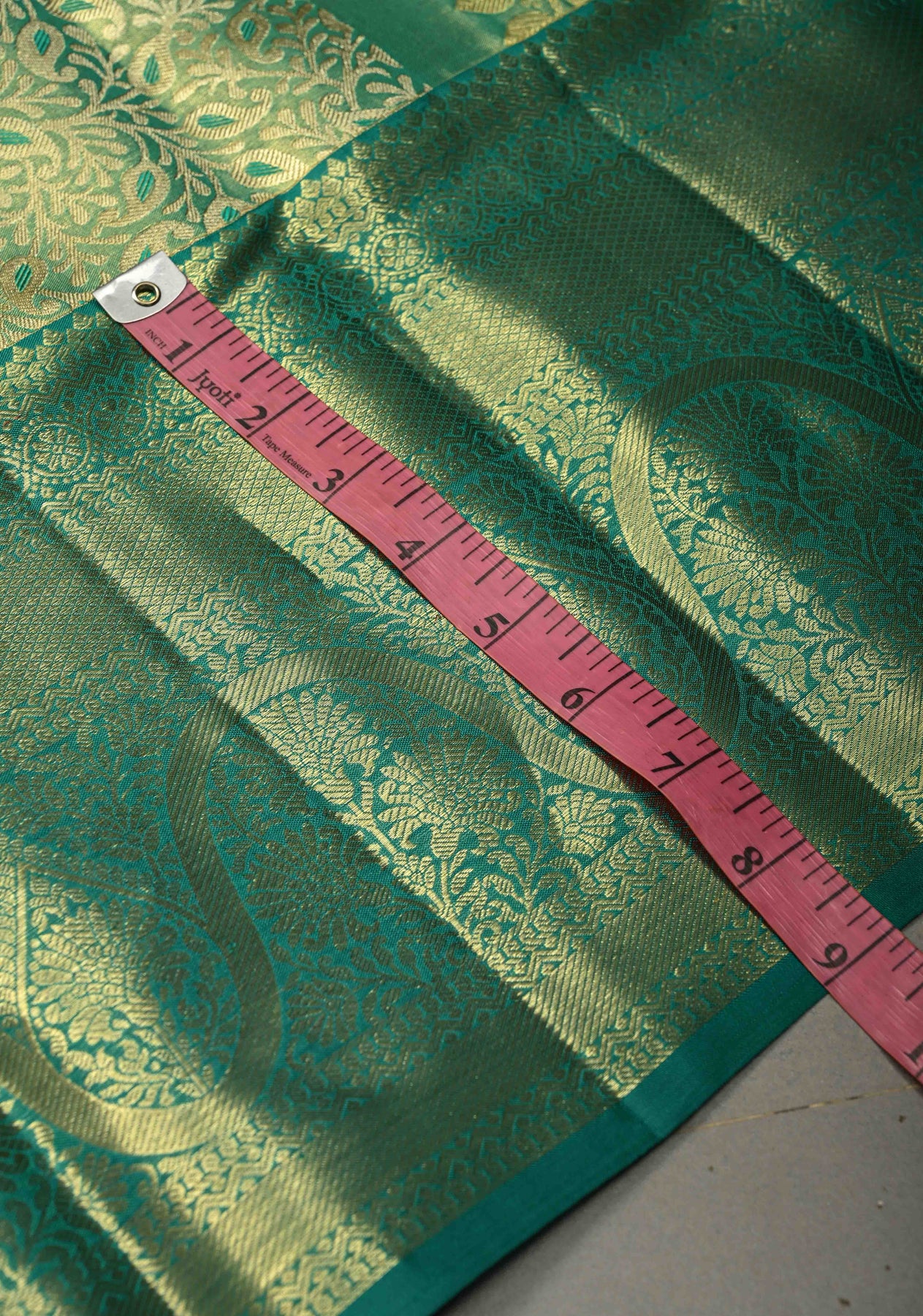 The body is adorned with an exquisite Meenakari floral brocade jaal, showcasing intricate detailing and vibrant accents that add depth and artistry. Finished with a zari border, the saree exudes timeless elegance and regal charm. Perfect for weddings, festive celebrations, temple ceremonies, and special occasions, this saree is a sophisticated heirloom piece.