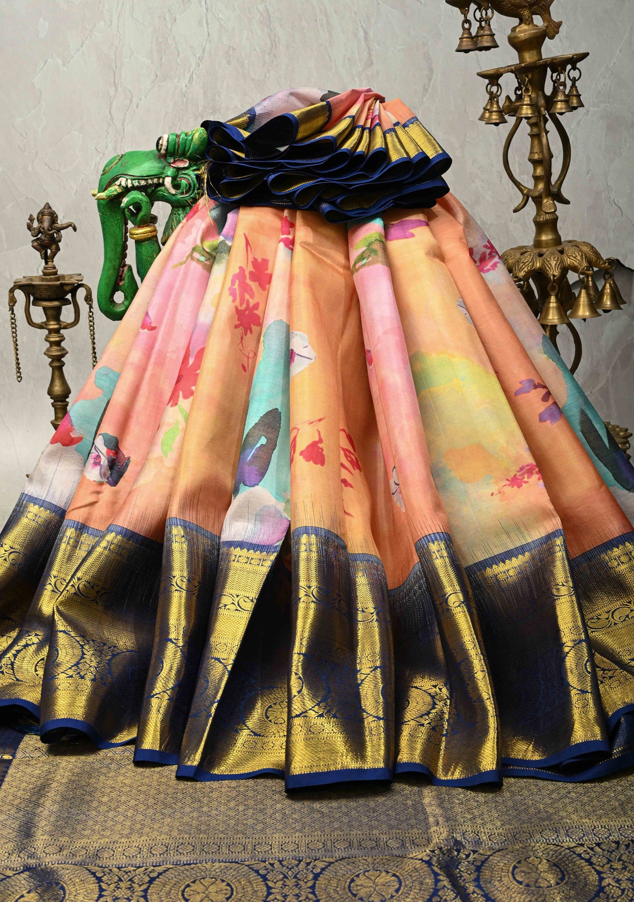 This pastel hued pure Kanjivaram silk saree exudes soft elegance and timeless charm. Crafted from Kanjivaram silk, it features delicate floral digital prints that add a graceful and contemporary appeal to the subtle color palette. The contrast wide zari border brings a touch of traditional grandeur, perfectly balancing the understated tones of the saree. Its smooth texture and natural sheen ensure a refined drape. Ideal for weddings, festive occasions, and elegant daytime celebrations, this saree reflects classic craftsmanship with a modern aesthetic.