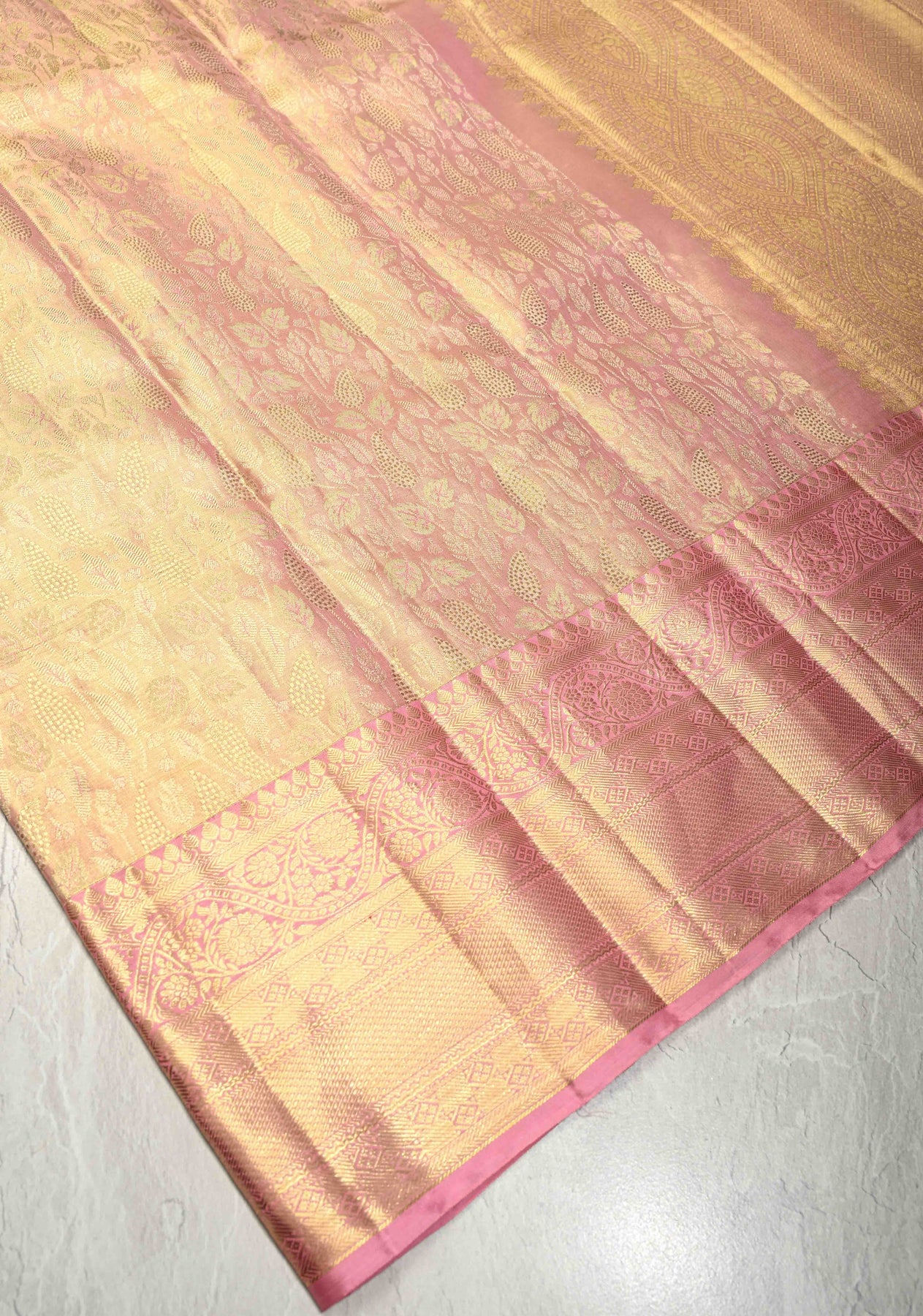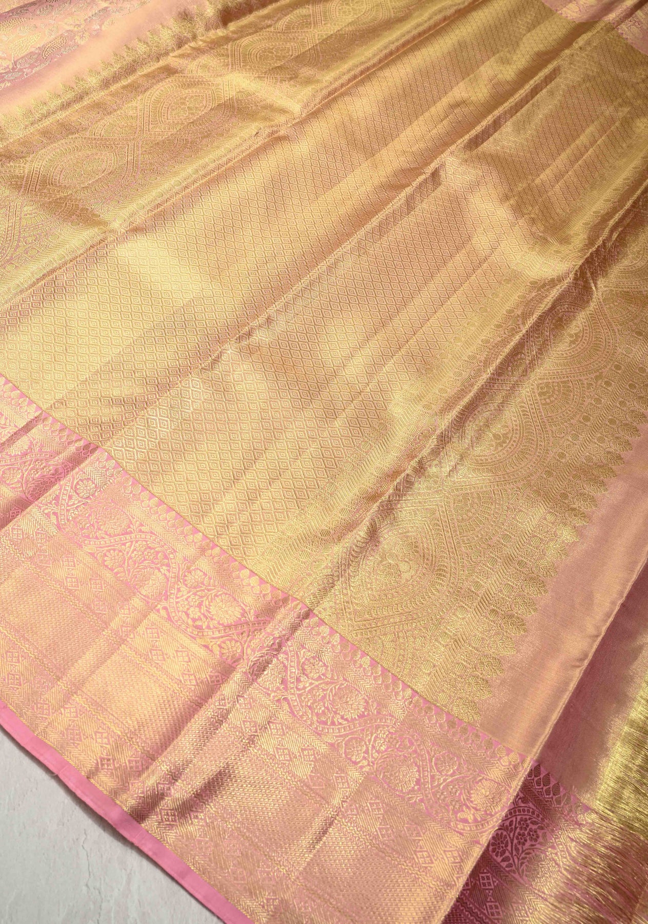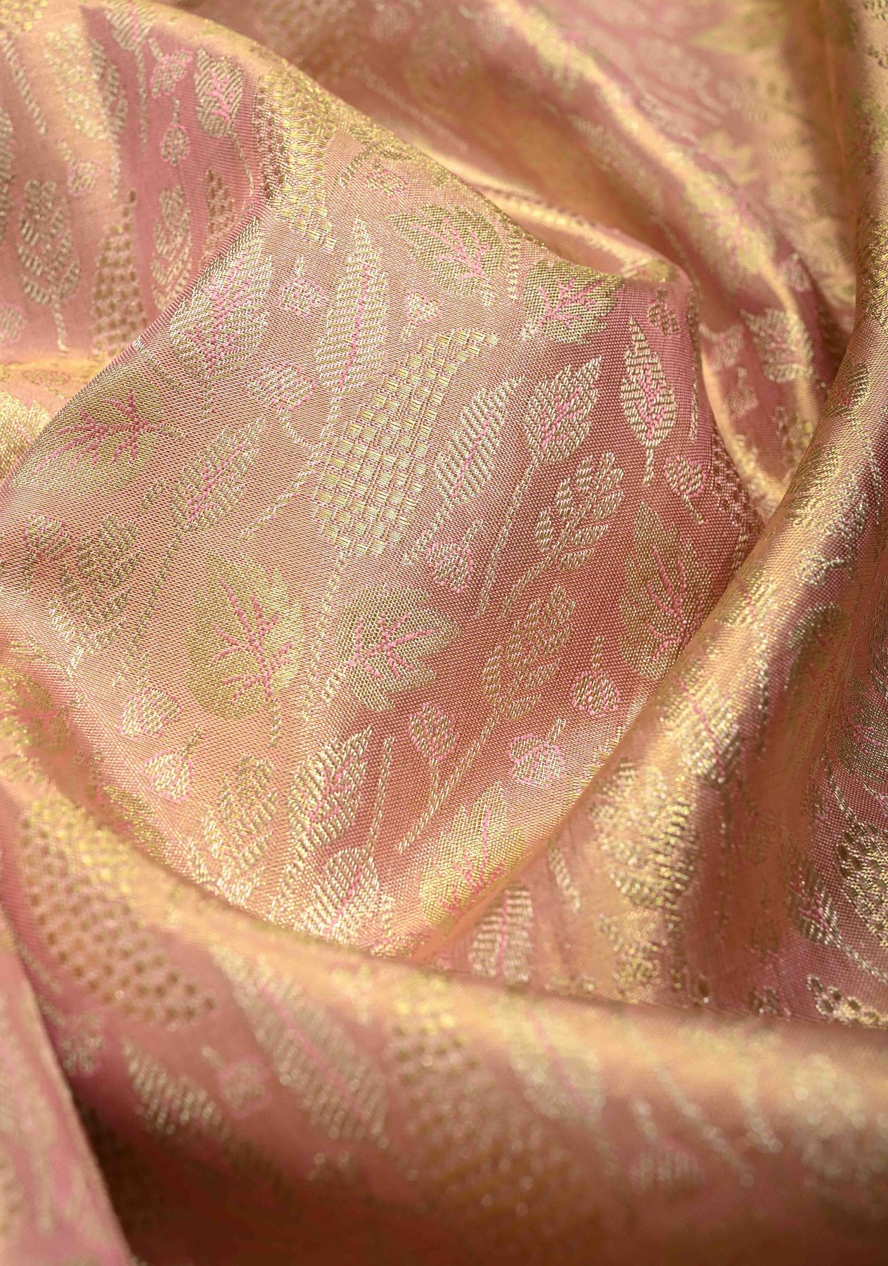 Elevate your traditional wardrobe with this Peach Pink Dual Tone Tissue Kanjivaram Pure Silk Saree, exquisitely woven to reflect timeless South Indian craftsmanship. Made from dual-tone tissue silk, it features delicate Meenakari brocade, adding intricate detail and subtle shimmer. The wide zari border enhances its regal appeal, making it ideal for weddings, festive occasions, and special celebrations. Lightweight and gracefully draped, this saree embodies elegance, sophistication, and heritage. Pair it with traditional jewelry for a complete, stunning look.