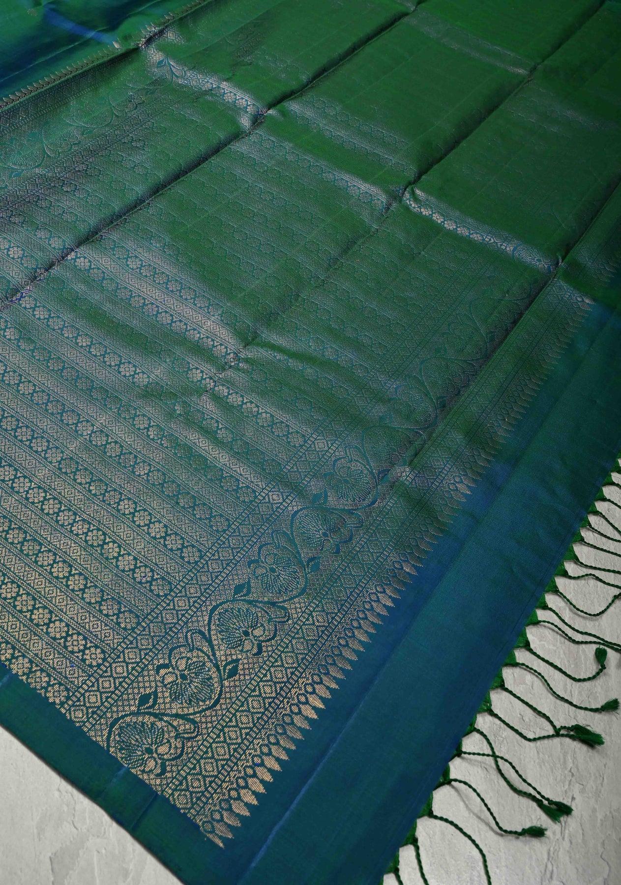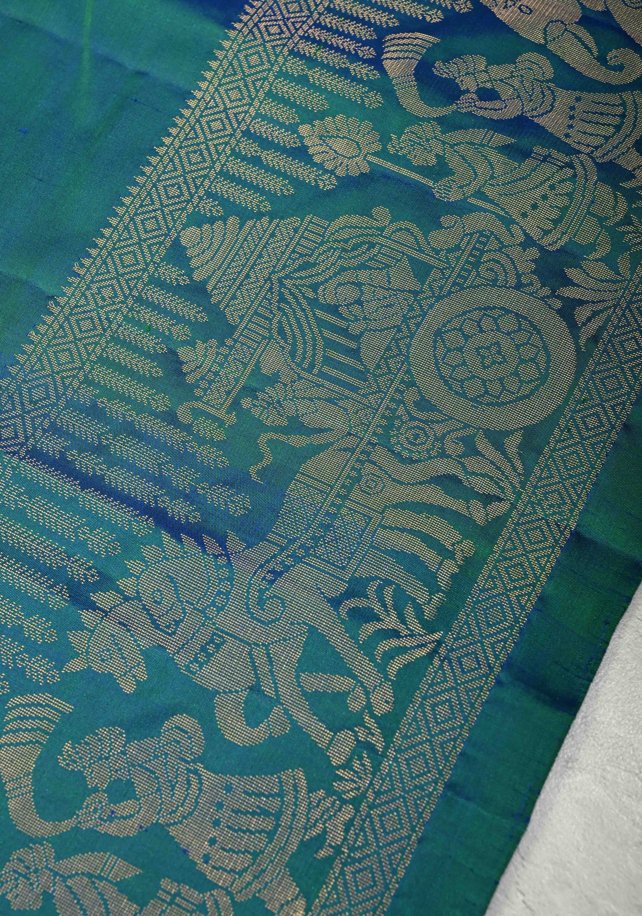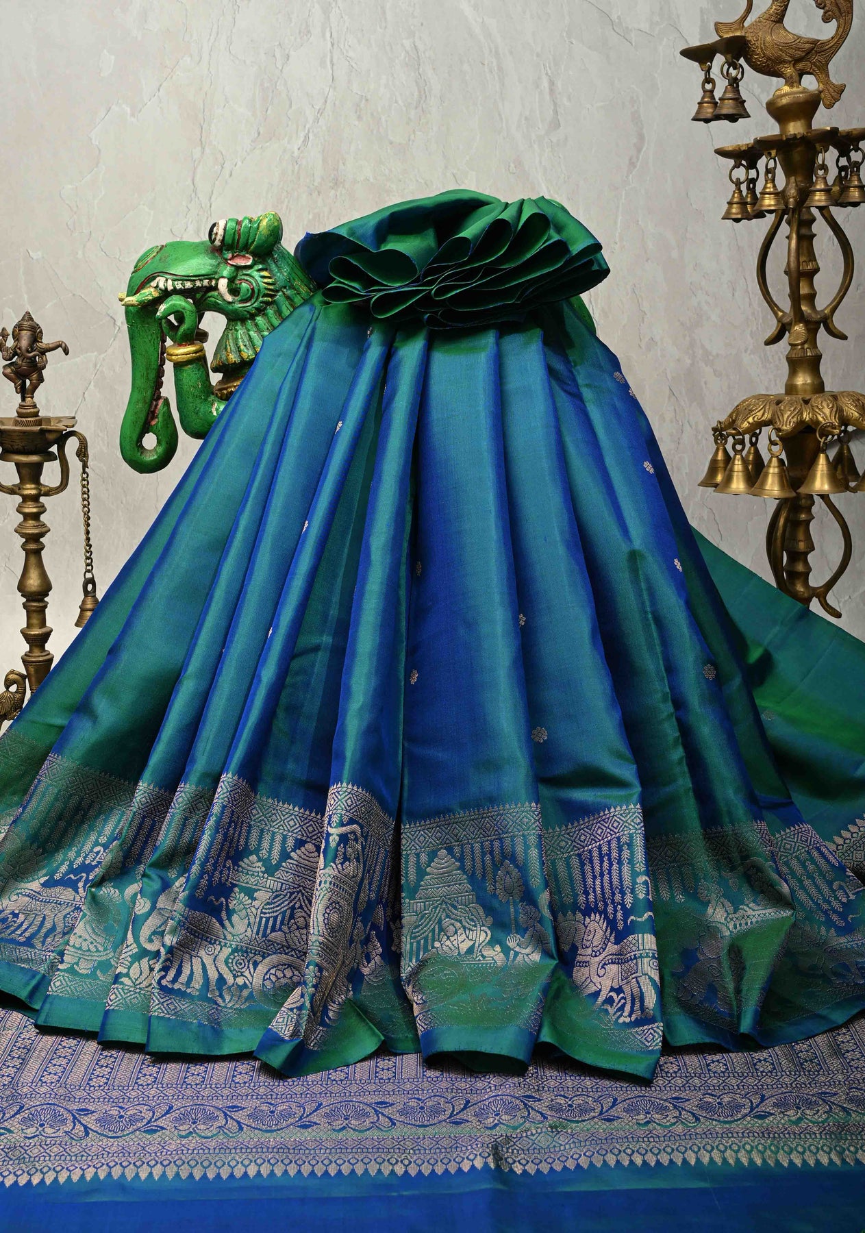 The rich dual-tone palette of peacock blue and green creates a captivating visual depth, making this saree an ideal choice for weddings, festive celebrations, cultural ceremonies, and special occasions. With its smooth drape, luminous sheen, and graceful structure, it offers both comfort and opulence. Pair it with gold or temple jewelry to complete a truly royal ensemble.