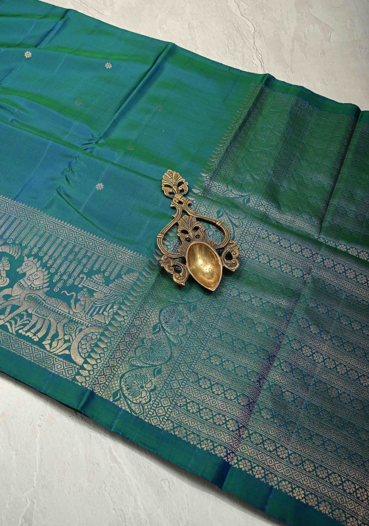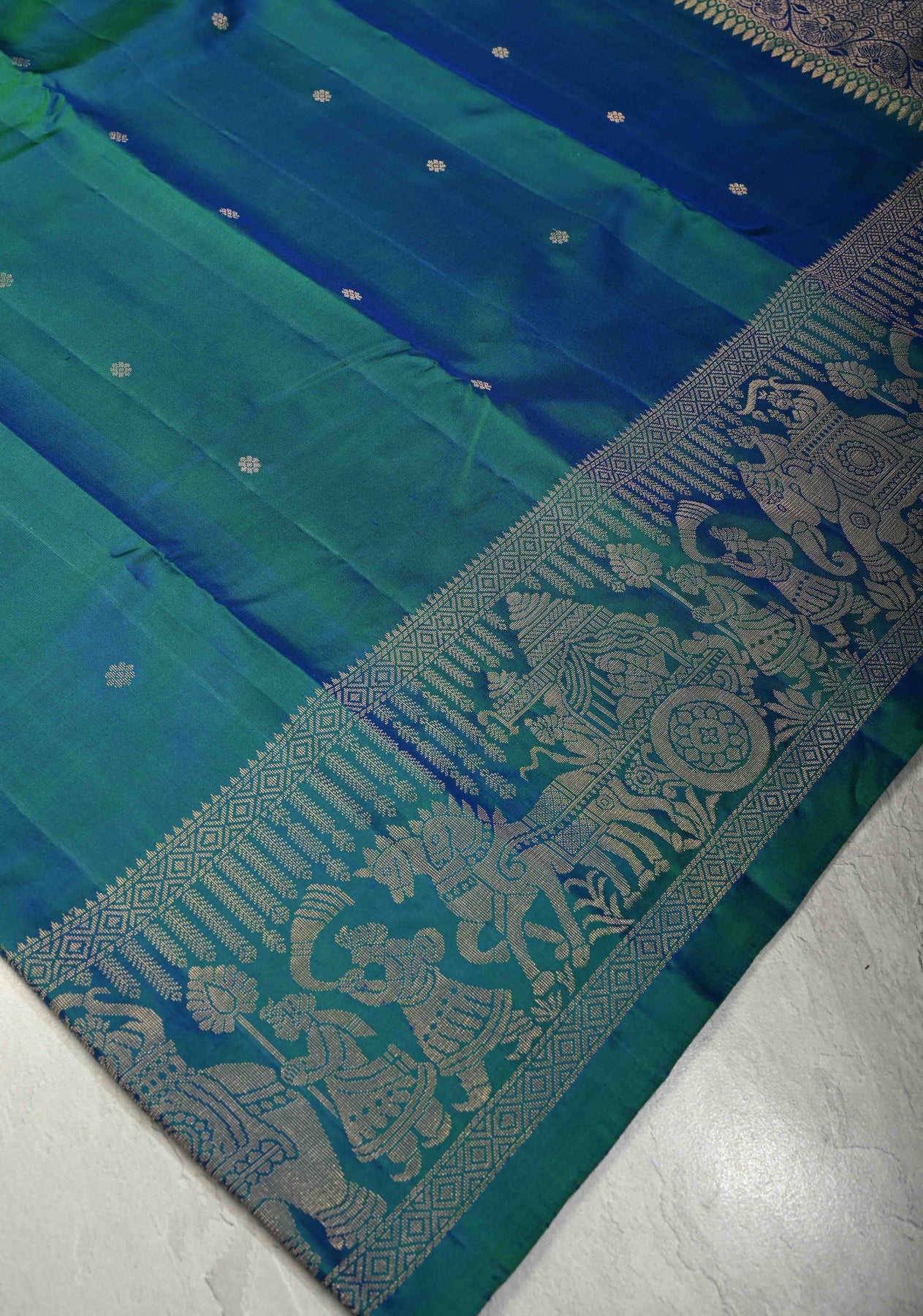The Peacock Blue-Green Dual Tone Kanjivaram Soft Silk Saree with Chunri Buttīs and Procession Zari Border is a striking blend of heritage artistry and regal elegance. Woven from Kanjivaram soft silk, this saree features delicate Chunri buttīs scattered across the body, adding refined texture and traditional charm. The highlight is its majestic procession-inspired zari border, depicting classic motifs that celebrate the grandeur of South Indian temple traditions.