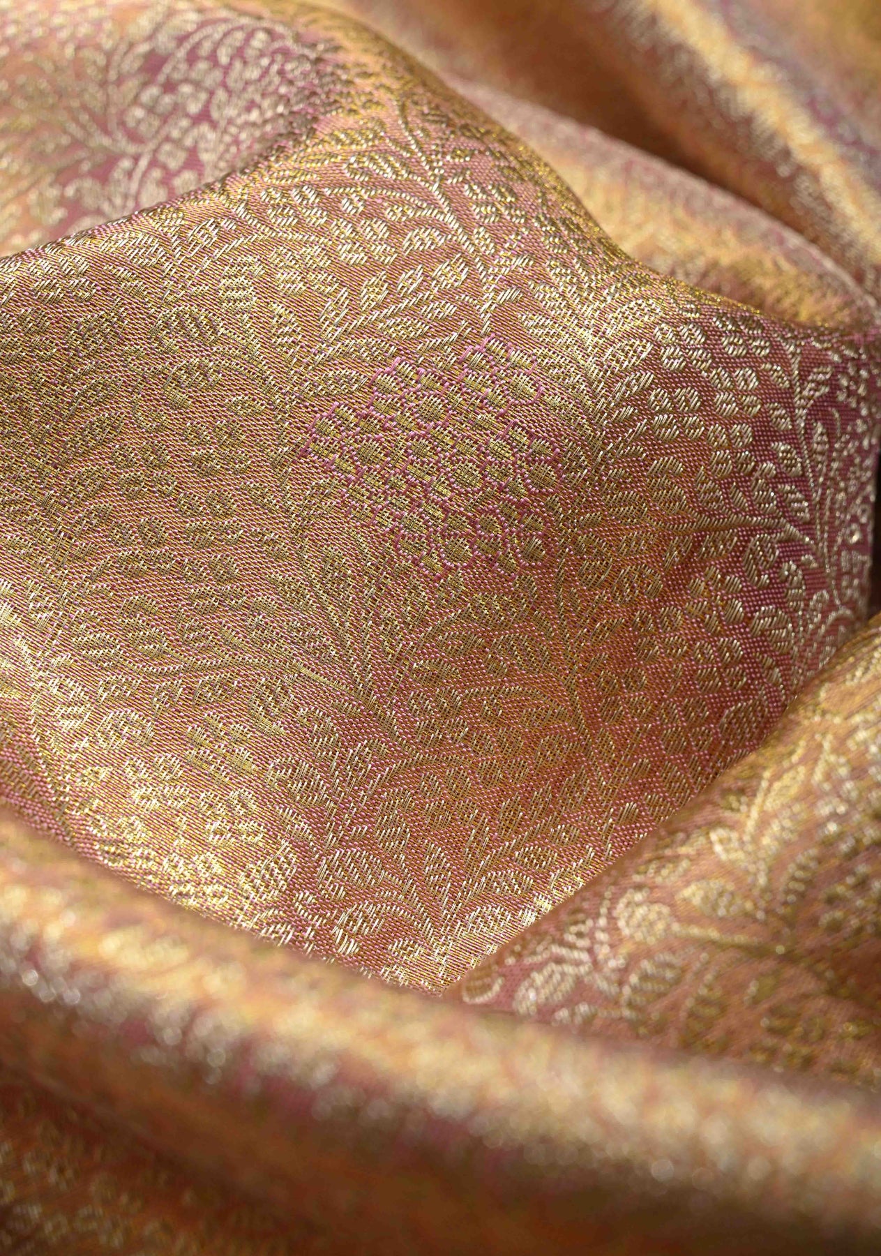 This Pink-Gold Tissue Kanjivaram Pure Silk Saree is a luminous blend of elegance and traditional grandeur. Woven from tissue Kanjivaram silk, it features an exquisite floral brocade jaal that adds depth and intricate beauty across the body. The subtle interplay of pink and gold tones gives the saree a rich, festive glow. A classic zari border enhances its regal appeal and completes the timeless look. Lightweight yet opulent, it drapes gracefully, making it perfect for weddings and grand celebrations. The meticulous craftsmanship reflects the heritage artistry of Kanjivaram weaving. A stunning statement piece for those who love refined luxury with traditional charm.