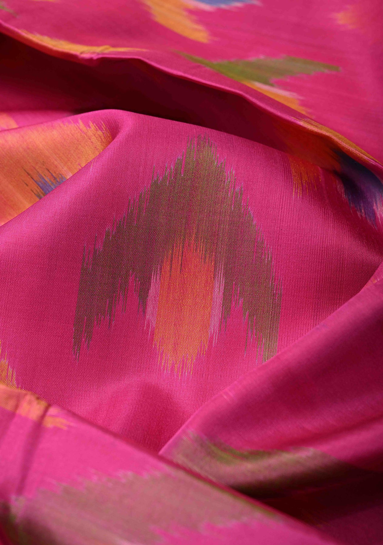 Celebrate the vibrant heritage of Telangana with our Pink Handloom Pure Soft Silk Pochampally Ikkat Saree. This masterpiece showcases the precision of the ancient tie-dye technique, featuring intricate birds motifs that dance across the buttery-soft silk. The design is elevated by a majestic panel zari border, blending traditional geometry with natural artistry. Lightweight and easy to drape, this saree is an ideal choice for festivities, offering a perfect fusion of ethnic charm and contemporary luxury.