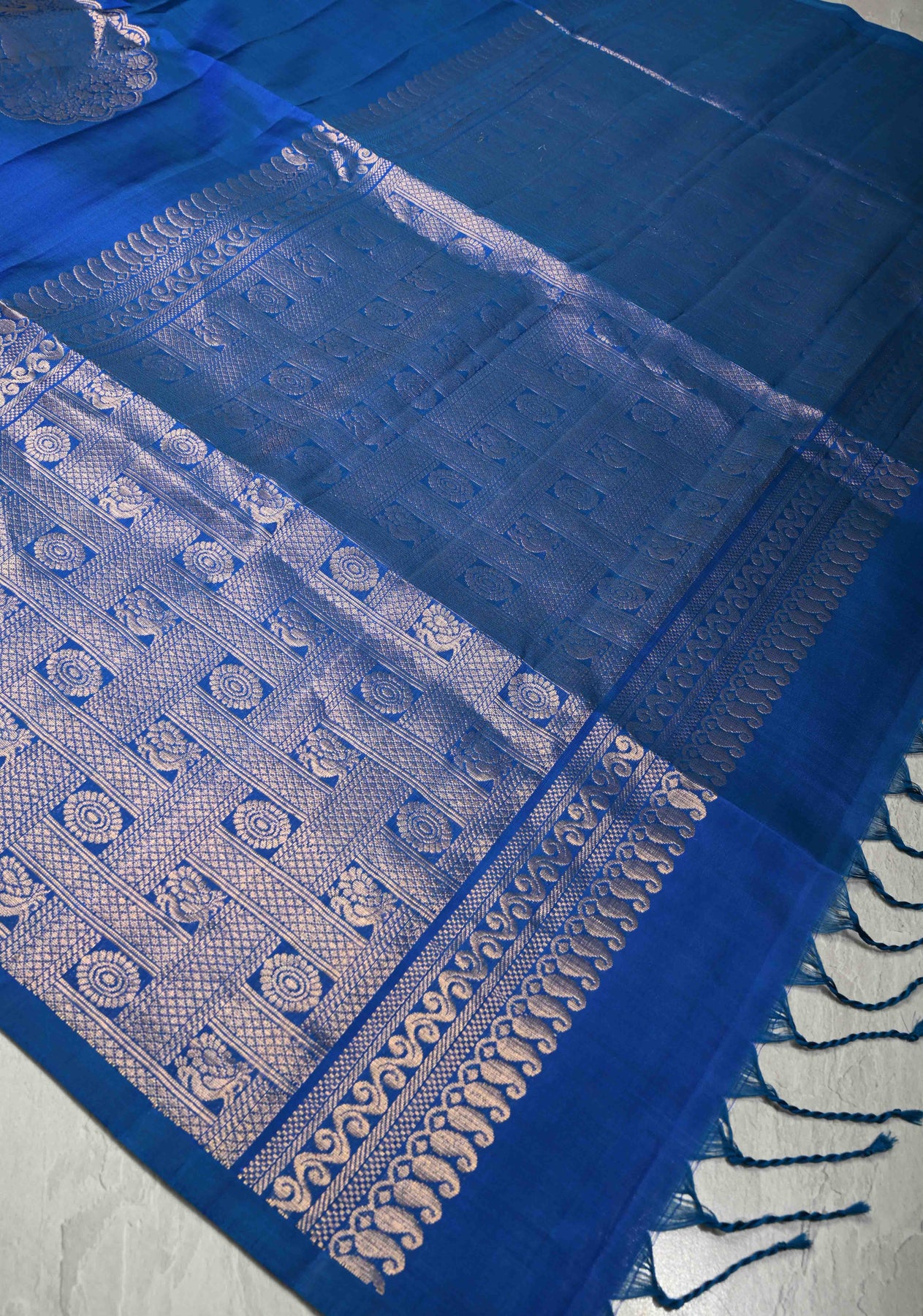 The majestic royal blue dual-tone palette exudes sophistication and grandeur, making this saree perfect for weddings, festive celebrations, cultural ceremonies, and special occasions. With its smooth drape, luminous sheen, and lightweight comfort, it ensures effortless elegance. Pair it with antique gold or statement jewelry for a refined and royal traditional look.