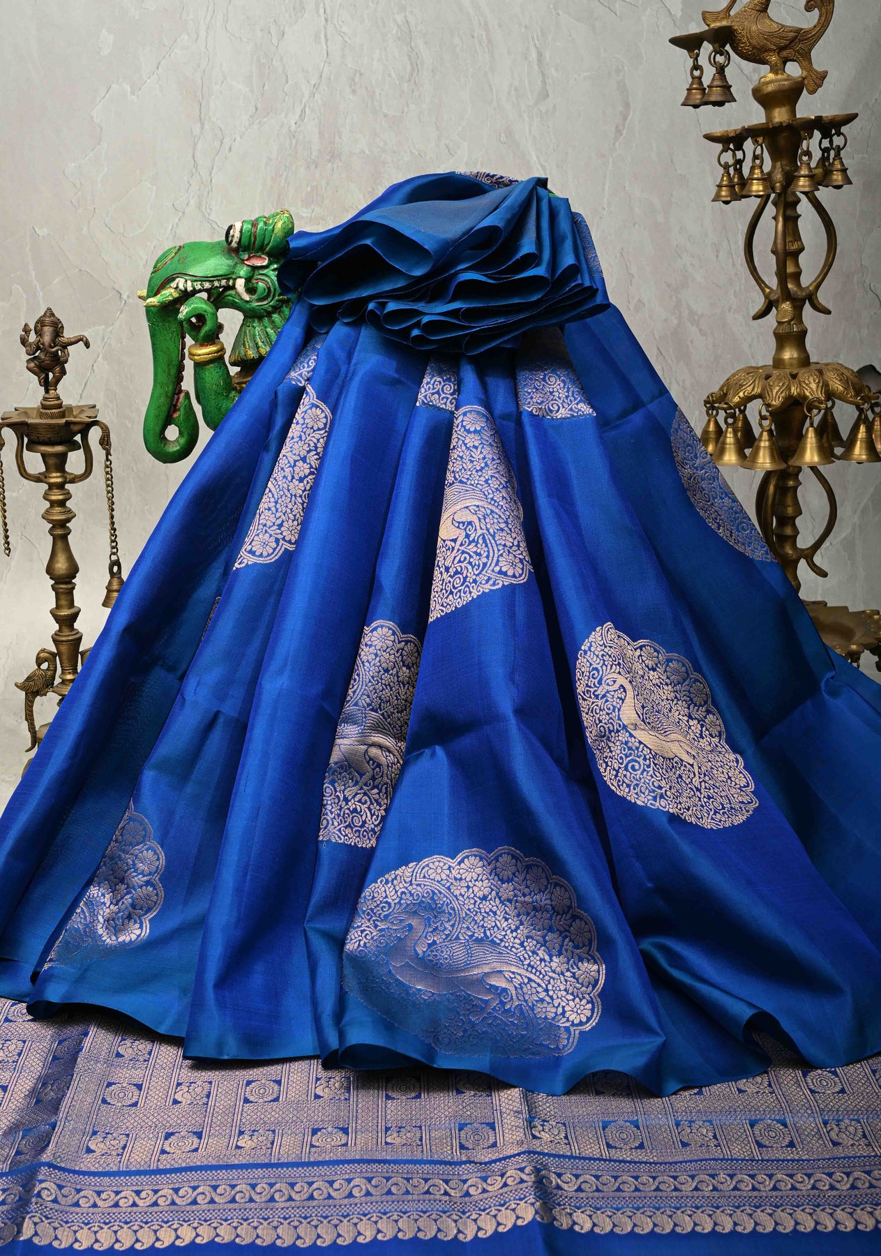 The Royal Blue Dual Tone Borderless Kanjivaram Soft Silk Saree with Peacock Motifs is a striking blend of regal tradition and modern elegance. Crafted from luxurious Kanjivaram soft silk, this saree features beautifully woven peacock motifs across the body, symbolizing grace, beauty, and timeless heritage. The borderless design adds a contemporary, minimalist touch, allowing the rich dual-tone weave and intricate motifs to shine.