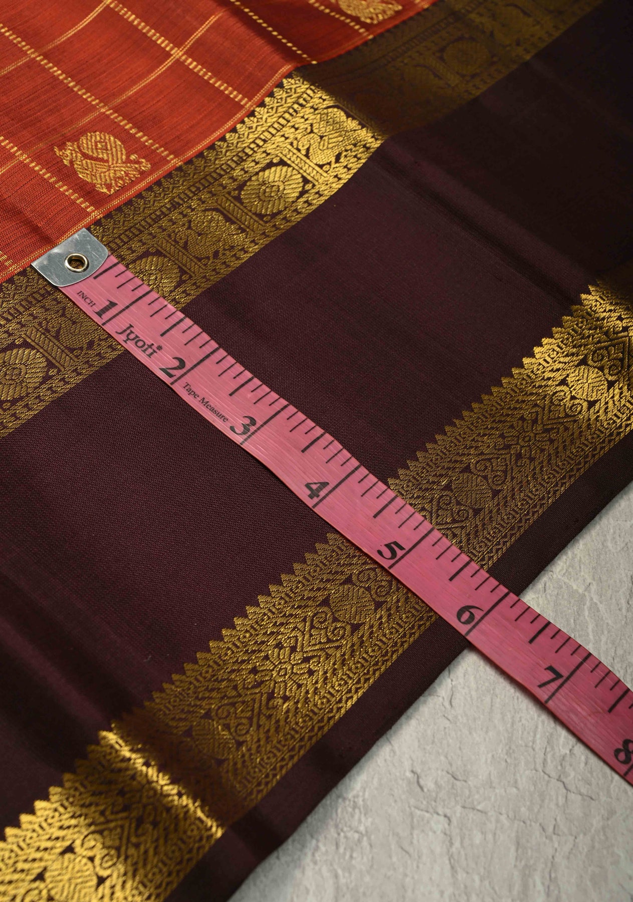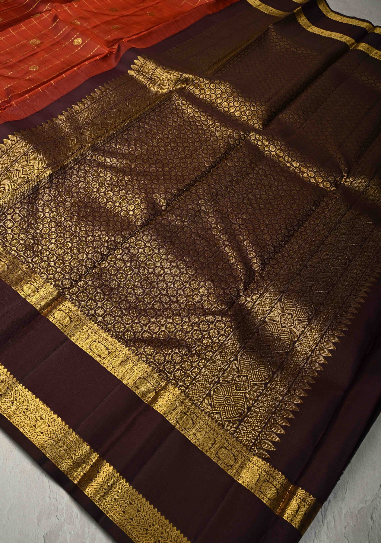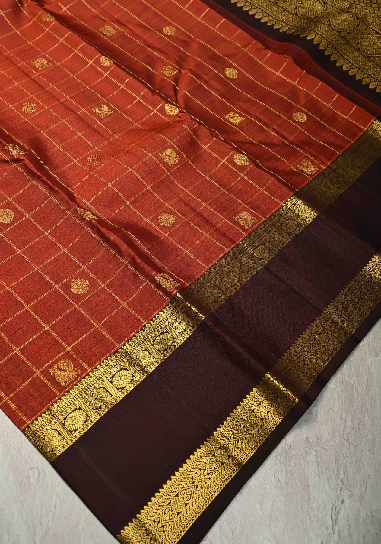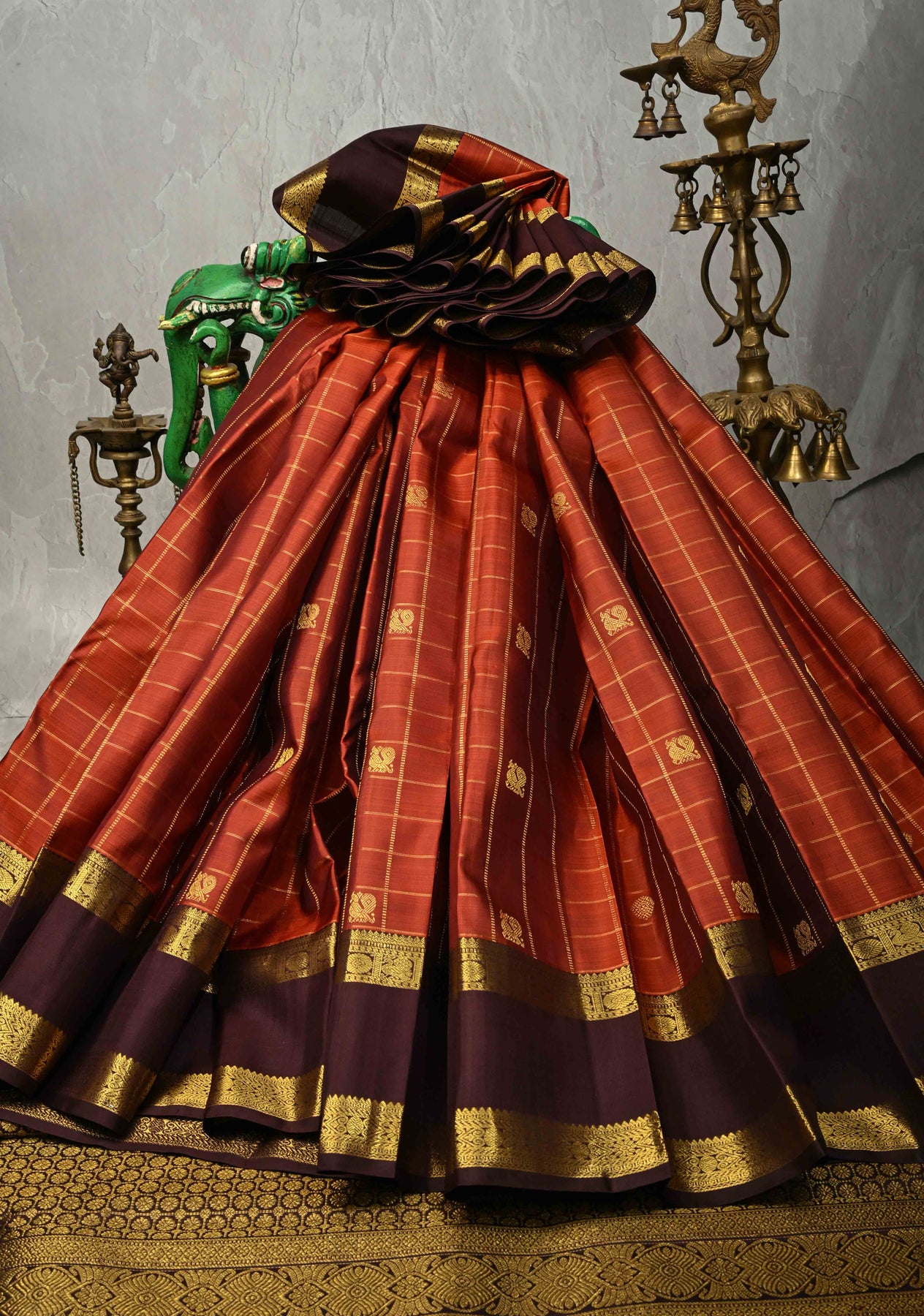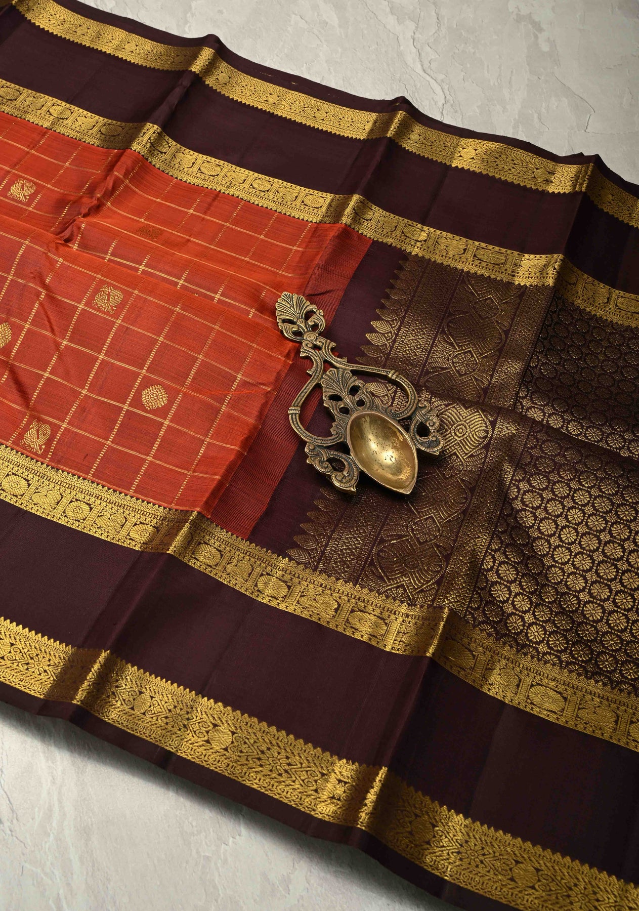 Rust Orange Zari Checks on Kanjivaram Pure Silk Saree with Zari Buttas and Rettaipet Border Zari Border | SILK MARK CERTIFIED