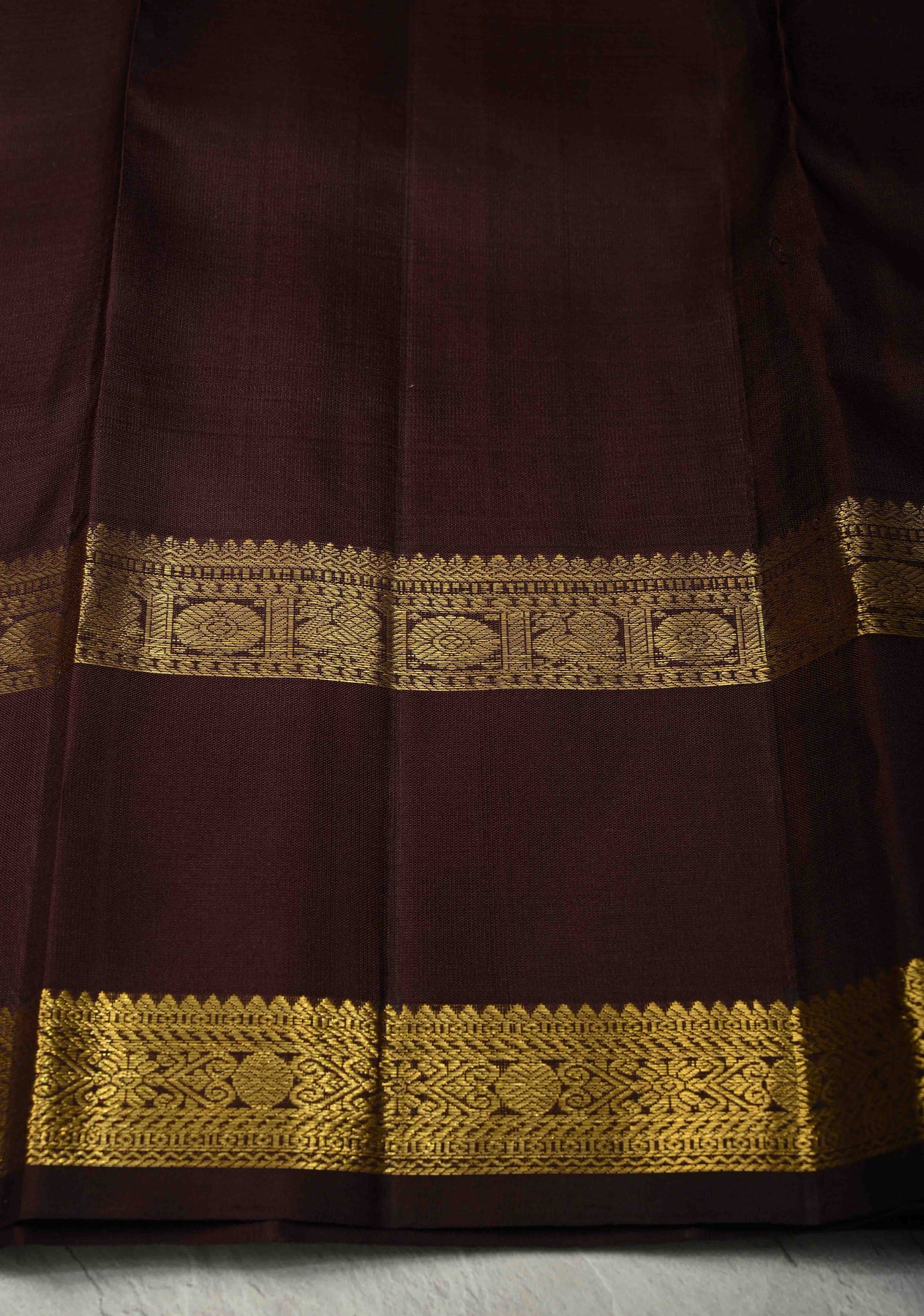 The Rust Orange Zari Checks Kanjivaram Pure Silk Saree is a beautiful blend of traditional geometry and timeless South Indian craftsmanship. Woven from pure Kanjivaram silk, this saree features zari check patterns that add structure and texture to the vibrant rust orange base. The body is accented with delicate zari buttas, lending a subtle, elegant shimmer. A traditional Rettaipet zari border completes the design, adding heritage charm and architectural elegance. Perfect for weddings, festive occasions, and temple ceremonies, this saree is a refined celebration of tradition and luxury.
