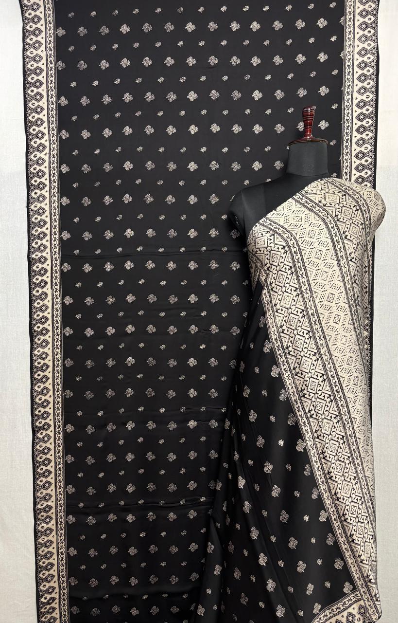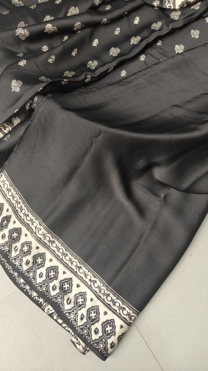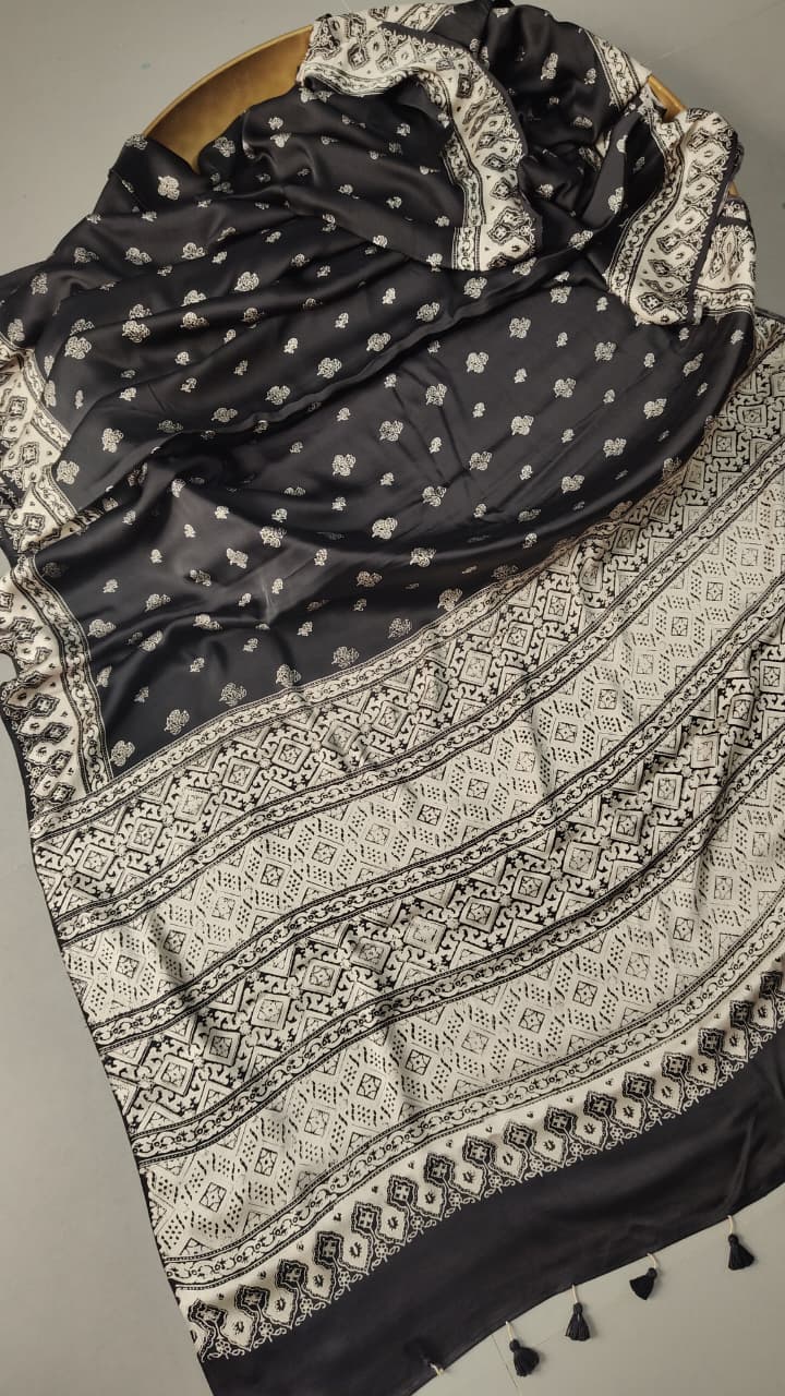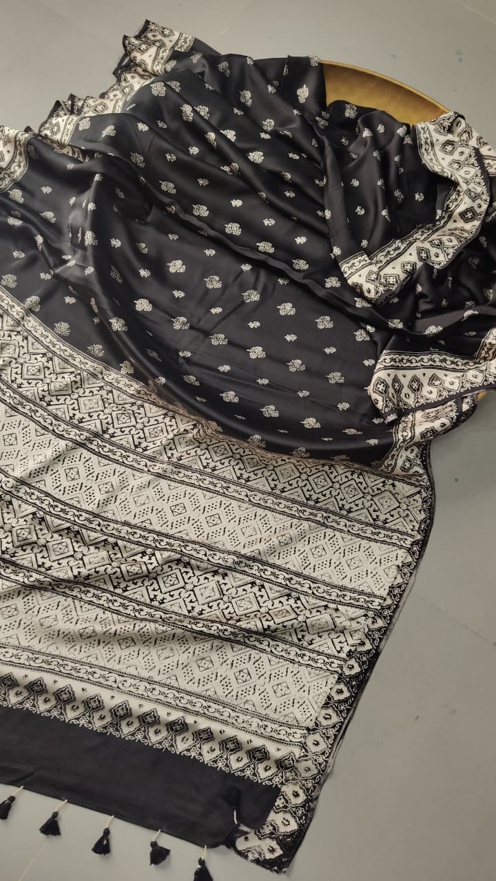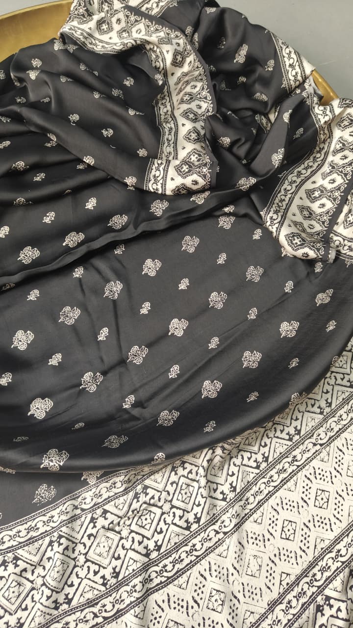 Make a bold style statement with this Black and White Authentic Ajrakh Hand Block Print Modal Silk Saree, a perfect blend of heritage craftsmanship and contemporary elegance. Crafted on luxurious modal silk, the saree features intricate Ajrakh hand block prints with finely detailed geometric motifs across the body, beautifully complemented by a striking contrast border. The soft, fluid drape of modal silk adds comfort and grace, making it ideal for long wear. Perfect for workwear, cultural gatherings, or elegant daytime occasions, this saree celebrates timeless design with a modern monochrome appeal..