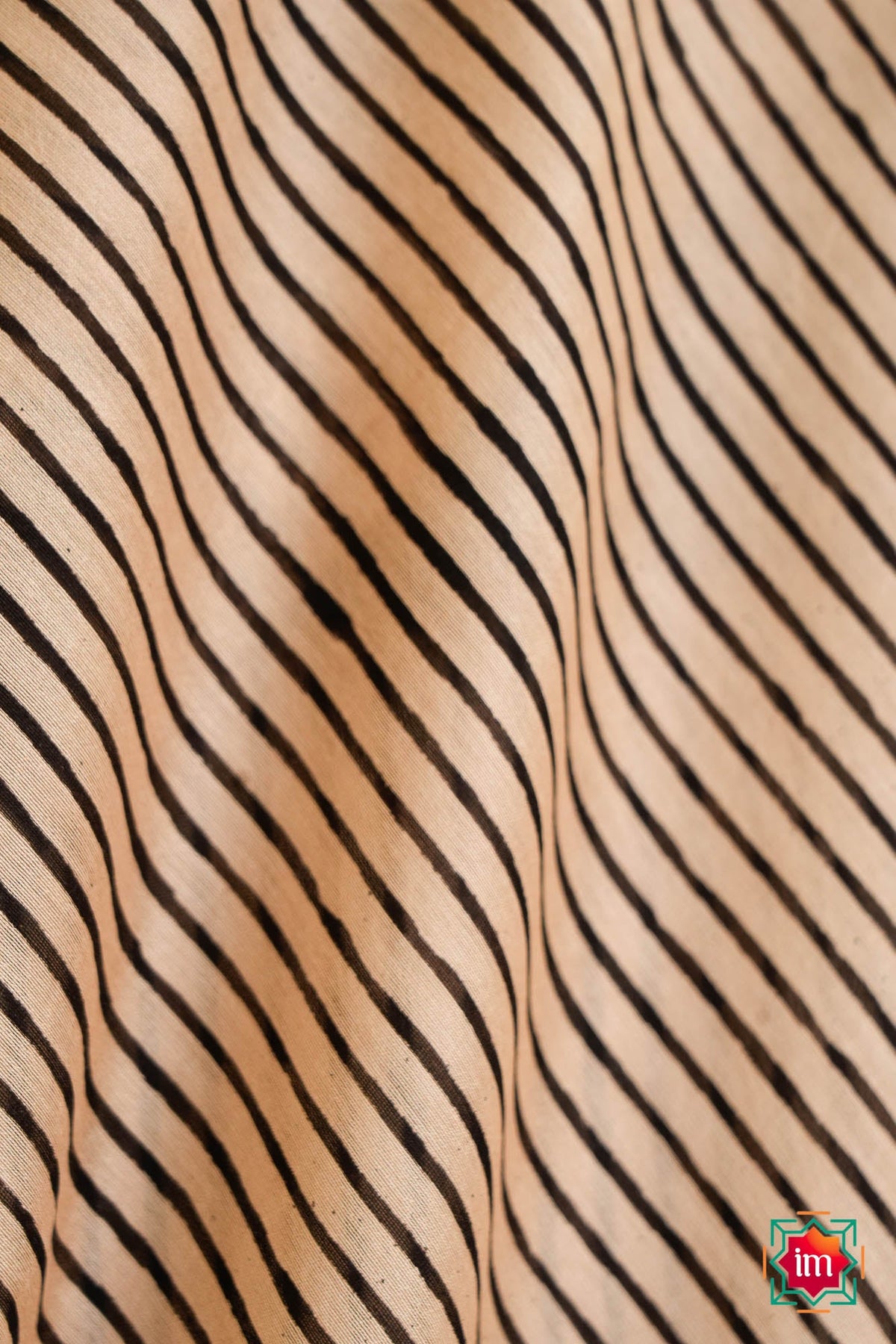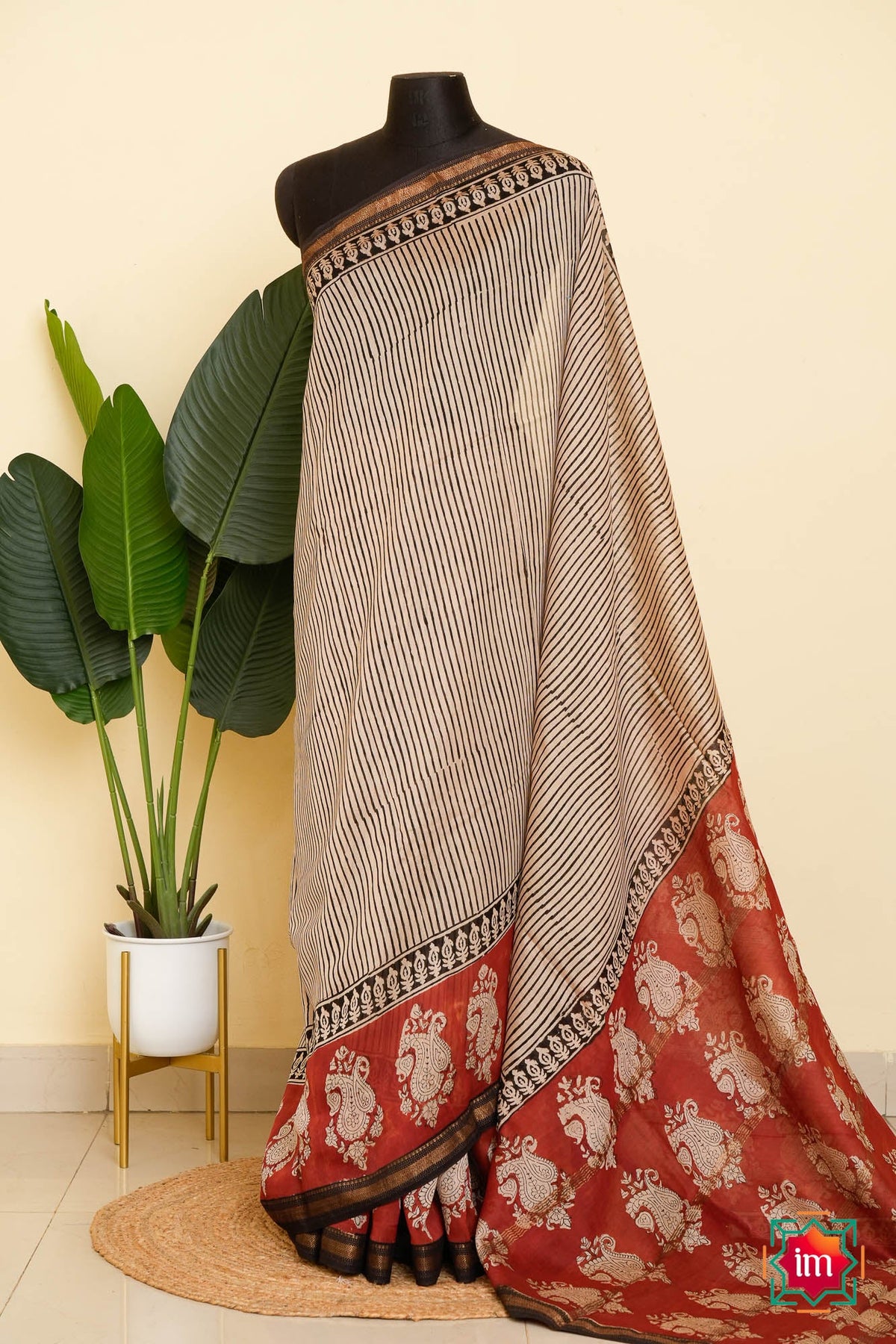 Crafted on a breathable Maheshwar silk cotton base, this saree carries the signature lightness and graceful fall that Maheshwar weaves are loved for. The elegant ivory body with fine black stripes creates a clean, work-wear friendly look, while the rich red paisley border and pallu bring in a bold handcrafted flourish.