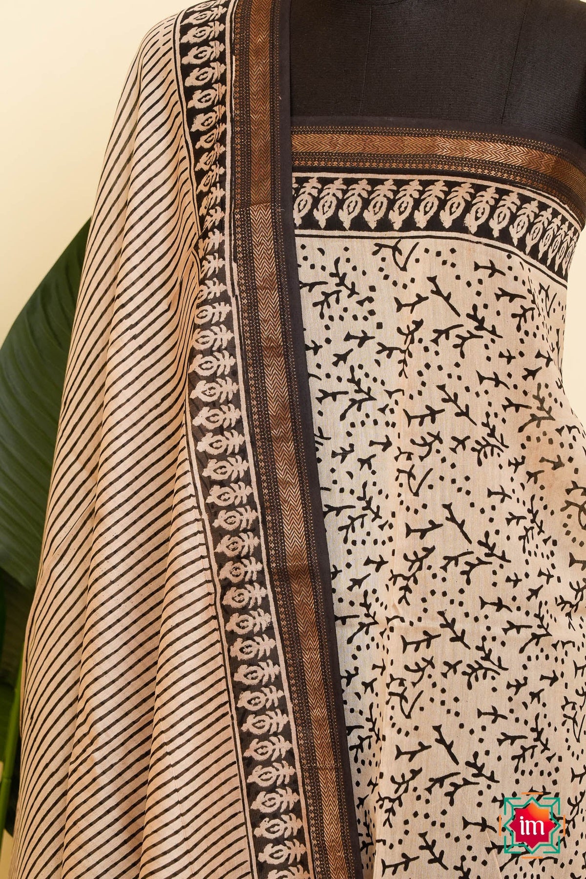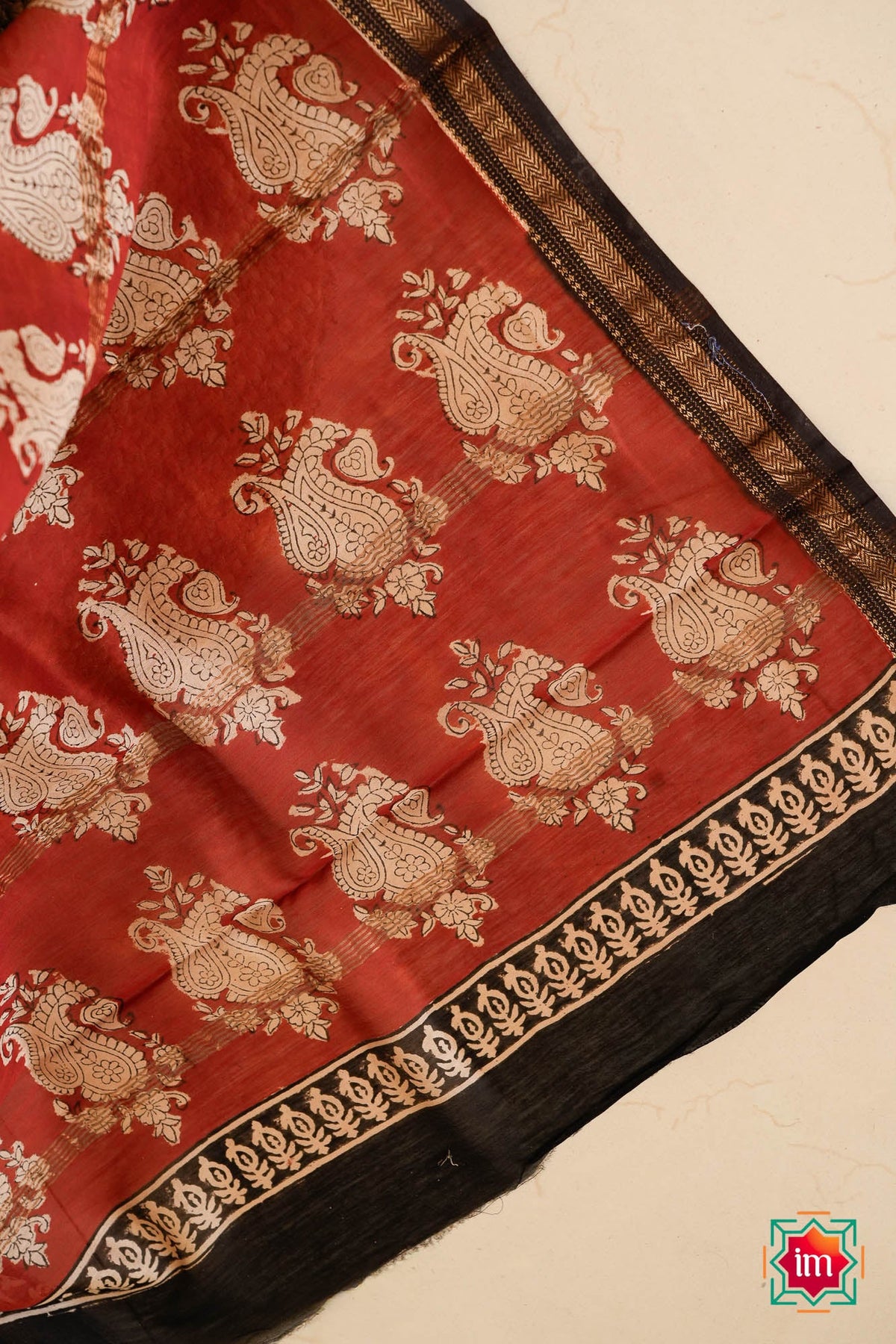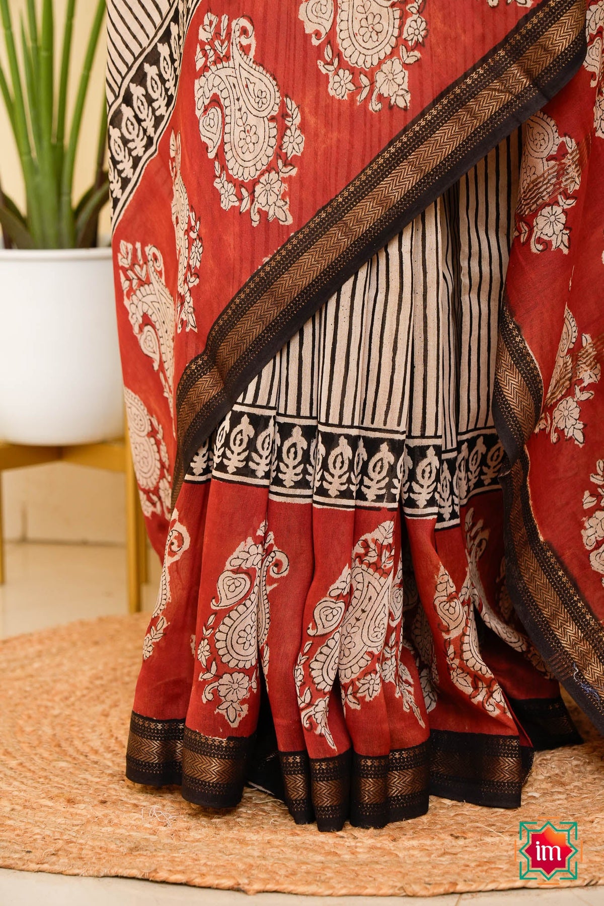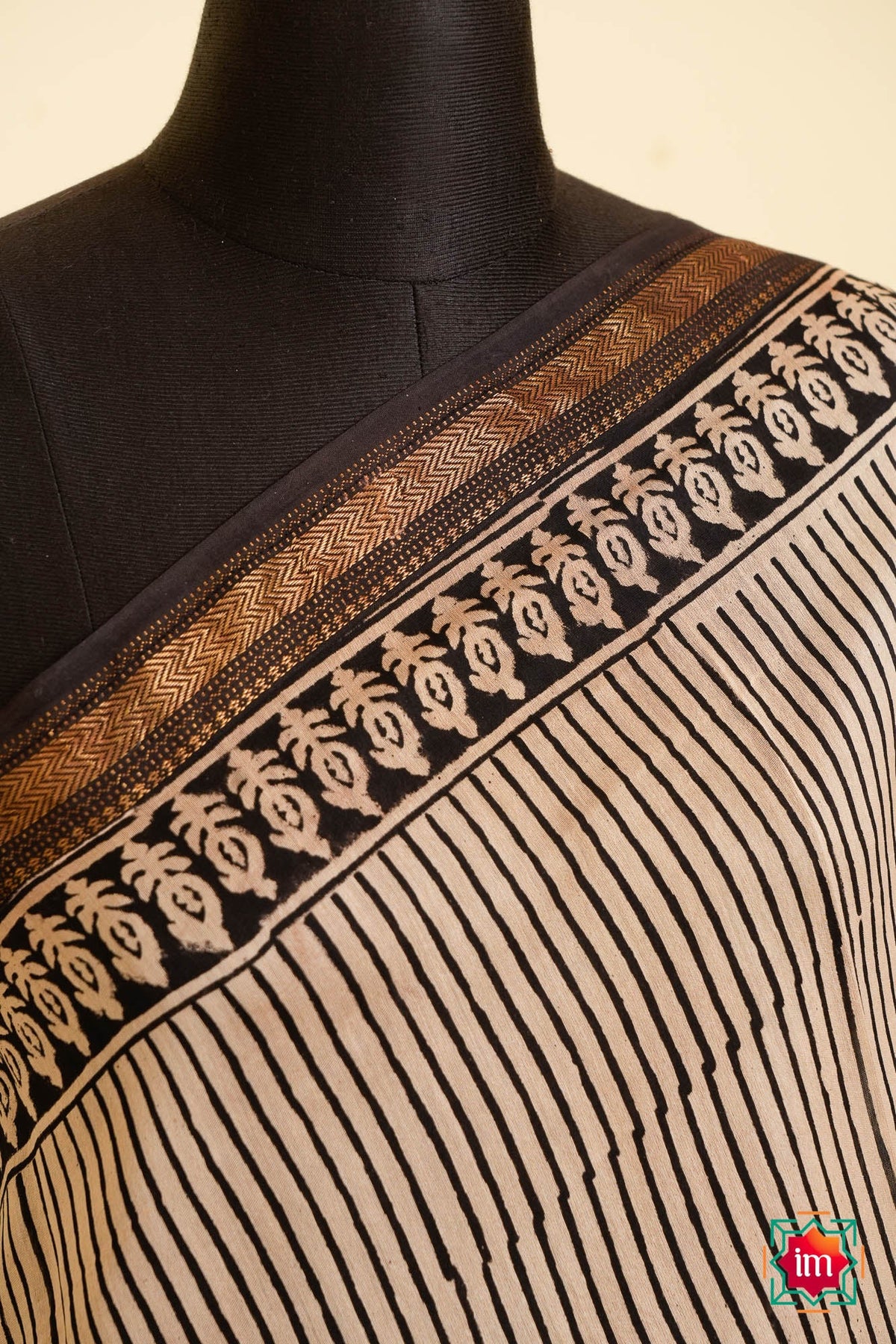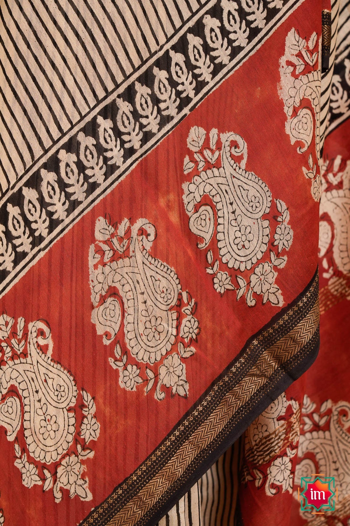 The motifs are handblock printed using natural dyes, creating earthy, living colours that age beautifully over time. Every paisley is gently stamped by hand, giving the saree its subtle variations and unmistakable handmade charm.