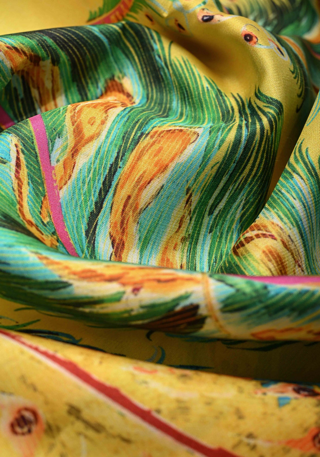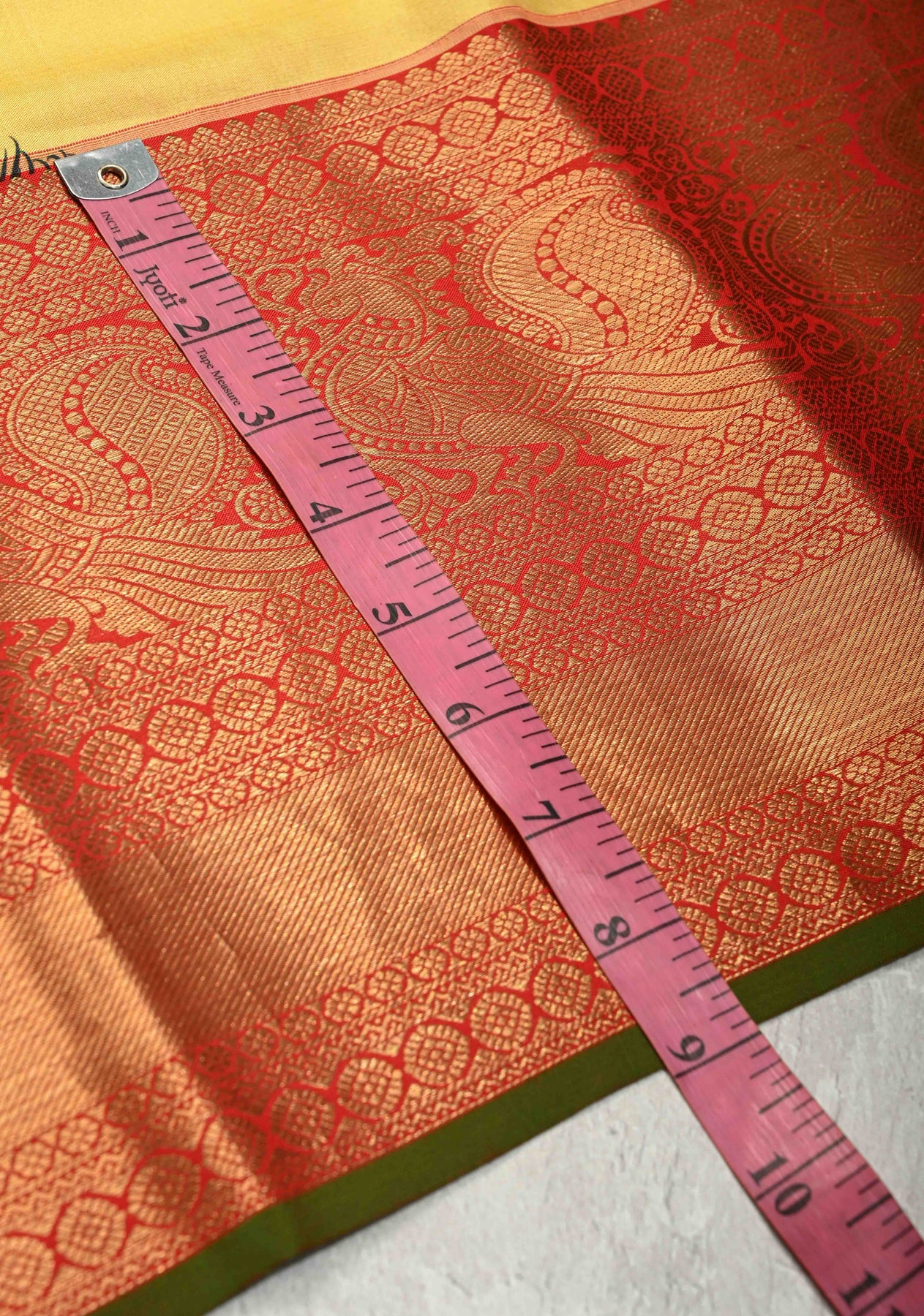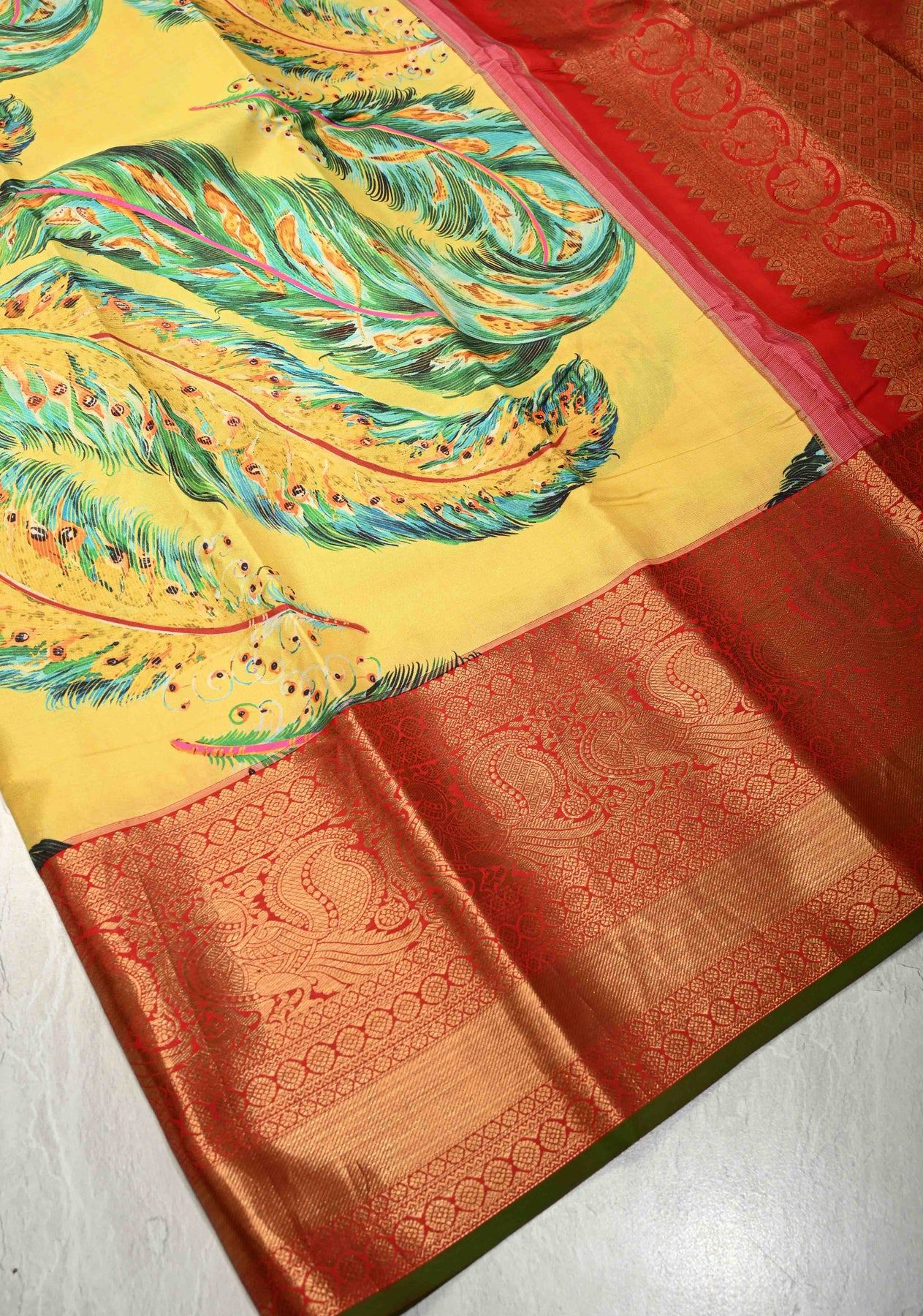 This yellow pure Kanjivaram silk saree radiates vibrant elegance and artistic charm. Crafted from Kanjivaram silk, it features abstract digital prints inspired by peacock feathers, adding a modern and graceful touch to the bright yellow base. The contrast zari border enhances the saree’s traditional richness, lending a refined and regal finish. With its smooth texture, natural sheen, and graceful drape, this saree is perfect for special occasions. Ideal for weddings, festive celebrations, and cultural events, it beautifully blends timeless craftsmanship with contemporary design.