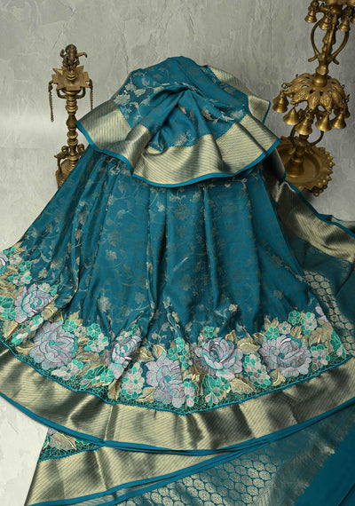 The lehenga saree brilliantly combines a lehenga's flared skirt with a saree's draped pallu. The skirt portion is structured like a lehenga, offering volume and grandeur, while the pallu drapes elegantly over one shoulder, maintaining the saree's characteristic grace.