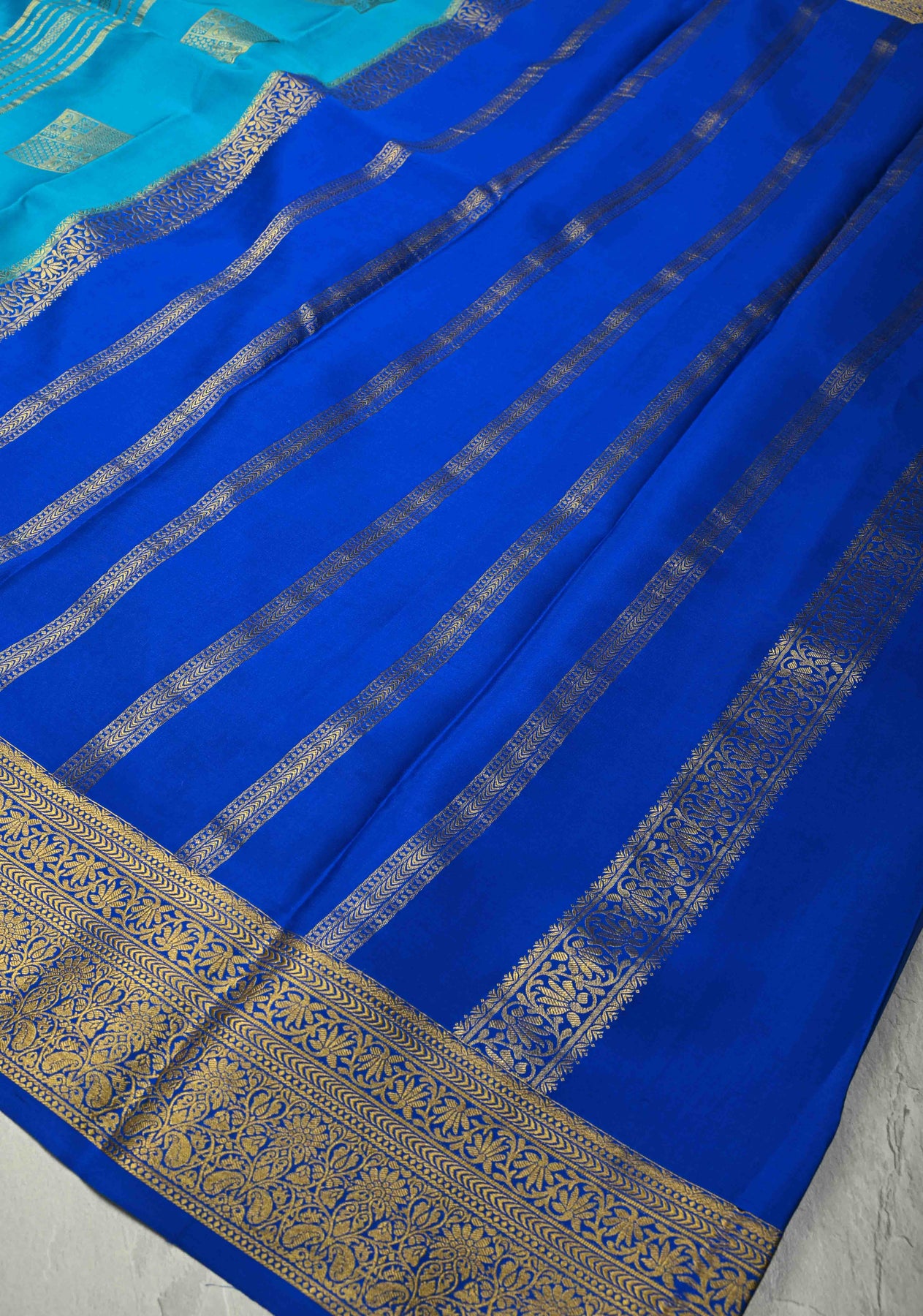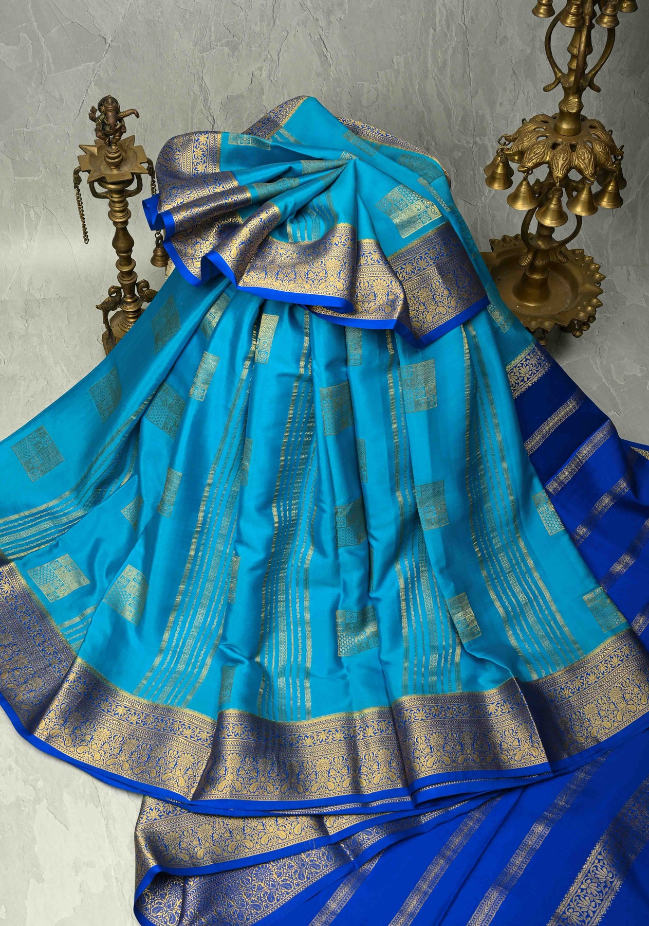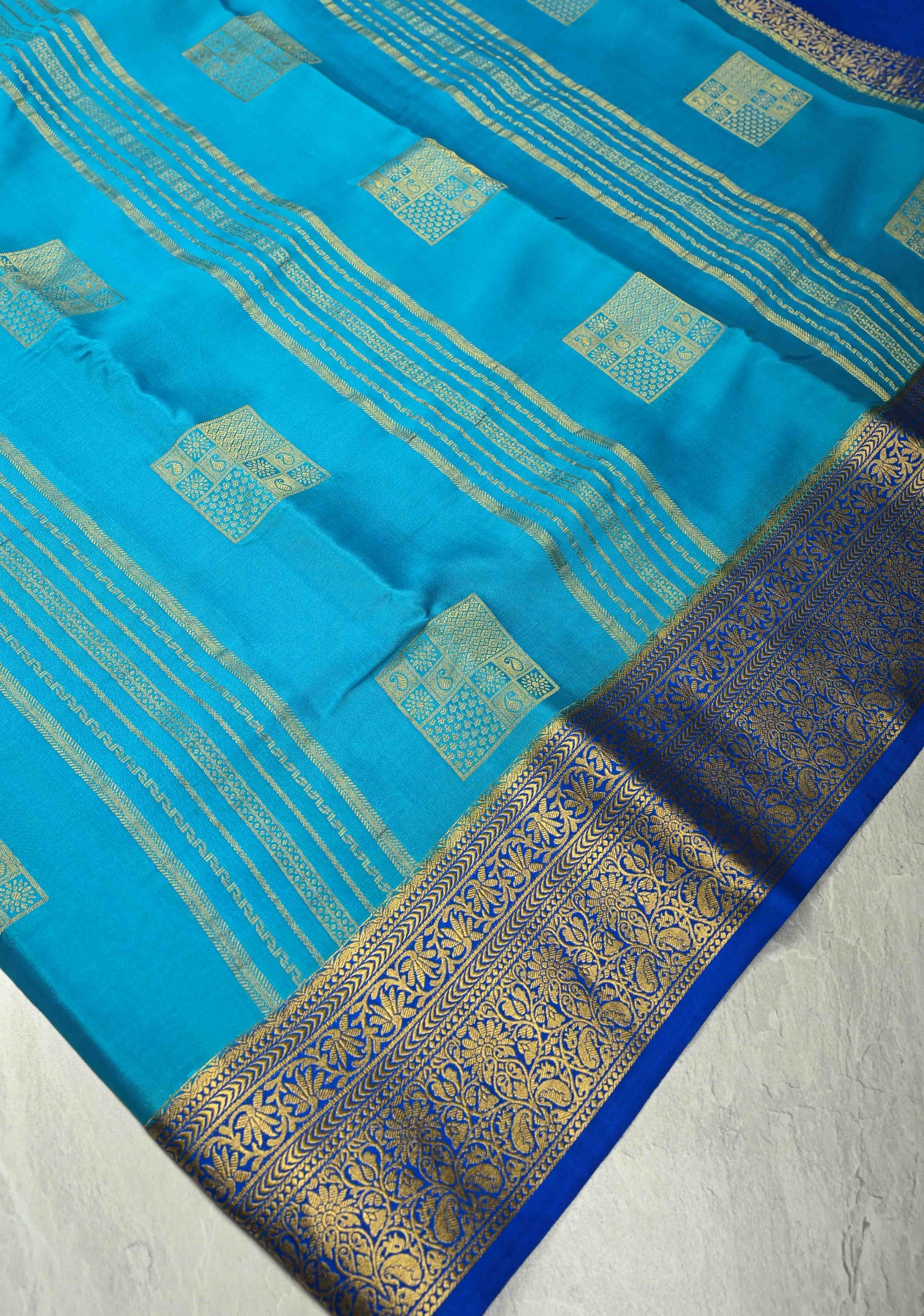 KSIC Grade Thickness Ananda Blue Zari Stripes on Mysore Silk Saree with Zari Buttas and Zari Border | SILK MARK CERTIFIED