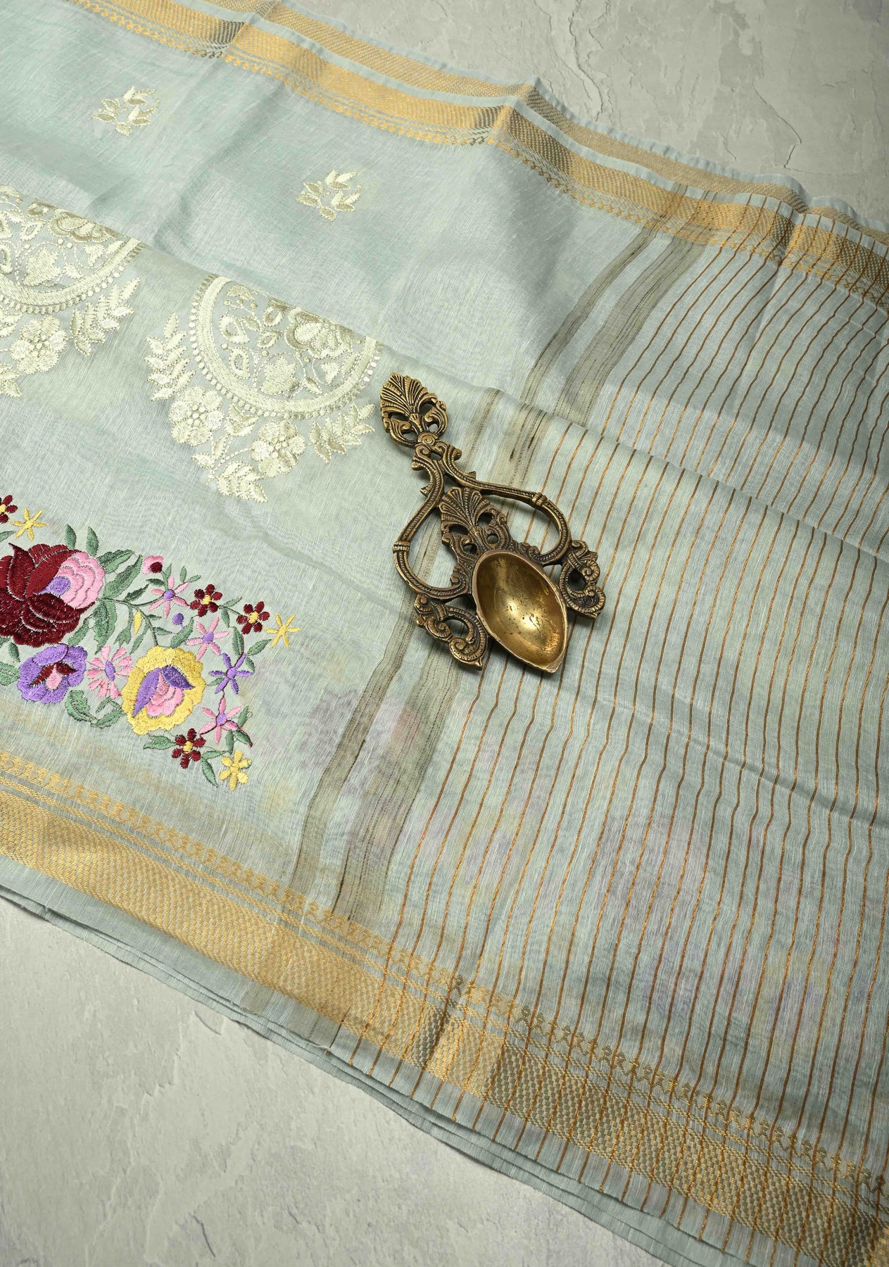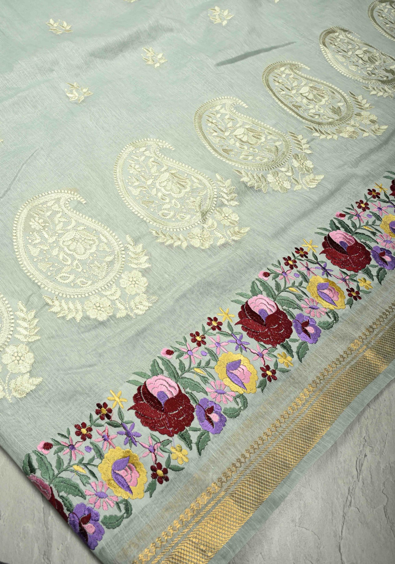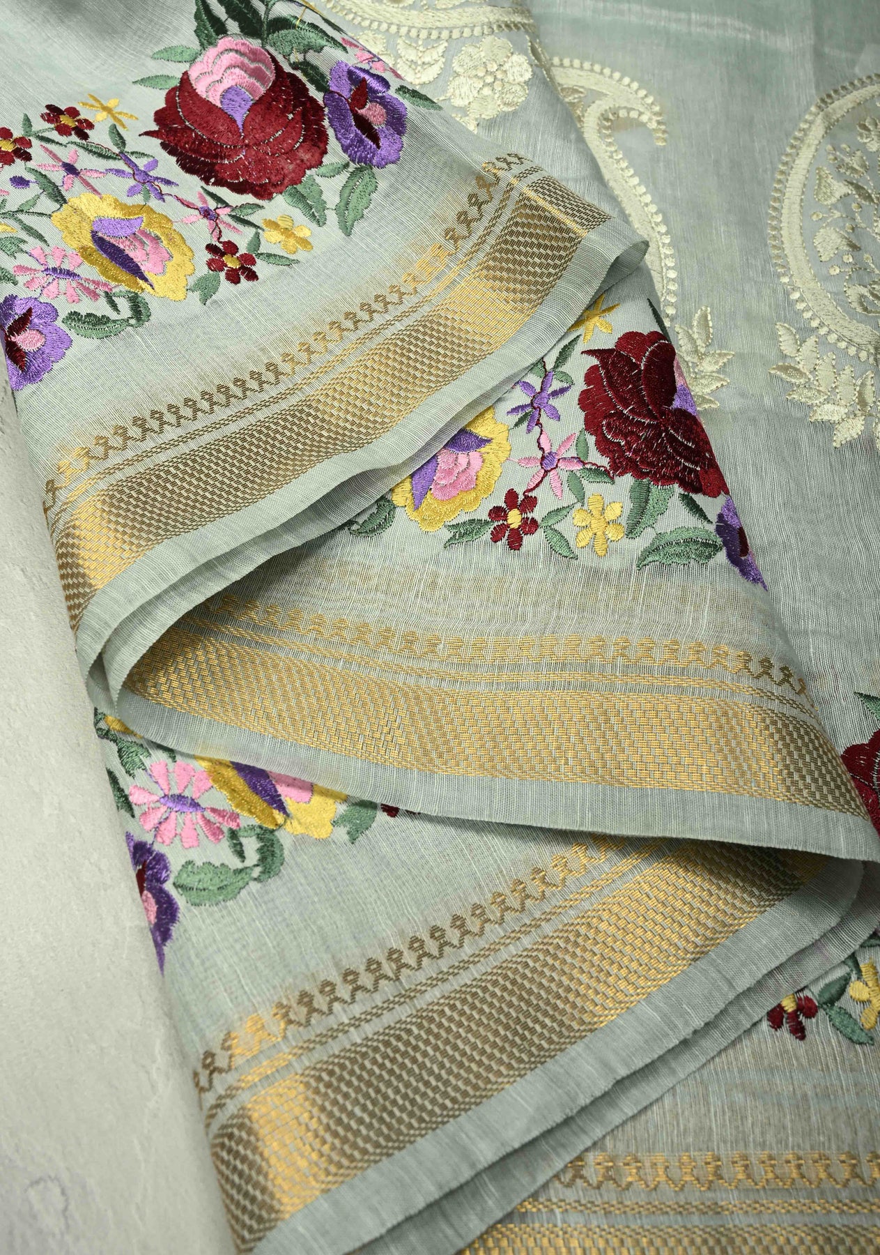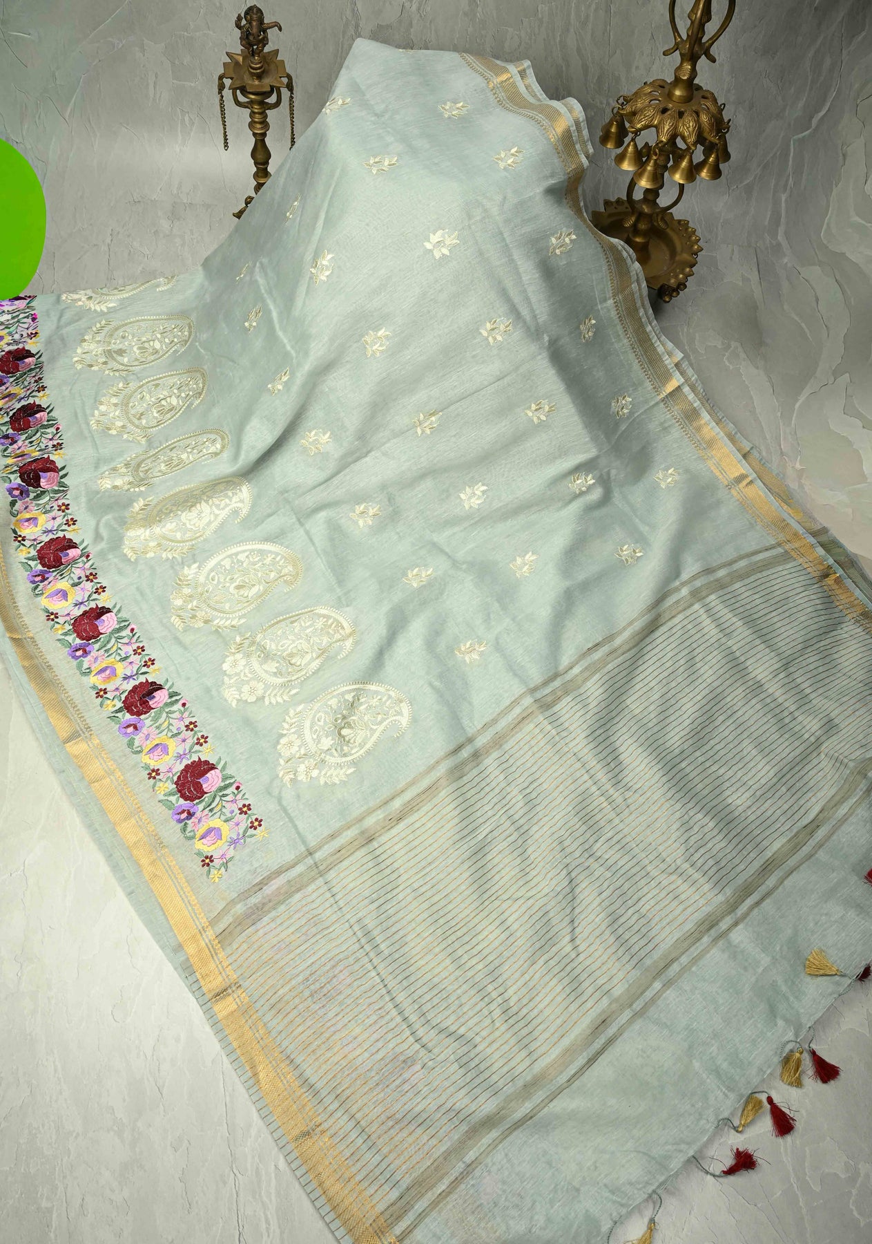 This Ash Gray Silk Linen Saree is a sophisticated and contemporary take on traditional elegance. The ash gray base is adorned with delicate paisley motifs, adding a subtle charm to the fabric. Complementing the motifs, intricate floral machine embroidery enhances the overall design with refined detailing, while the minimal zari border adds a touch of understated shimmer without overwhelming the saree. Crafted from a silk-linen blend, the saree offers a lightweight, breathable drape that combines comfort with elegance. Ideal for festive occasions, formal events, or cultural gatherings, this saree embodies modern grace with traditional artistry.