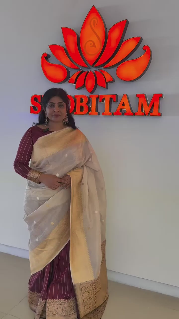 This Beige-Burgundy Banarasi Half Katan and Half Tissue Saree is a sophisticated fusion of texture, color, and traditional design. The saree features a graceful beige Tissue silk on one half, offering a soft, translucent elegance, while the other half is crafted from burgundy Katan silk that adds depth and a luminous sheen. Adorned with intricate sona rupa buttas—gold and silver motifs—and complemented by elegant zari stripes, this saree beautifully blends subtle charm with regal detailing. Finished with a refined zari border, it's perfect for weddings, festive occasions, and evening events where understated opulence is key.