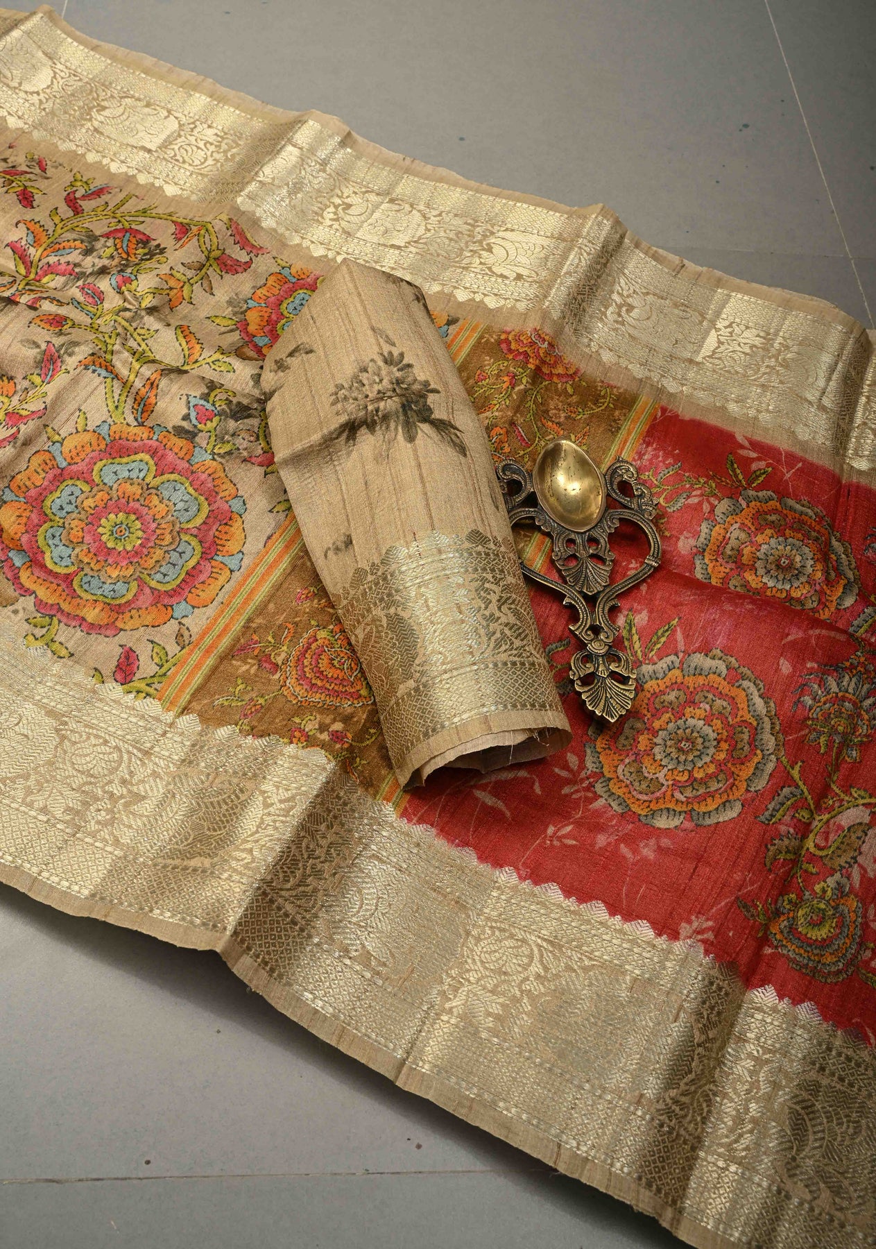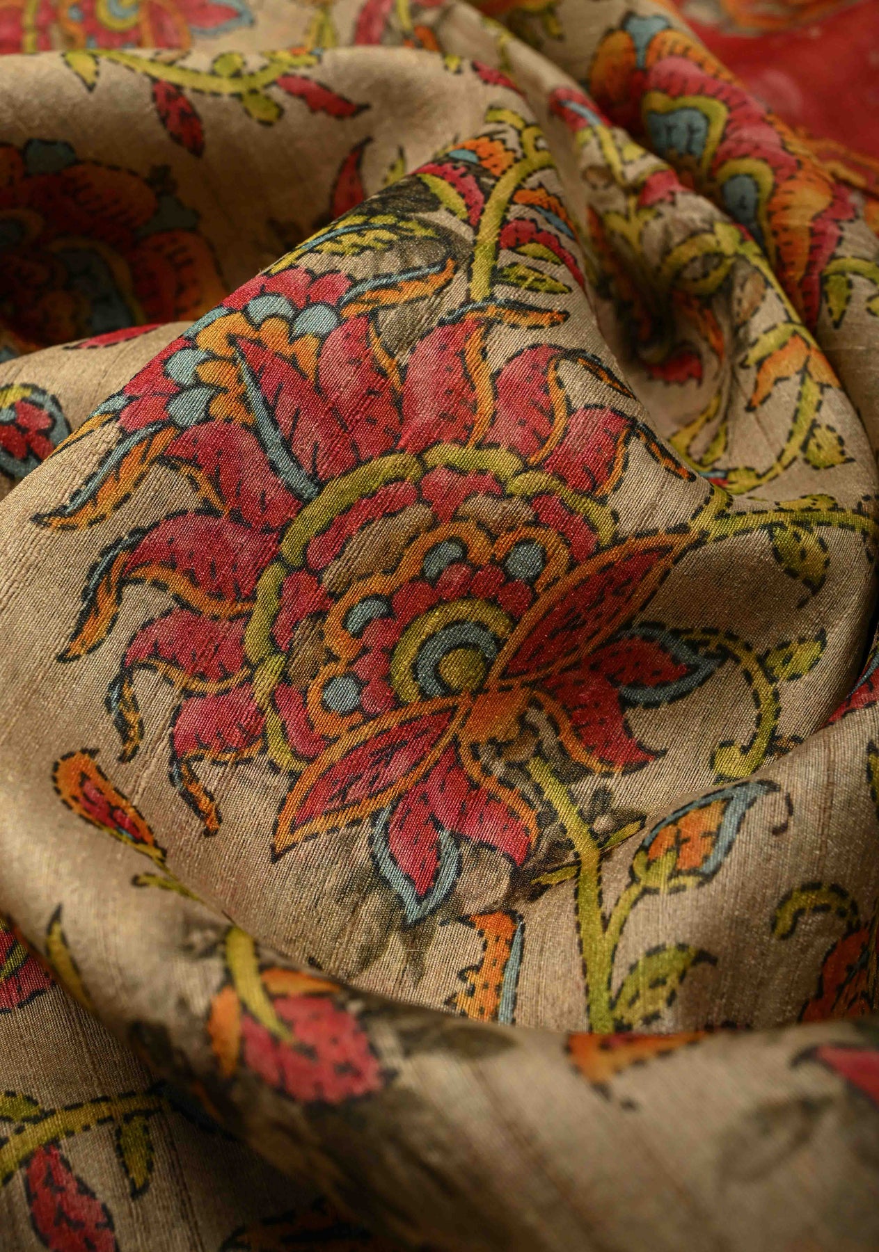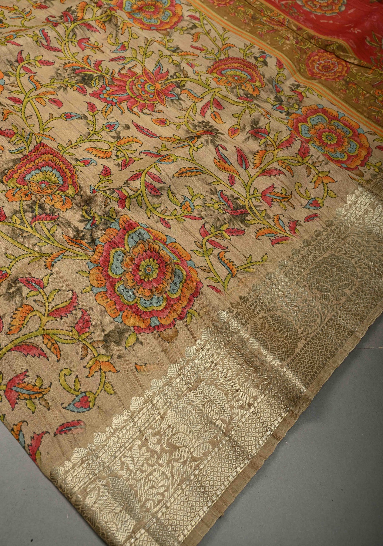The earthy beige base is adorned with an intricate Kalamkari floral print, inspired by traditional storytelling motifs and hand-painted aesthetics. Finished with a refined zari border, the saree gains a touch of regal charm while maintaining its organic, handcrafted appeal. Perfect for festive daytime celebrations, cultural gatherings, exhibitions, and elegant occasions, this saree is a true expression of tradition and sophistication.