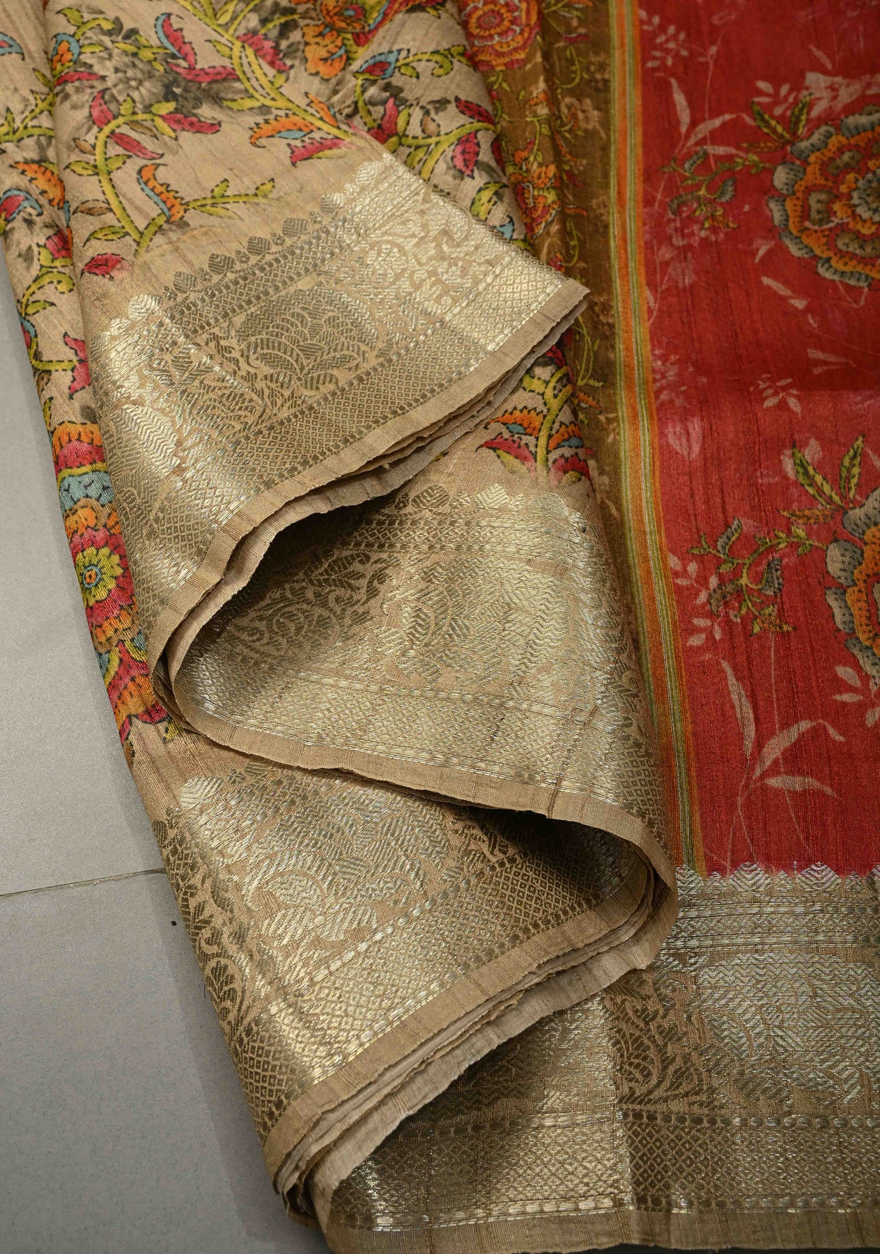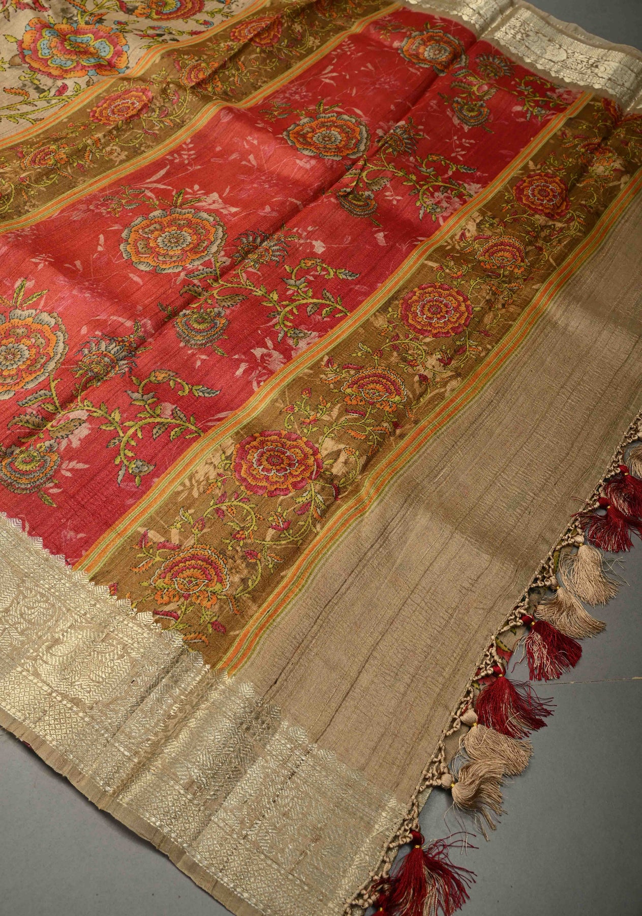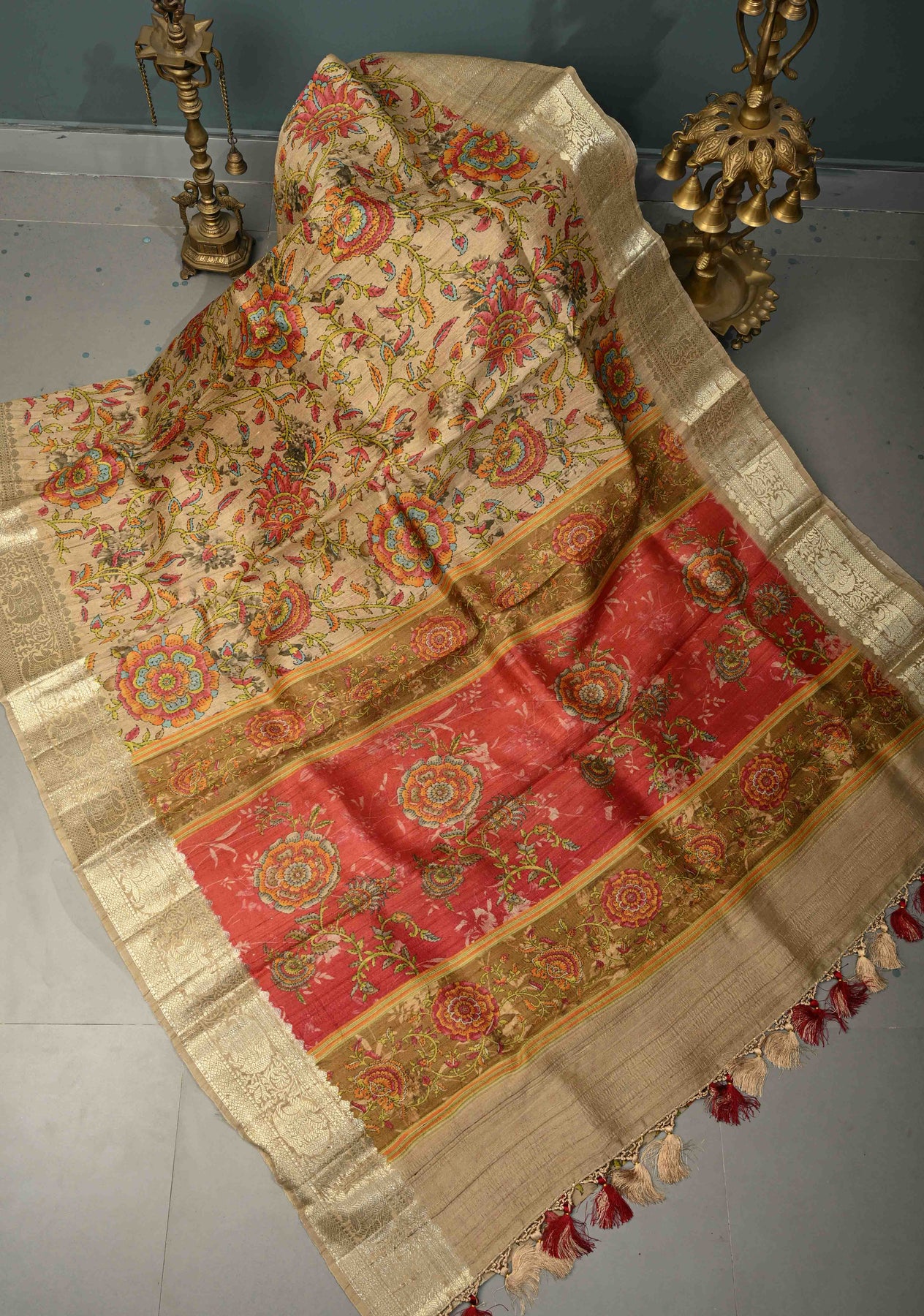 The earthy beige base is adorned with an intricate Kalamkari floral print, inspired by traditional storytelling motifs and hand-painted aesthetics. Finished with a refined zari border, the saree gains a touch of regal charm while maintaining its organic, handcrafted appeal. Perfect for festive daytime celebrations, cultural gatherings, exhibitions, and elegant occasions, this saree is a true expression of tradition and sophistication.