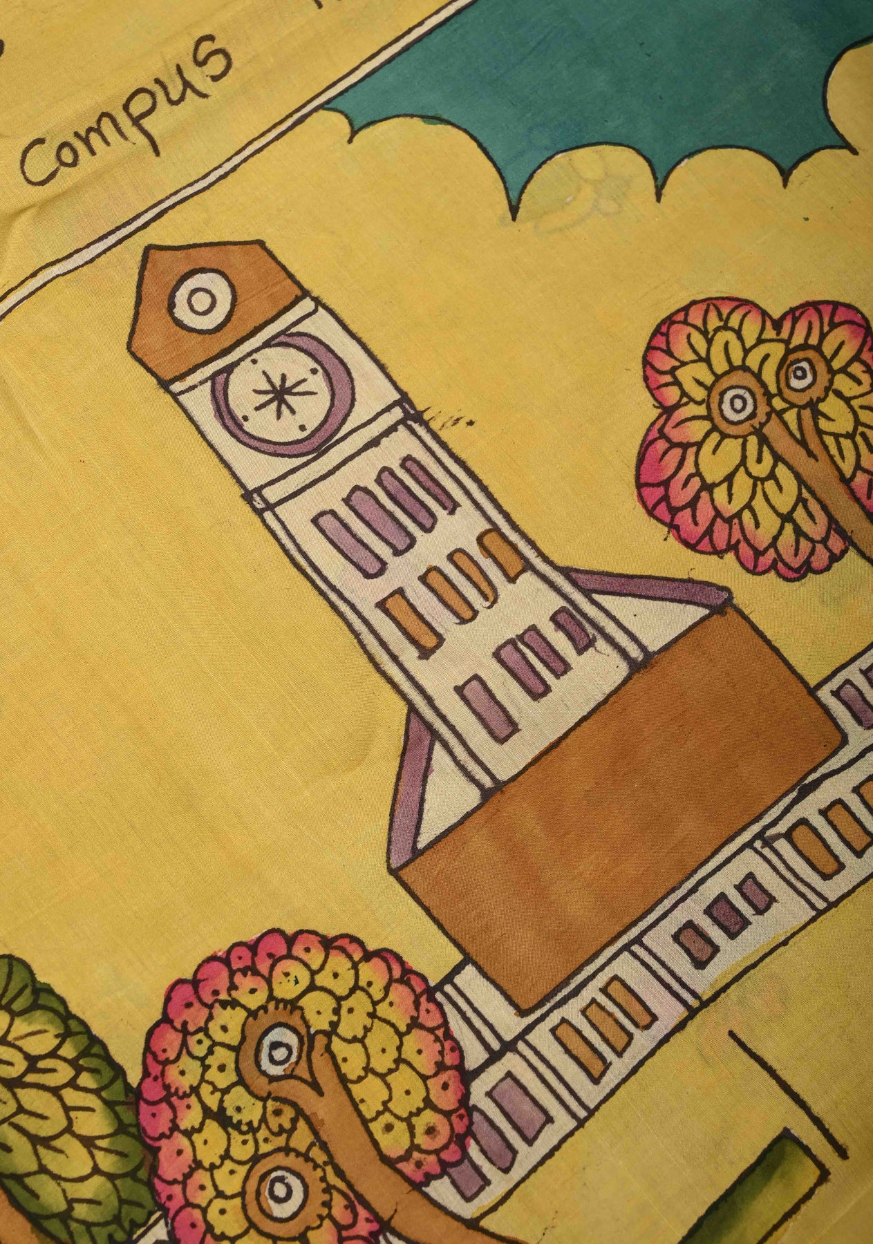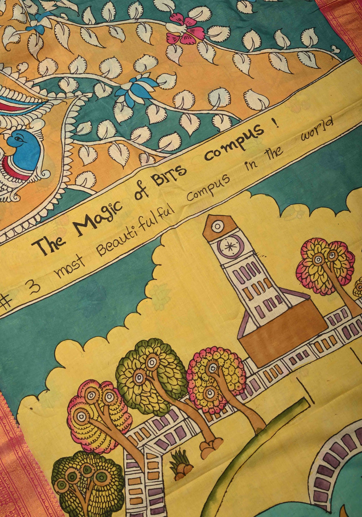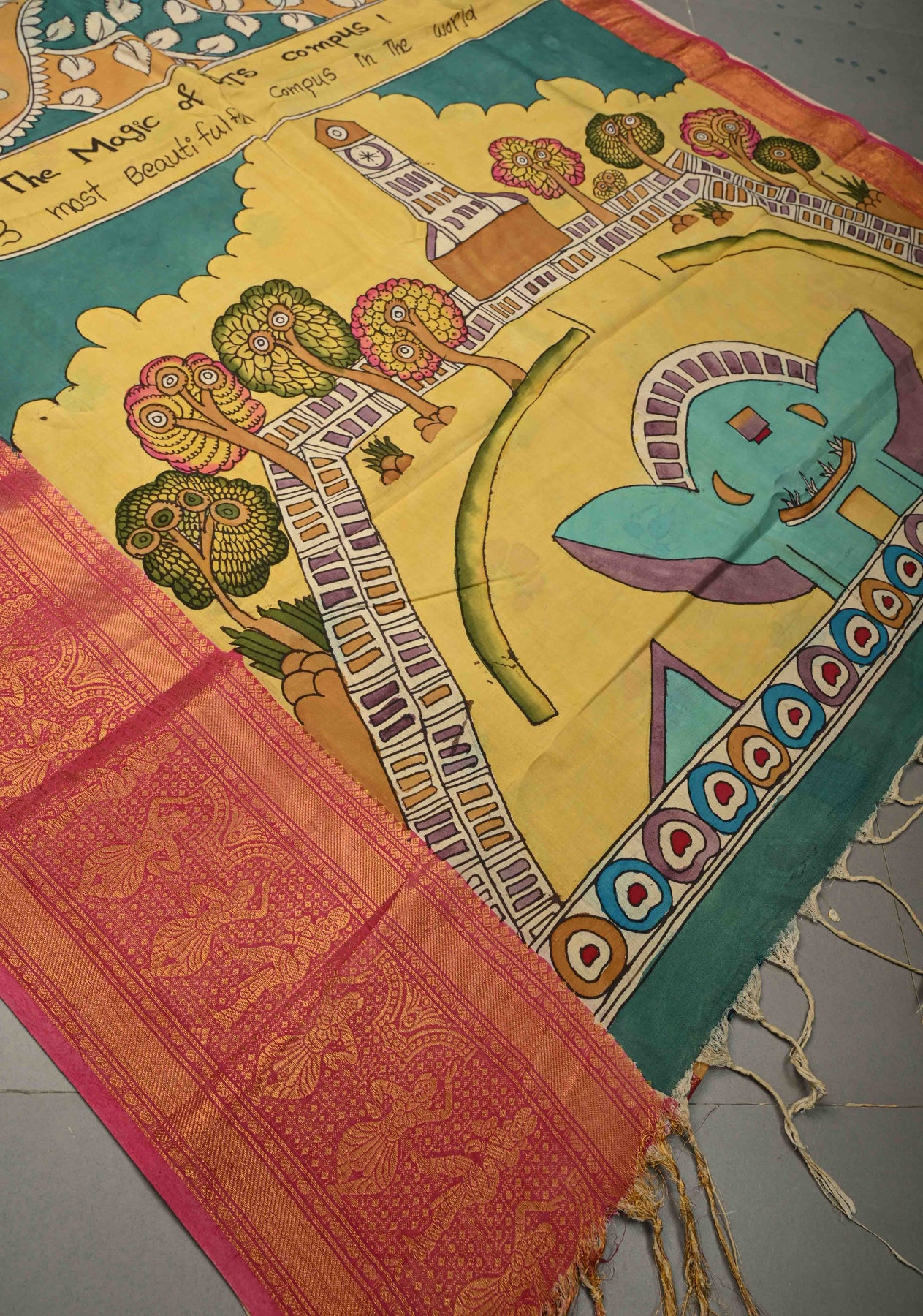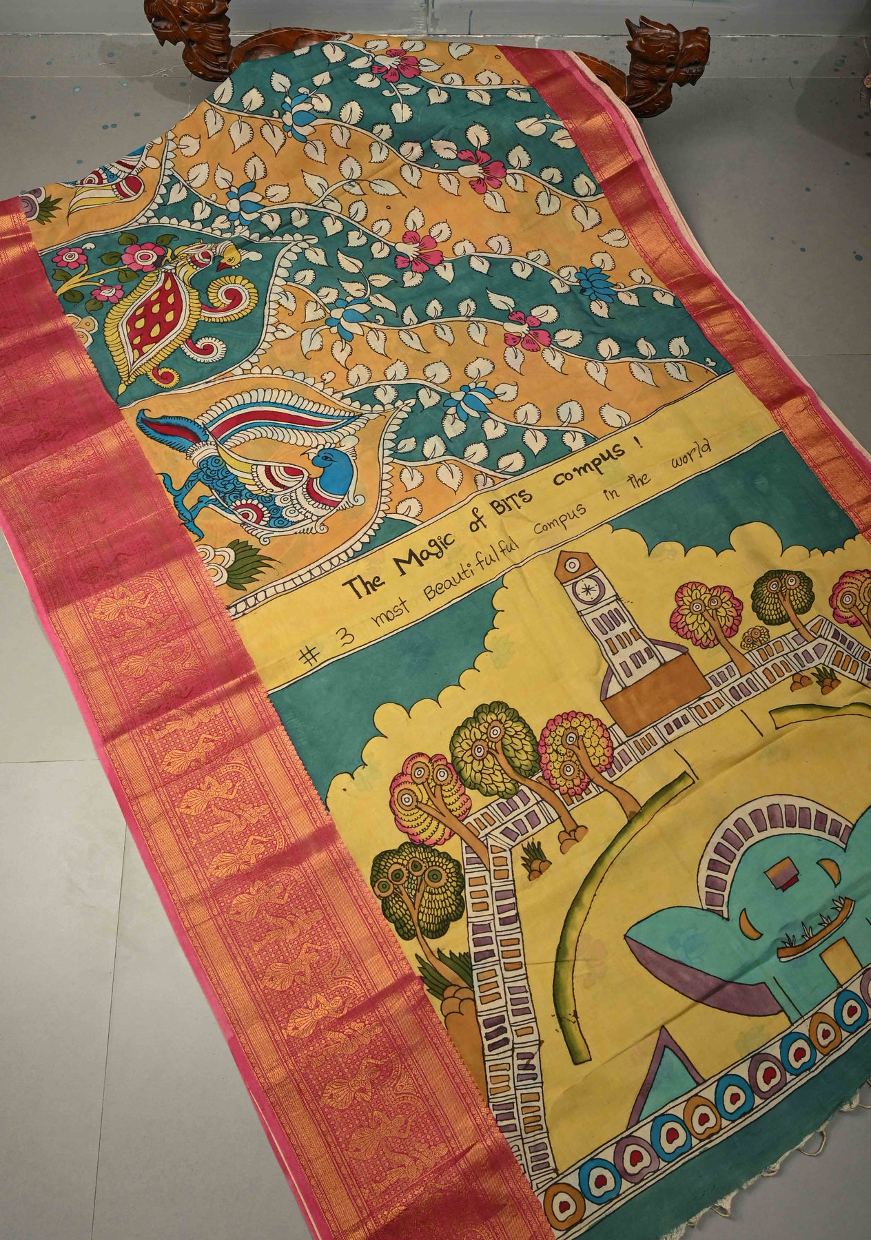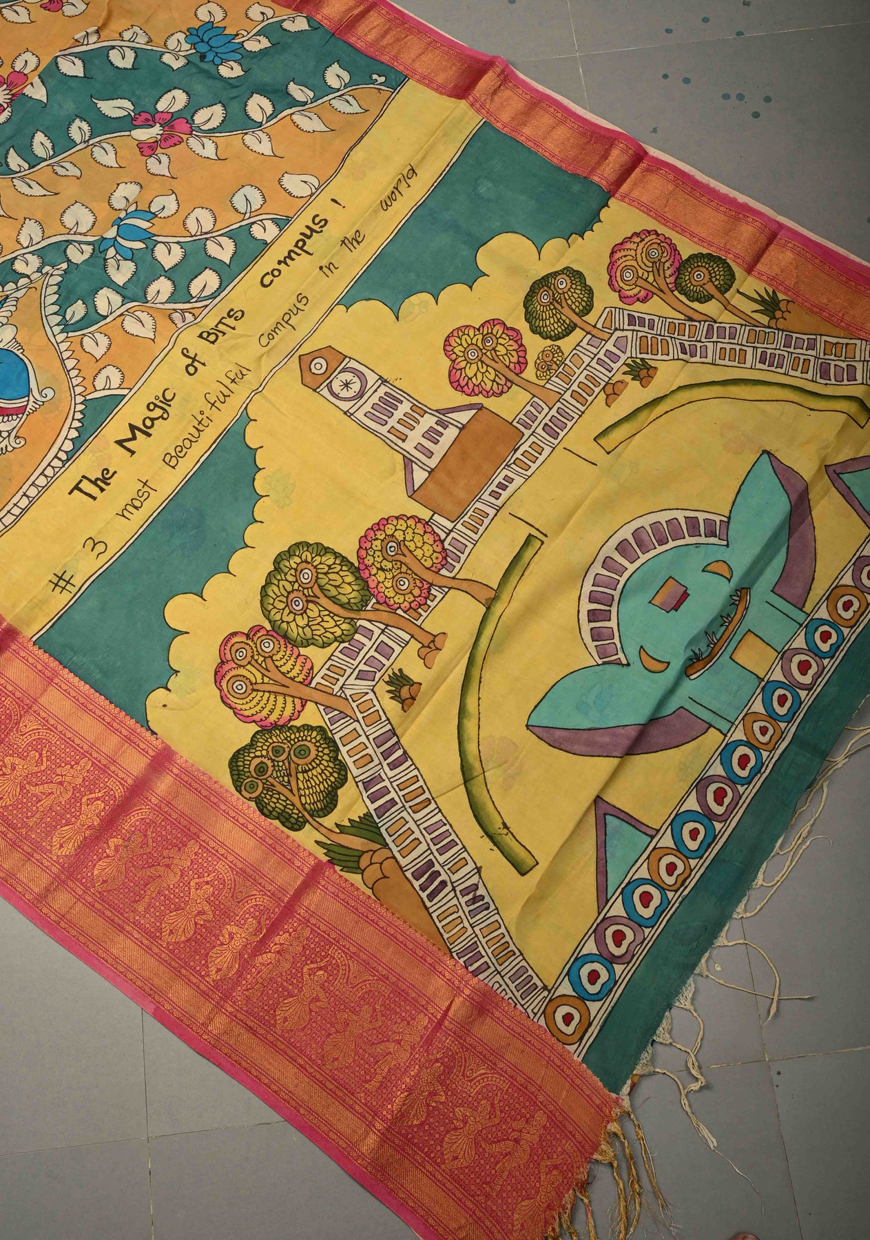 BITS Campus Pallu Theme : Yellow Authentic Pen kalamkari on Bangalore Silk Saree with Floral Jaal and Zari Border