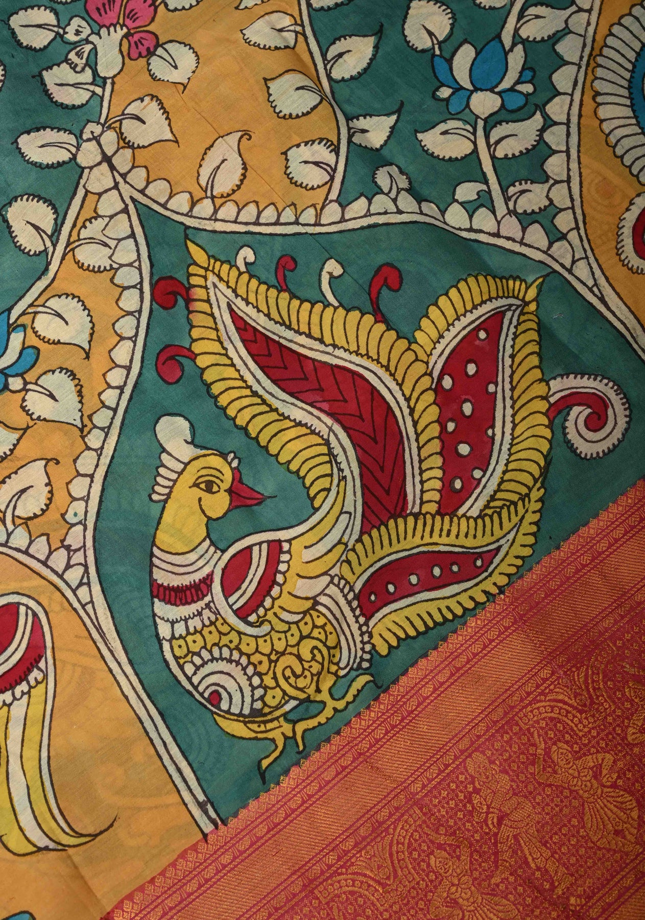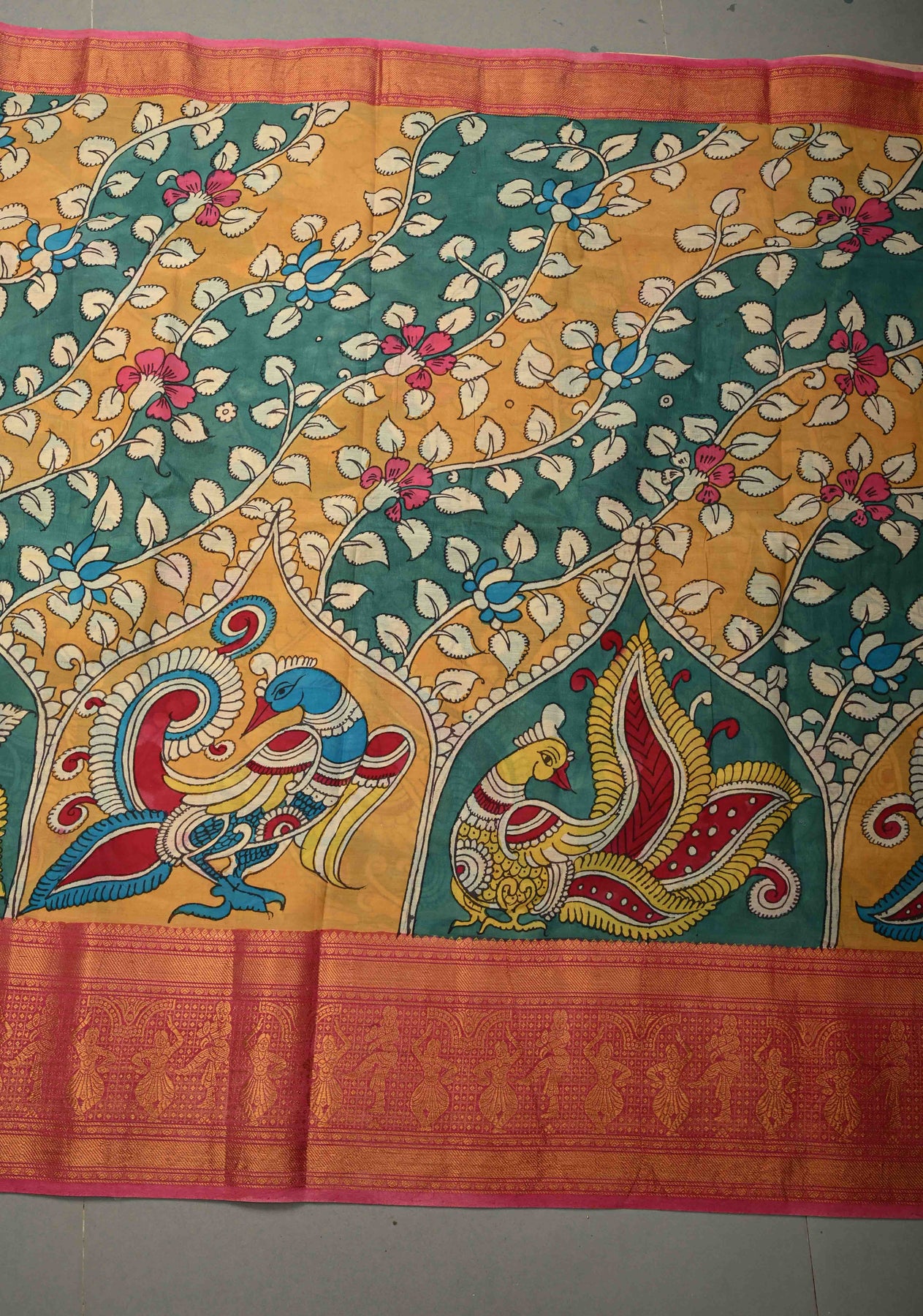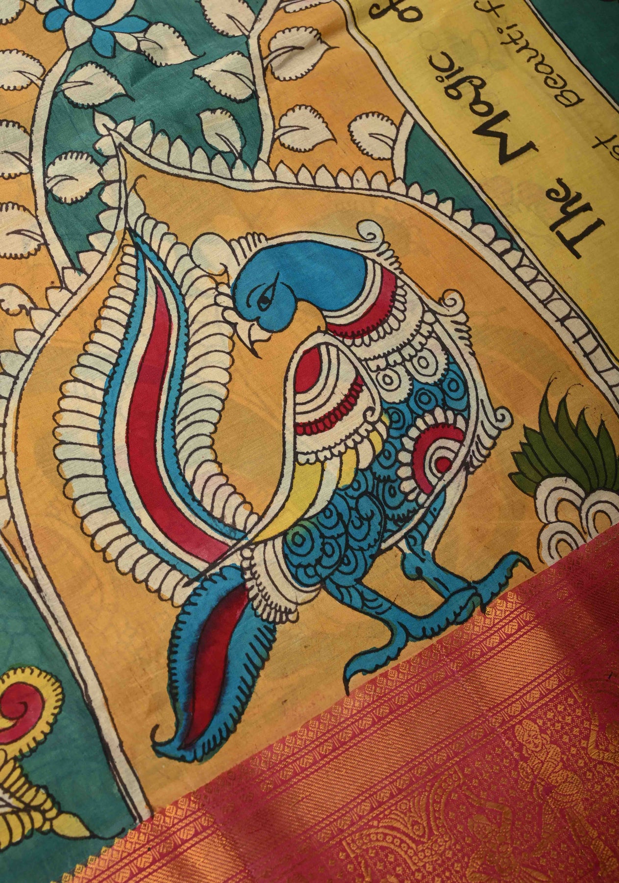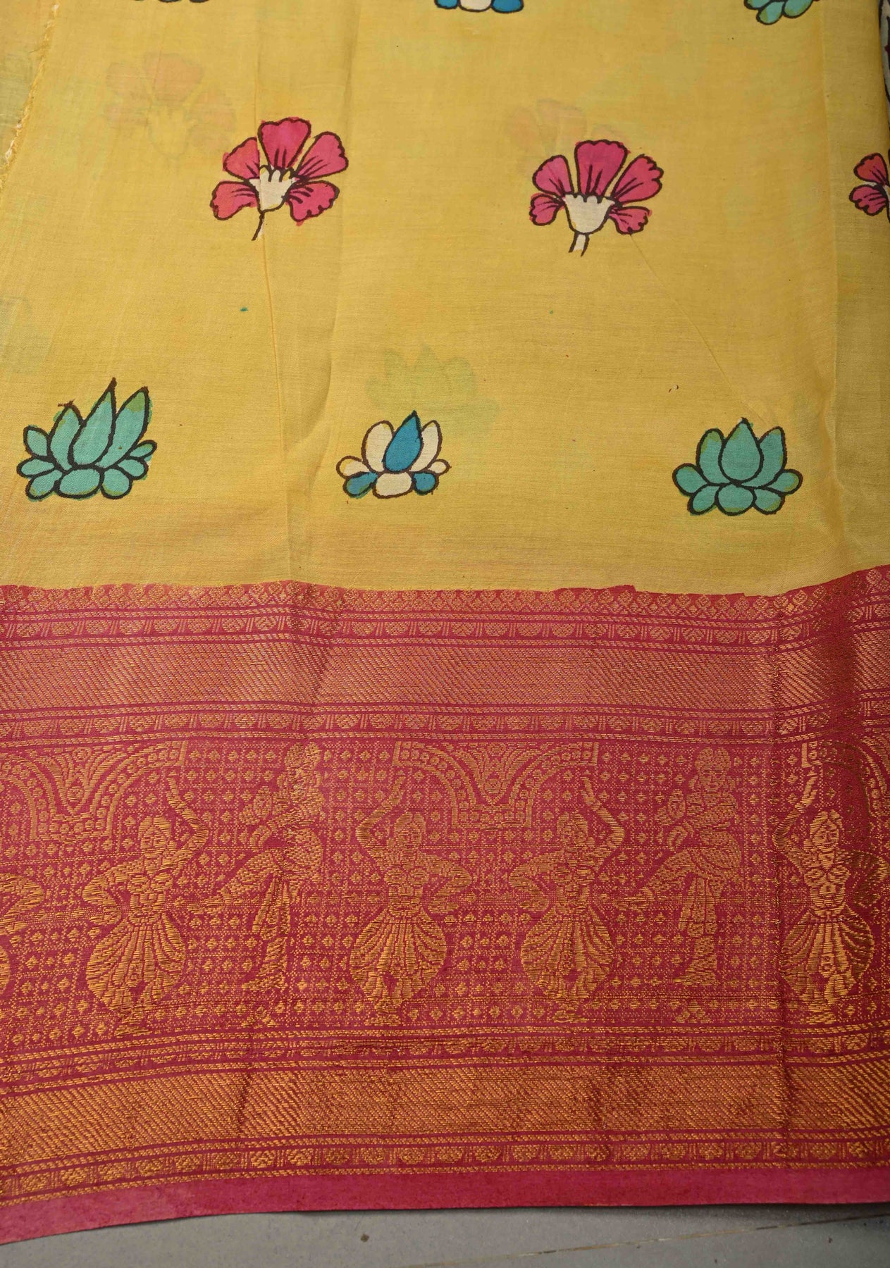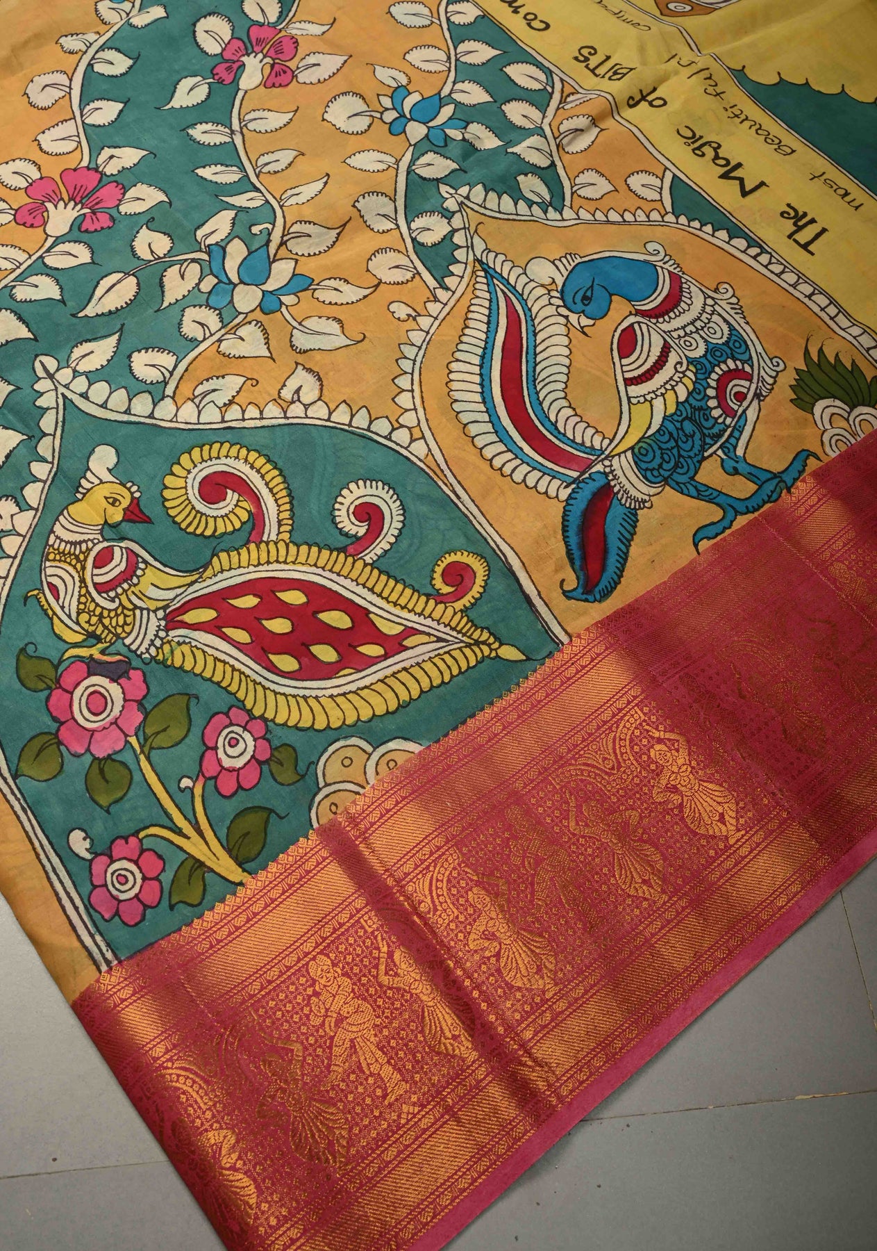 BITS Campus Pallu Theme : Yellow Authentic Pen kalamkari on Bangalore Silk Saree with Floral Jaal and Zari Border