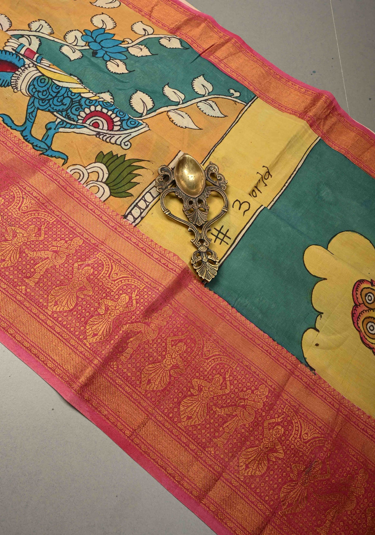 The highlight of this saree is its distinctive Campus Pallu design, rendered in Pen Kalamkari style, adding narrative depth and artisanal character. Finished with a zari border, this saree perfectly balances cultural heritage with refined sophistication. Ideal for festive occasions, cultural events, temple wear, and special celebrations, this saree is a graceful expression of art and tradition.