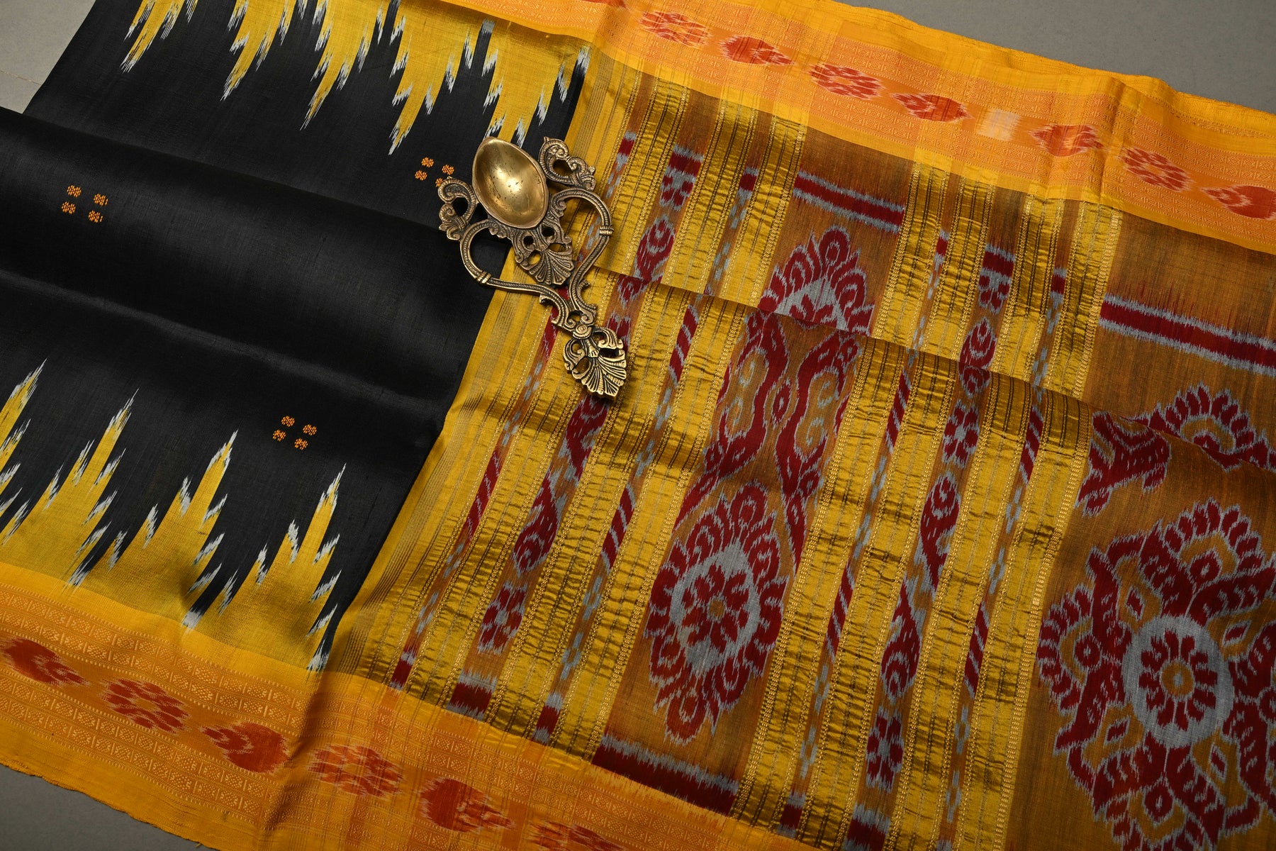 The Black Handloom Sambalpuri Ikkat Silk Saree with Contrast Temple Border is a striking example of Odisha’s rich weaving heritage. Crafted from premium silk and SILK MARK certified for authenticity, this saree features a deep black base that exudes sophistication and versatility. The intricate handwoven patterns highlight traditional Sambalpuri artistry, while the bold contrast temple border adds a classic touch of elegance and cultural charm. With no blouse piece included, the focus remains entirely on the beautifully detailed saree, making it perfect for styling with a custom blouse. Ideal for weddings, festive occasions, and cultural celebrations, this saree embodies timeless craftsmanship and the enduring allure of authentic handloom silk.