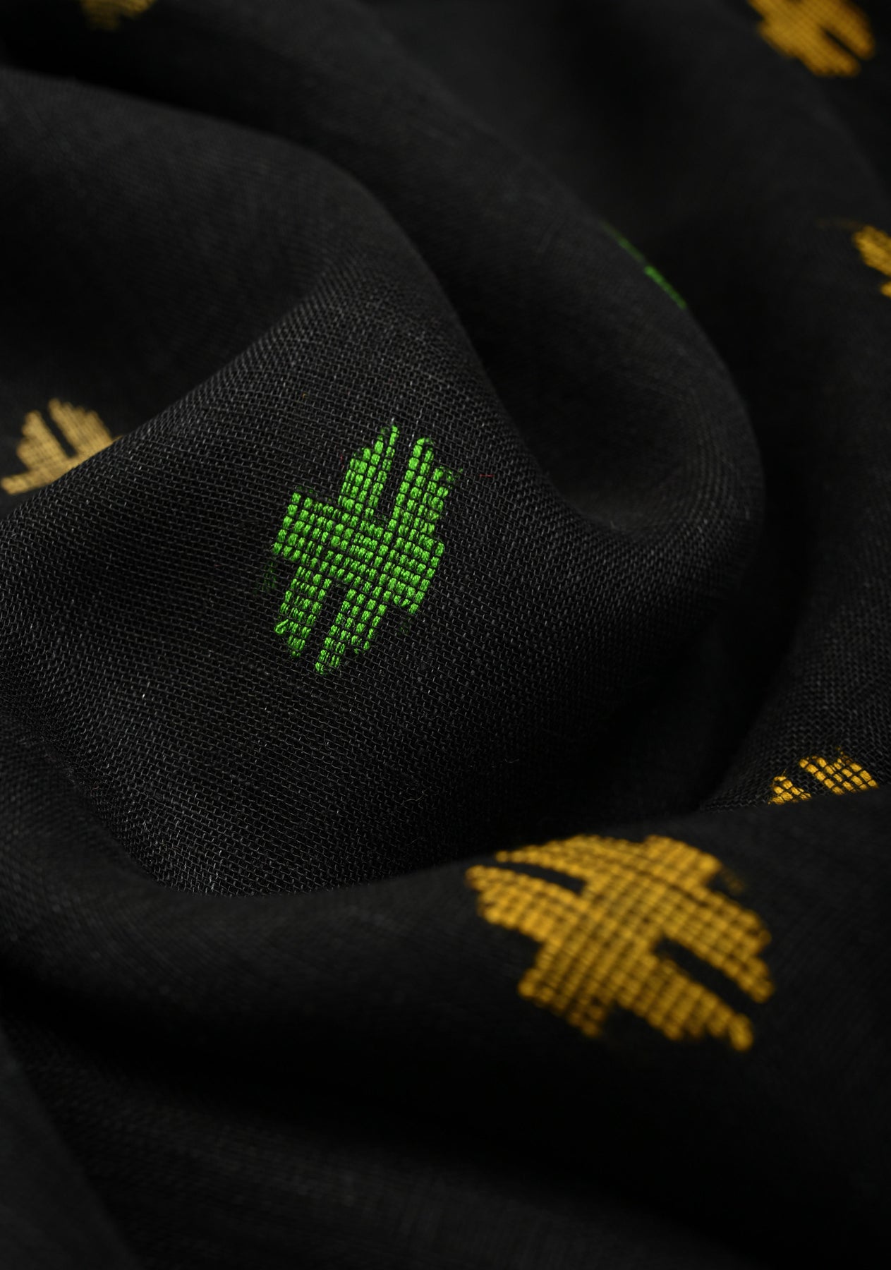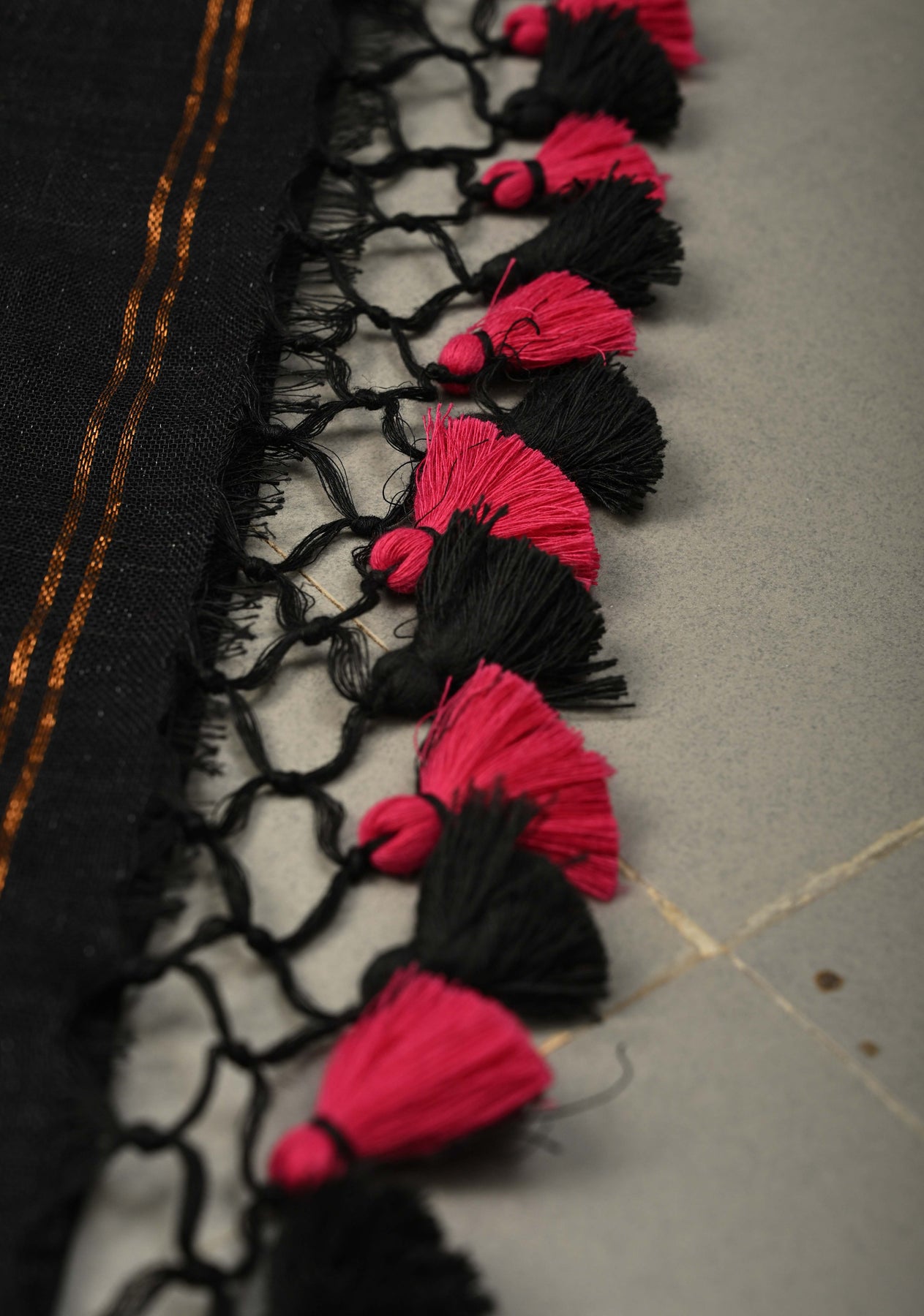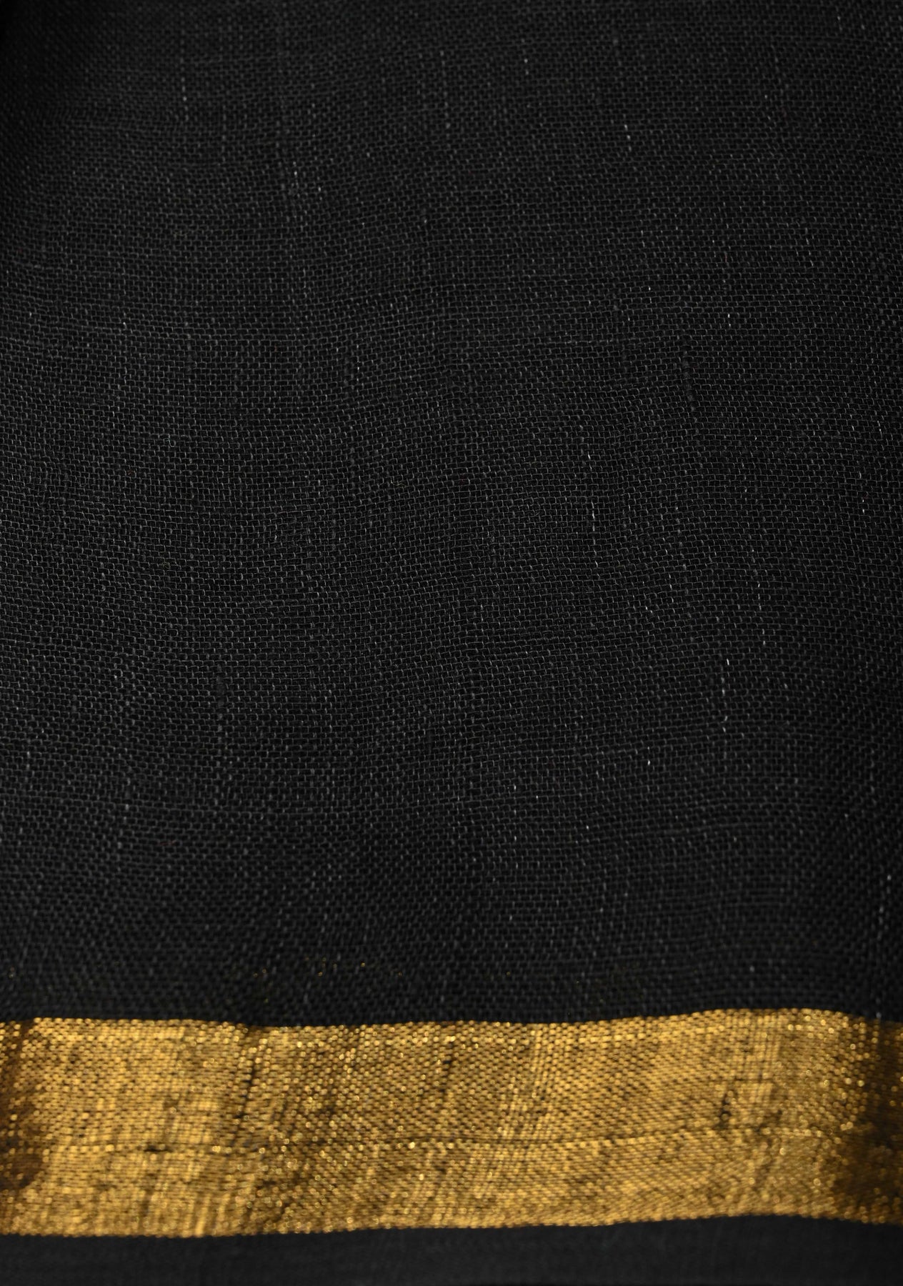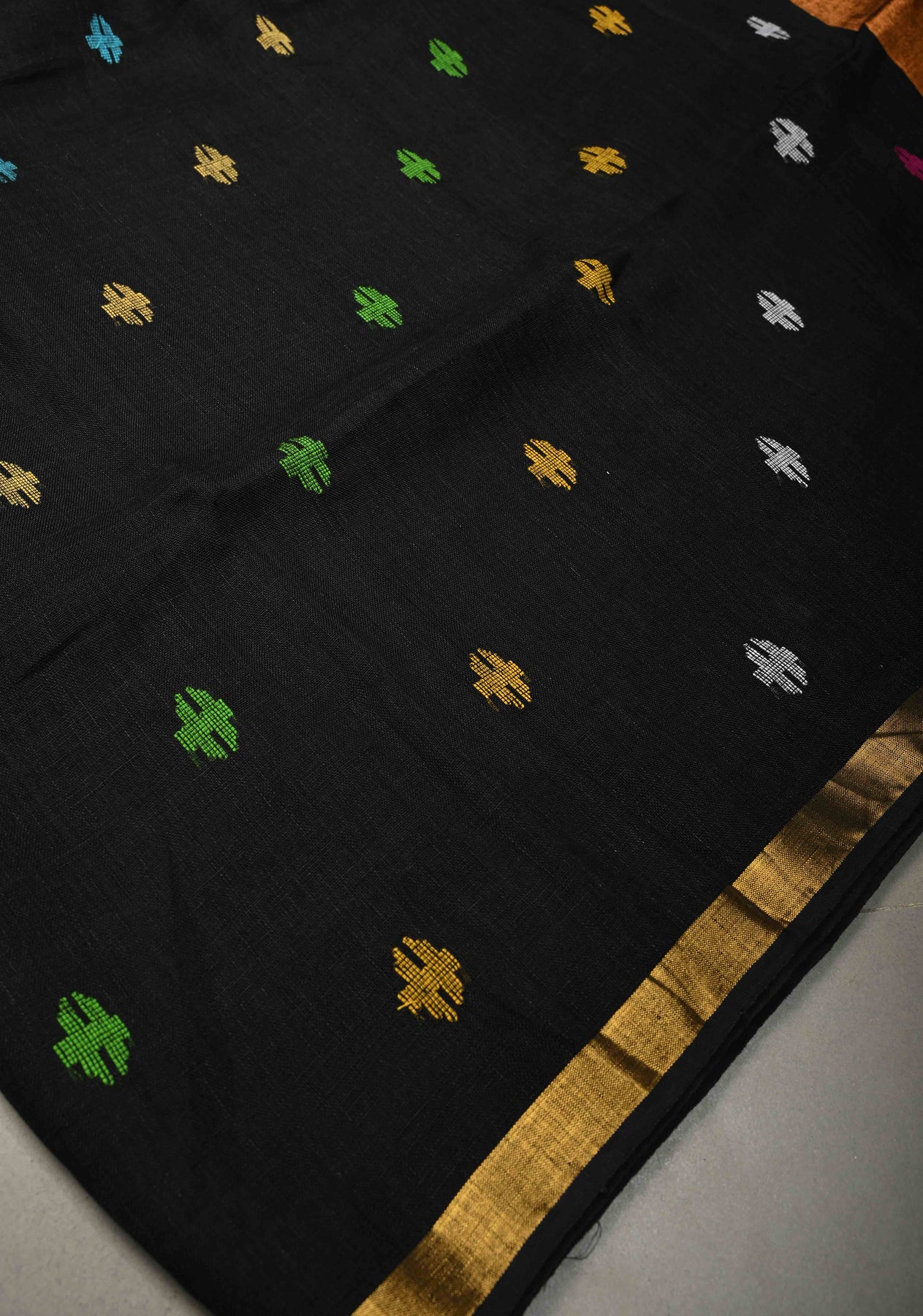 The Black Meenakari Buttas on Handloom Linen saree is a striking blend of elegance and traditional craftsmanship. The black linen fabric serves as a canvas for exquisite Meenakari buttas, adding intricate pops of color and sophistication. The saree features a stunning Paithani pallu, rich in traditional motifs that exude regal charm, contrasting beautifully with the dark base. A minimal tissue border runs along the edges, lending a touch of refinement and understated grace. Perfect for evening soirées or cultural celebrations, this saree offers timeless beauty, combining the allure of handloom linen with intricate details and luxurious finishing.