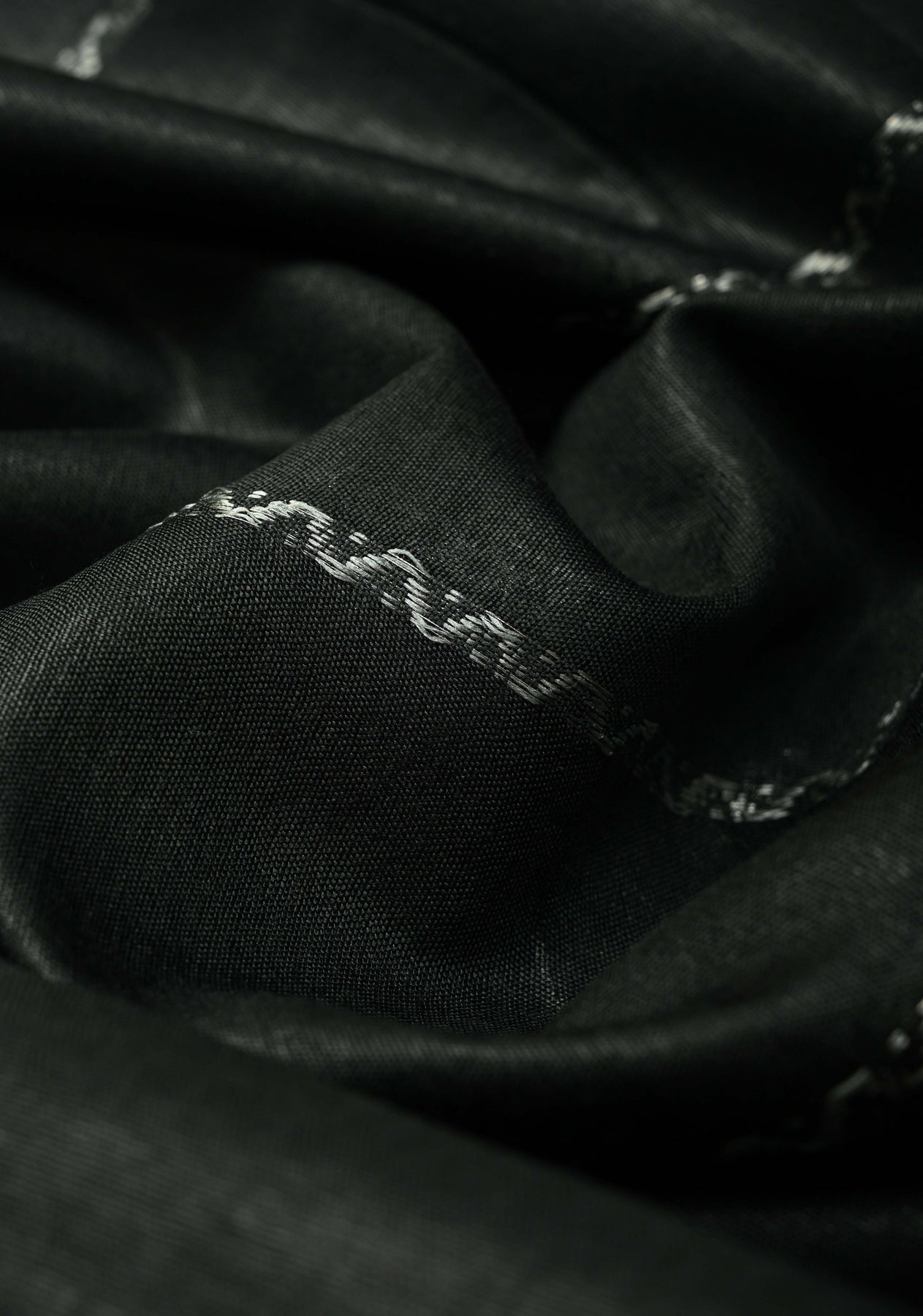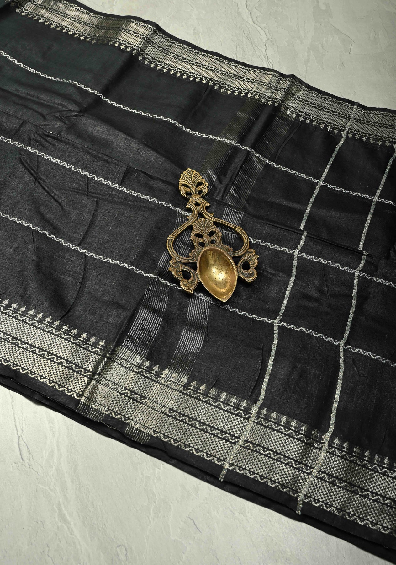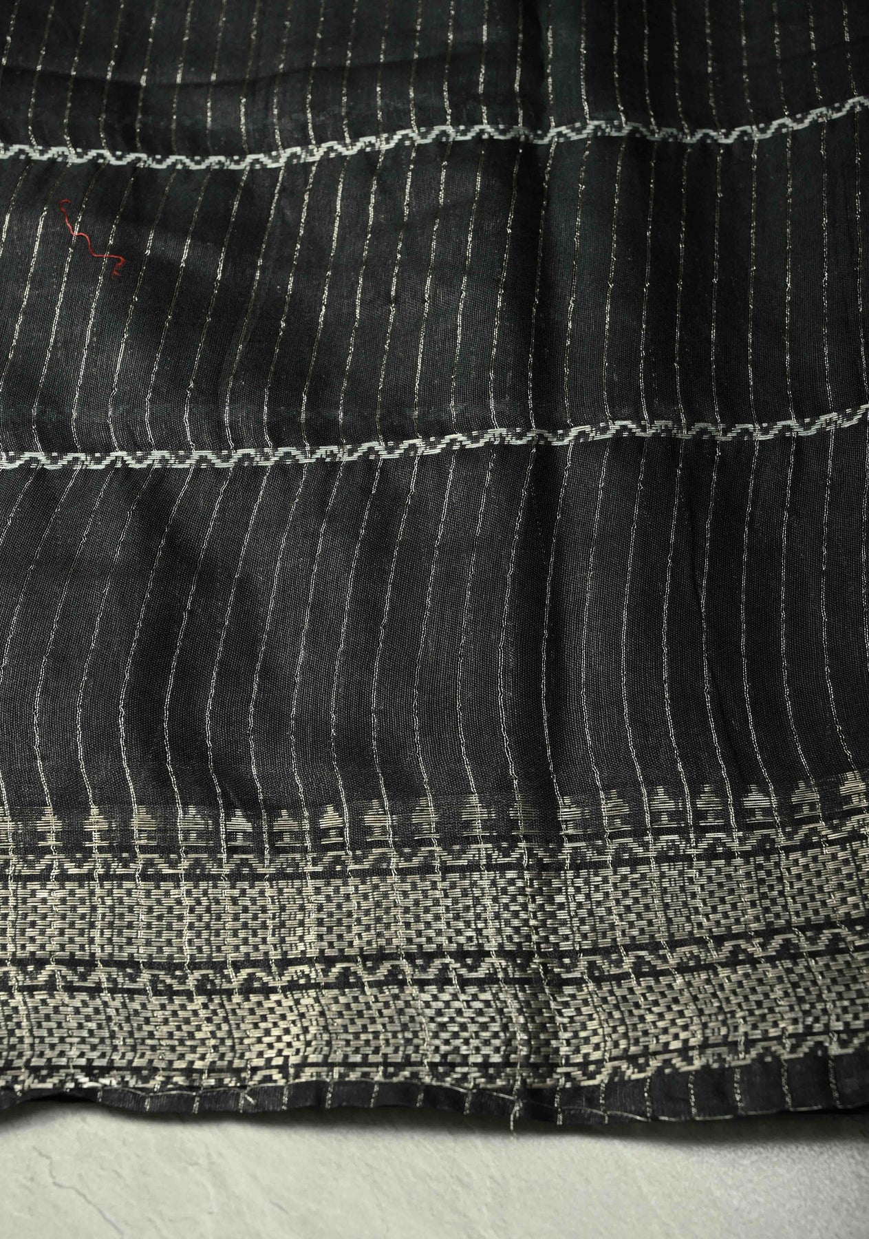 This elegant black Semi Tussar saree features a rich, textured fabric that exudes understated sophistication. The subtle sheen of the Semi Tussar silk adds depth and dimension to the garment, while the bold Veldhari stripes running across the body lend it a contemporary, stylish appeal. These stripes, woven with precision, create a stunning the black background, adding a modern edge to the traditional drape. The saree is further enhanced with an intricate zari border, which brings a touch of regal charm and intricate craftsmanship to the overall design. The shimmering threads, meticulously woven along the edges, add a timeless luxury and elevate the saree’s elegance. Perfect for formal events or festive occasions, this saree combines classic charm with modern aesthetics, making it a versatile and exquisite addition to any wardrobe.