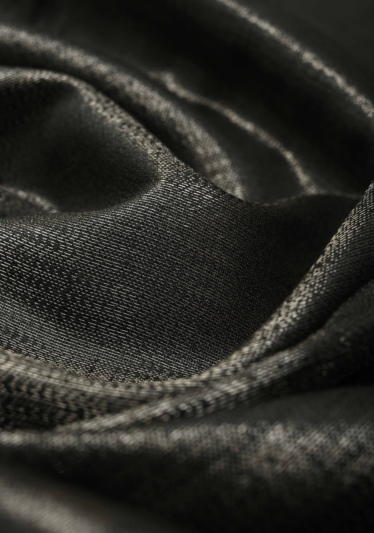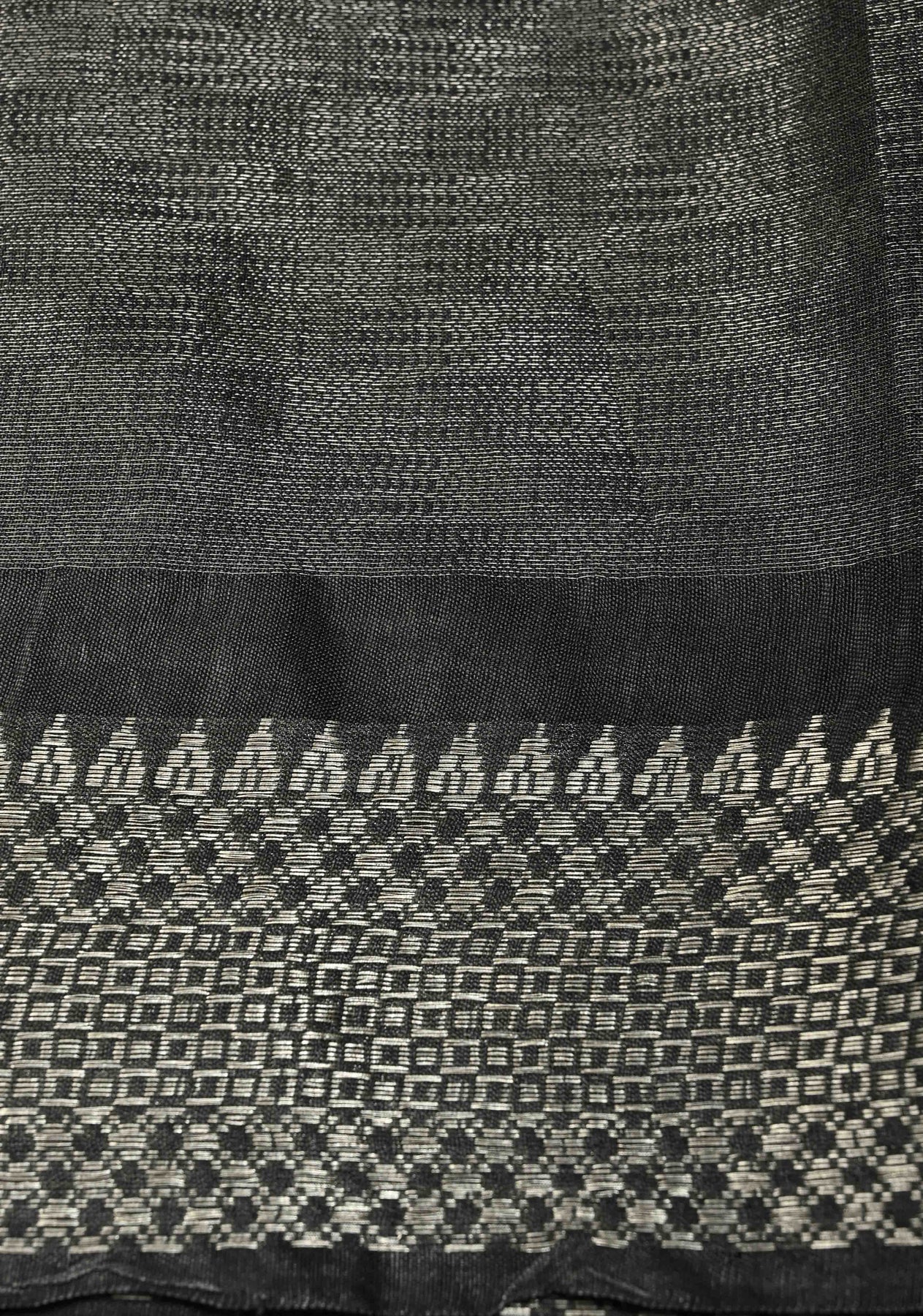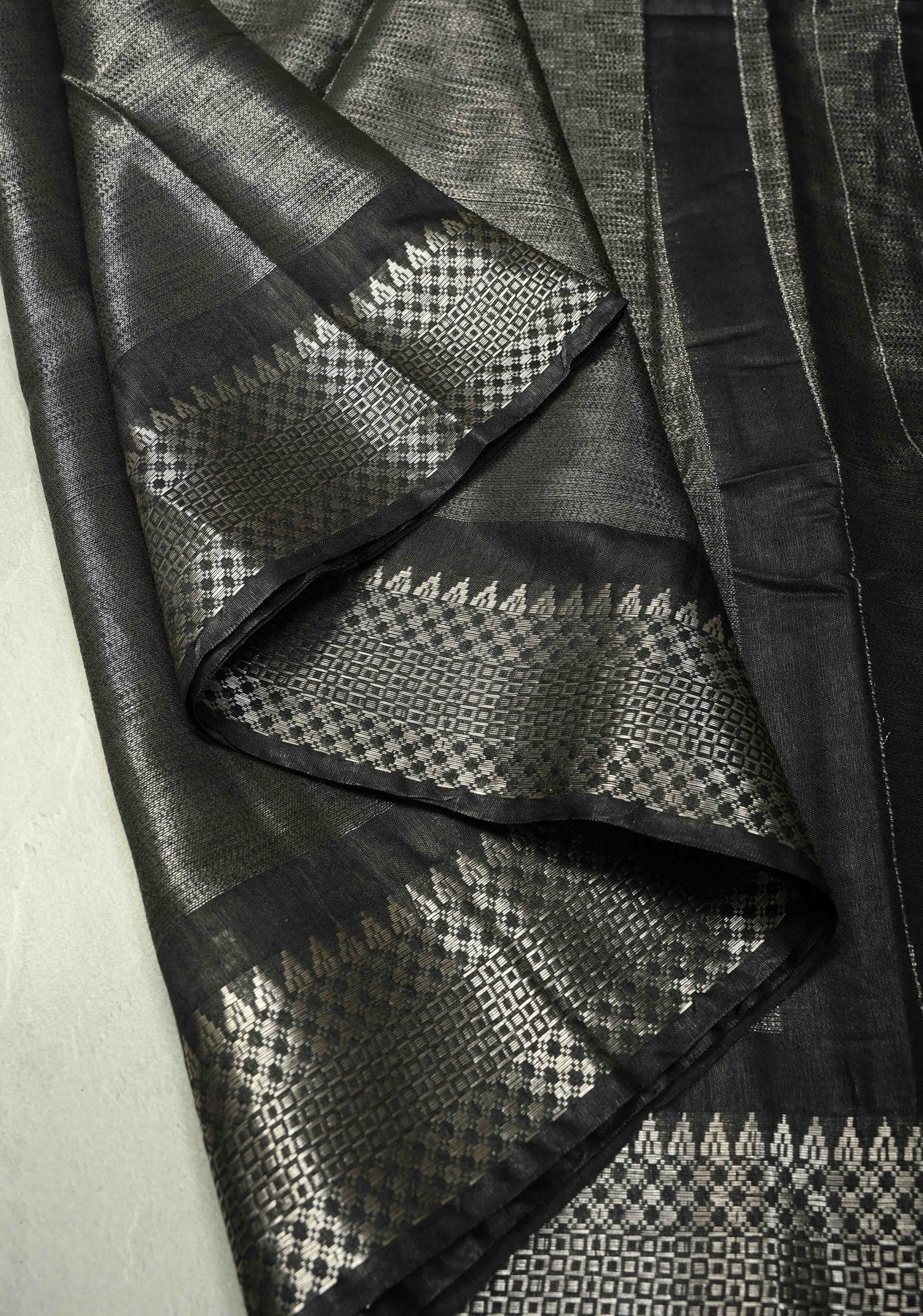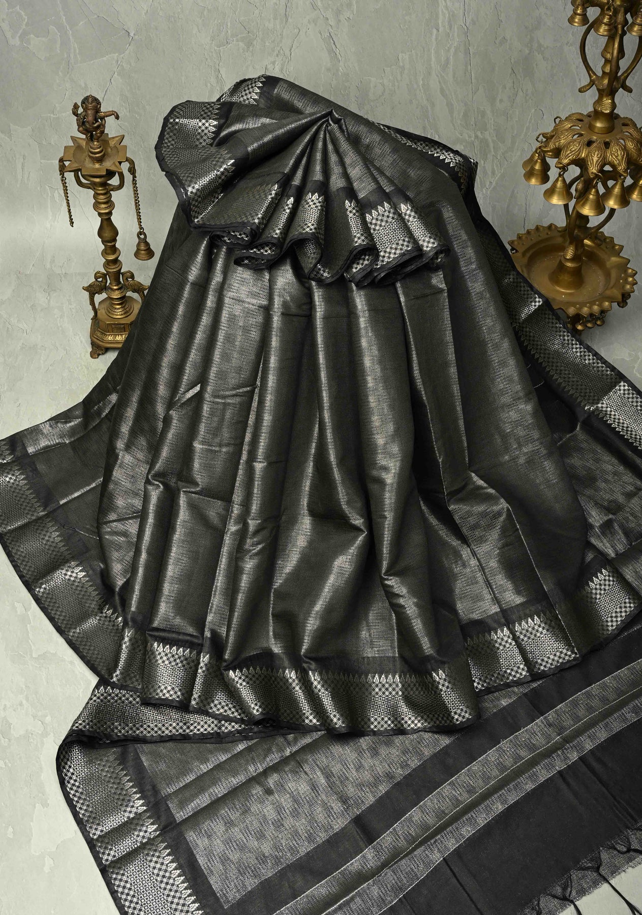 Black Semi Tussar Tissue Saree with Temple Silver Zari Border