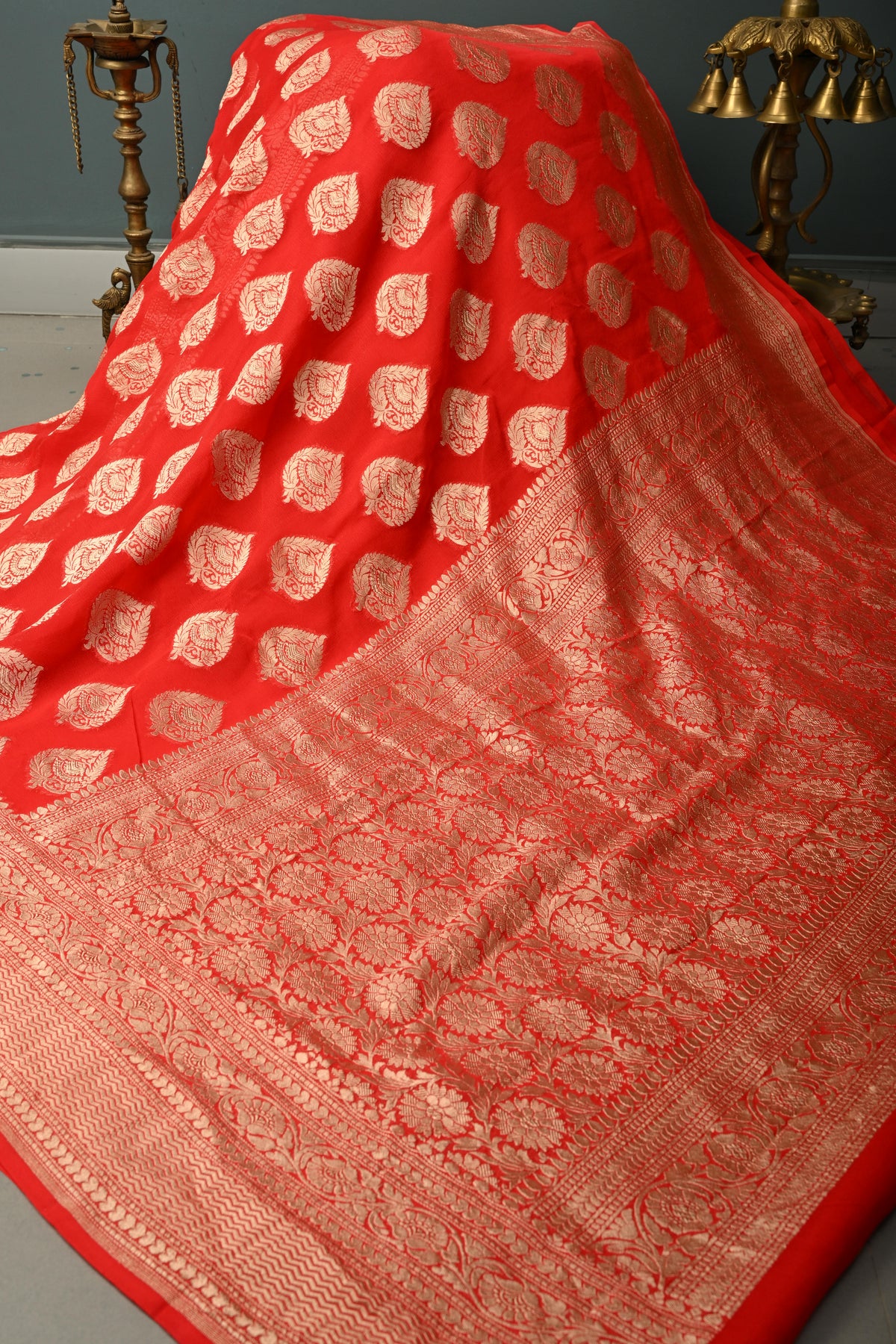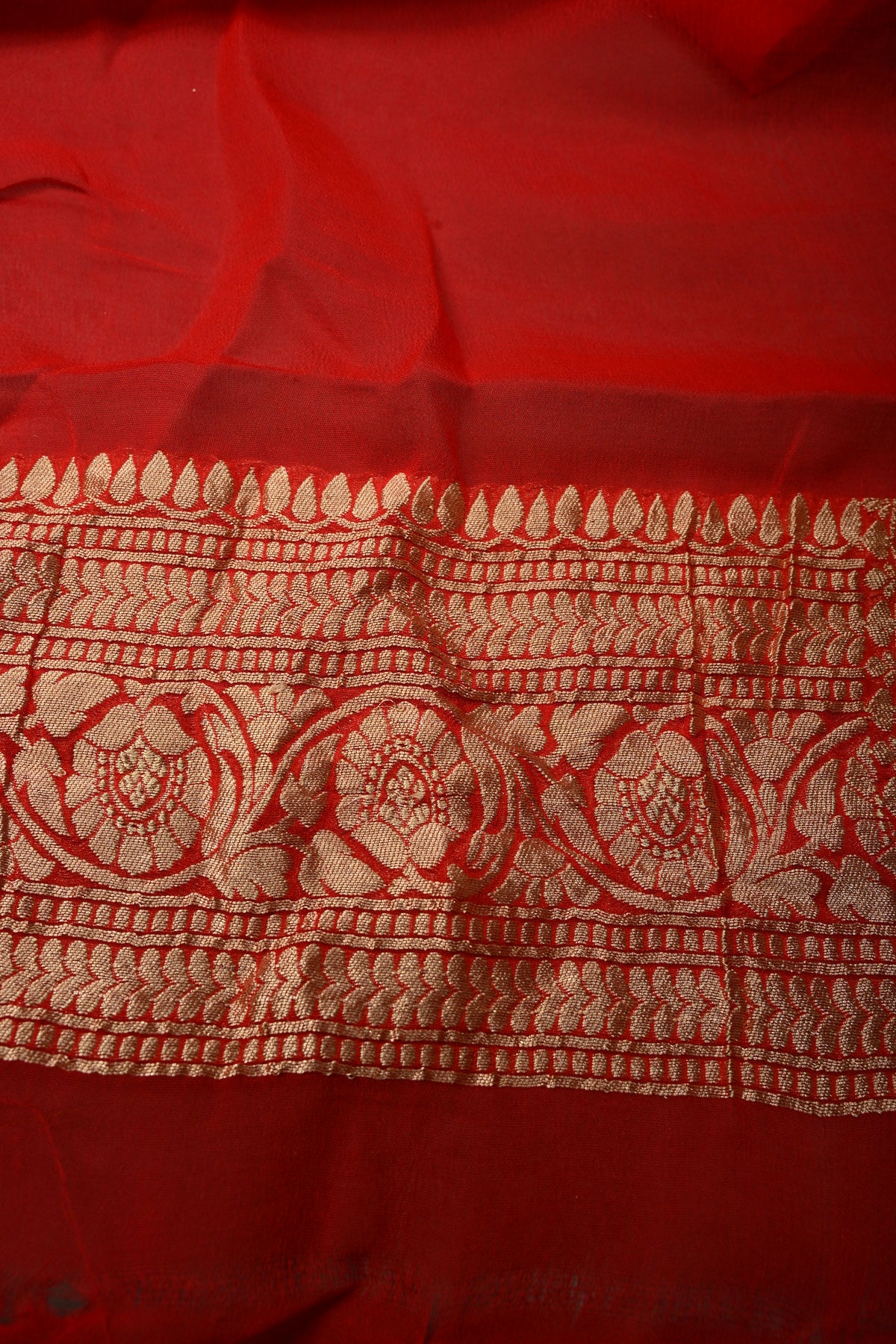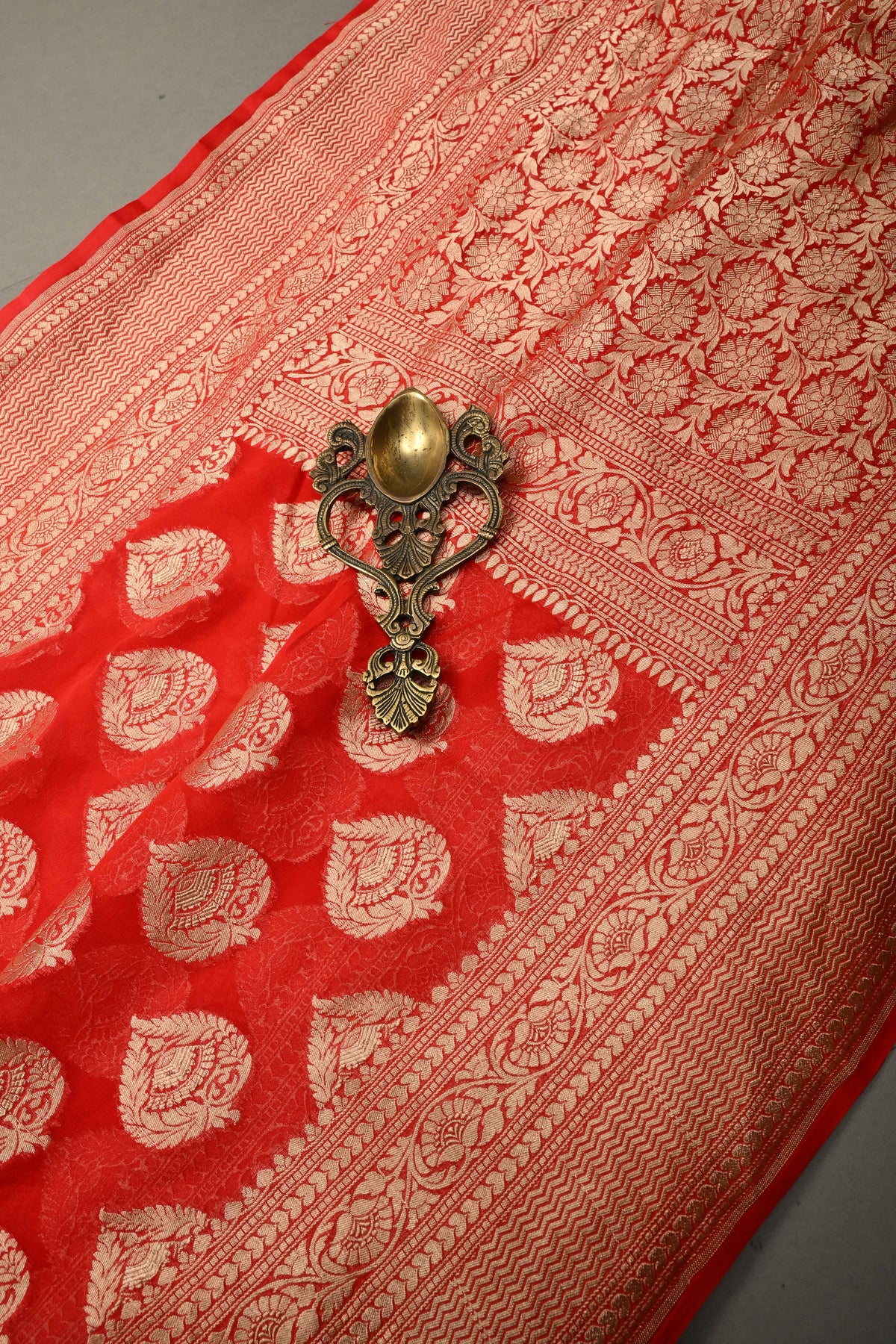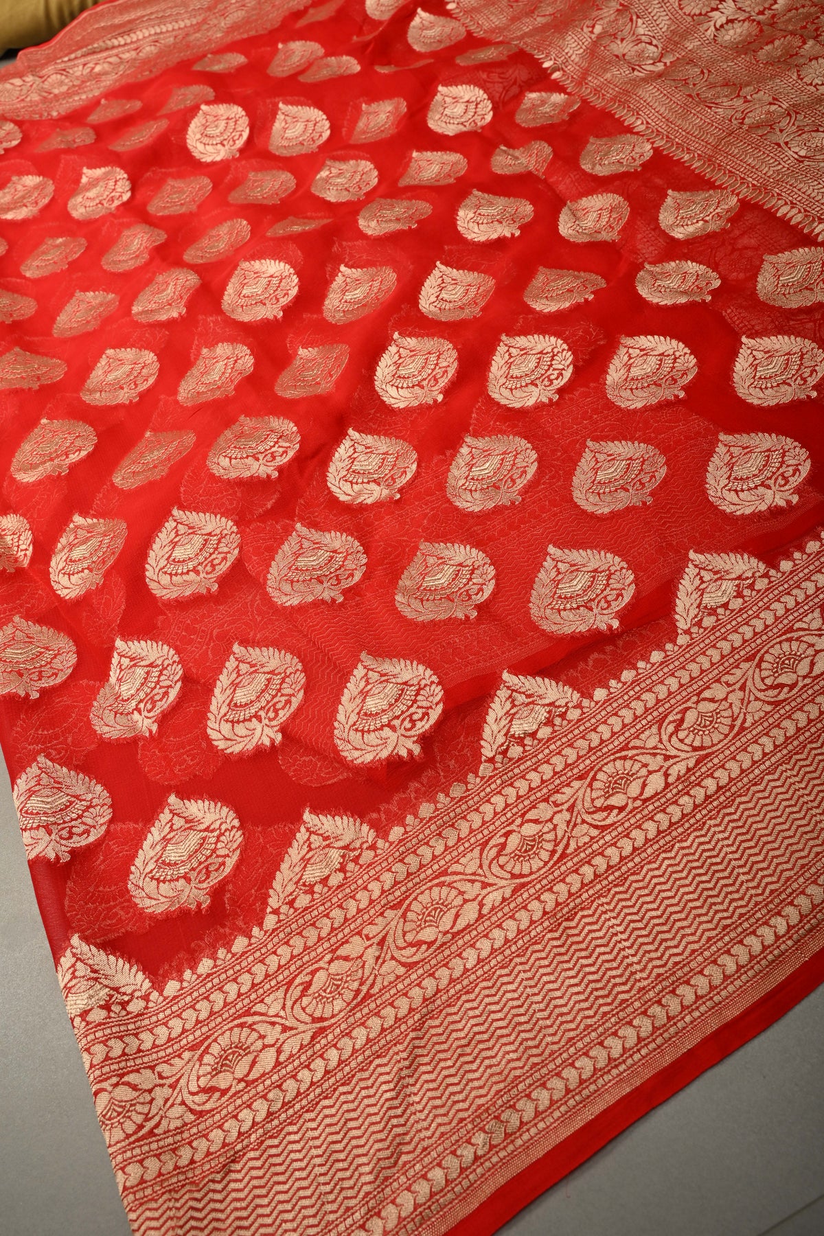 Exude elegance and charm with this Blood Red Banarasi Georgette Silk Saree, a perfect blend of traditional artistry and modern grace. Crafted from Banarasi georgette silk, the saree features a blood red hue that radiates sophistication.