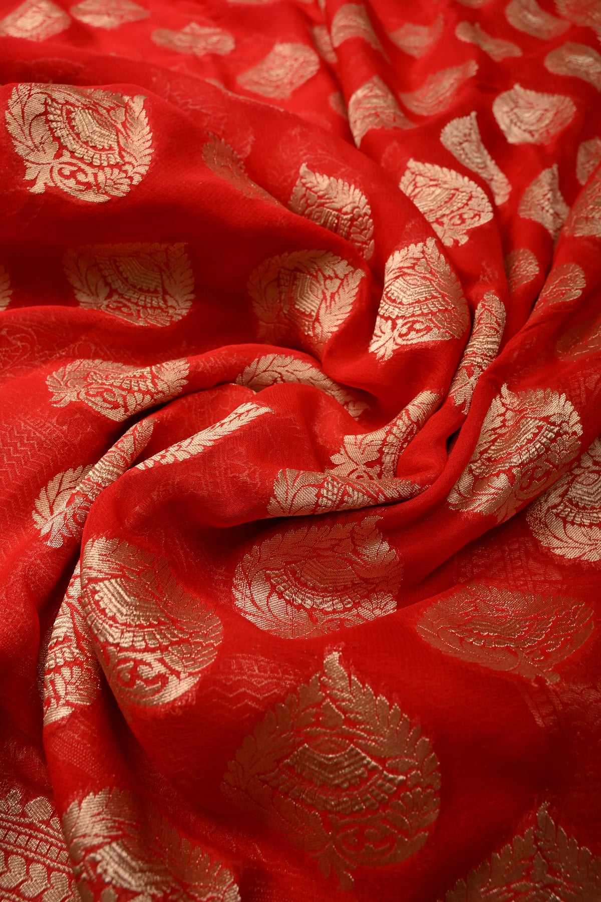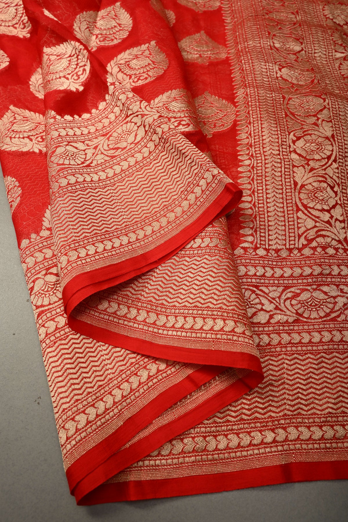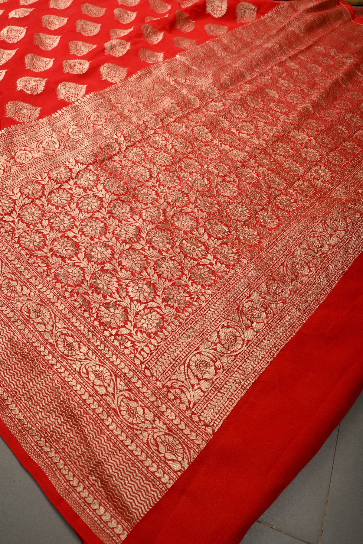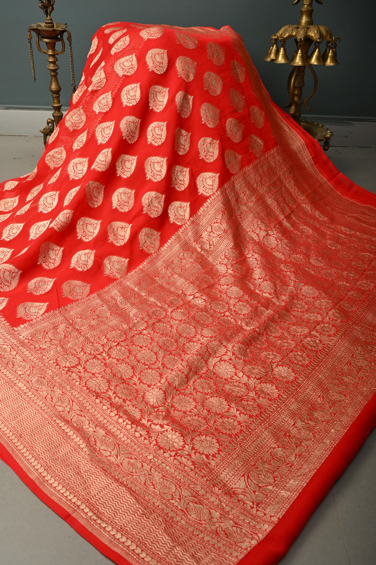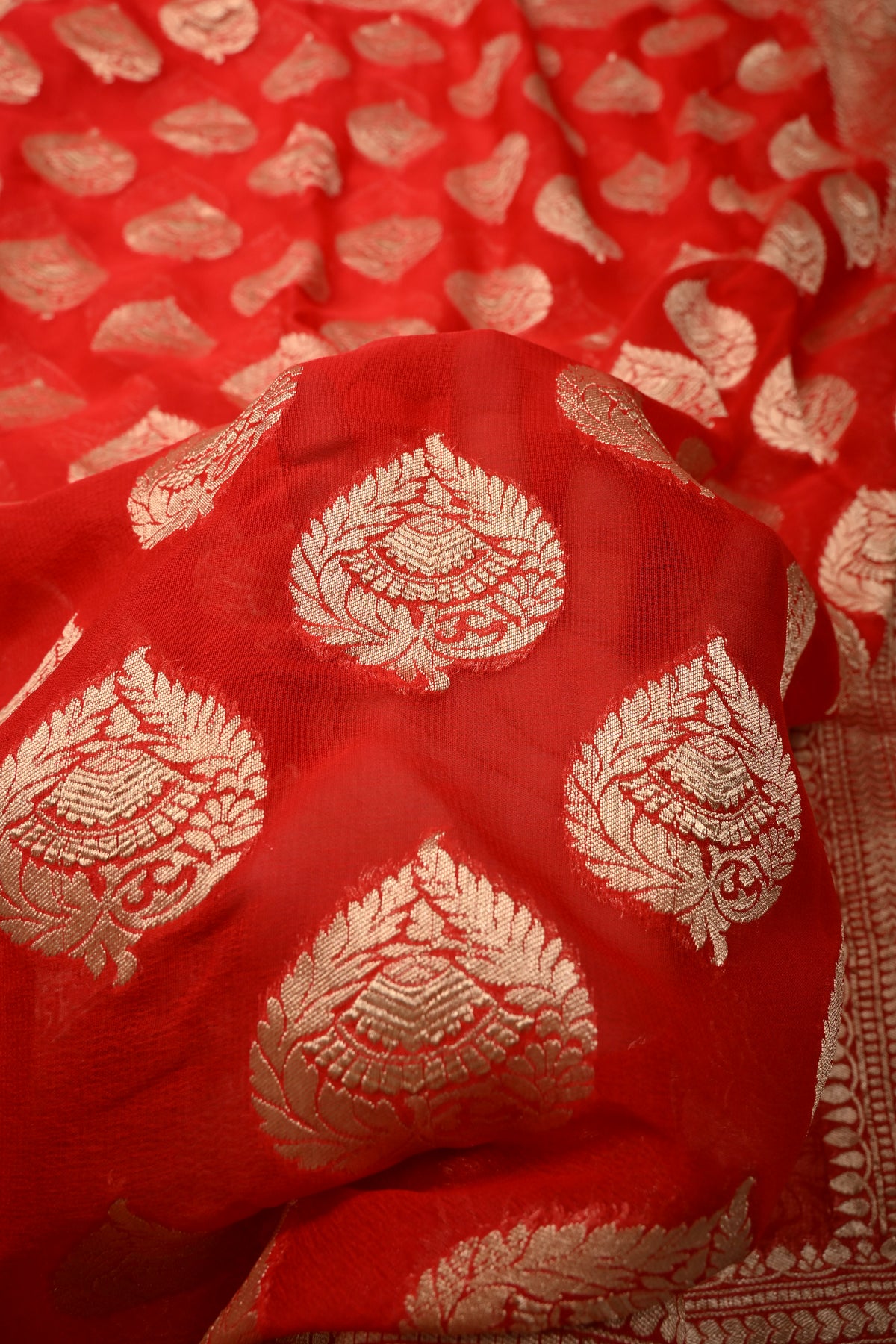 Exude elegance and charm with this Blood Red Banarasi Georgette Silk Saree, a perfect blend of traditional artistry and modern grace. Crafted from Banarasi georgette silk, the saree features a blood red hue that radiates sophistication.