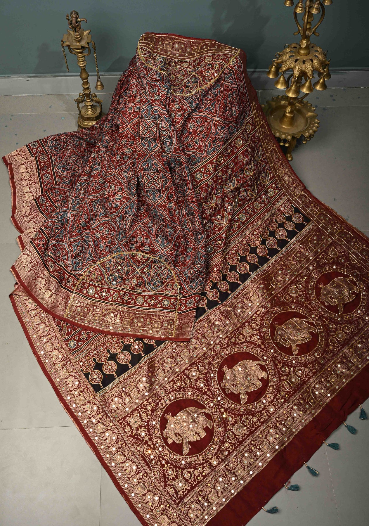 The blood red base is beautifully adorned with Ajrakh hand block prints, showcasing timeless heritage motifs. Intricate hand embroidery, enhanced with delicate sequins and cutdana work, adds a soft shimmer and dimensional texture, making the saree perfect for festive celebrations, evening occasions, and special gatherings. This piece is an exquisite choice for those who appreciate handcrafted detail with a modern, elegant finish.