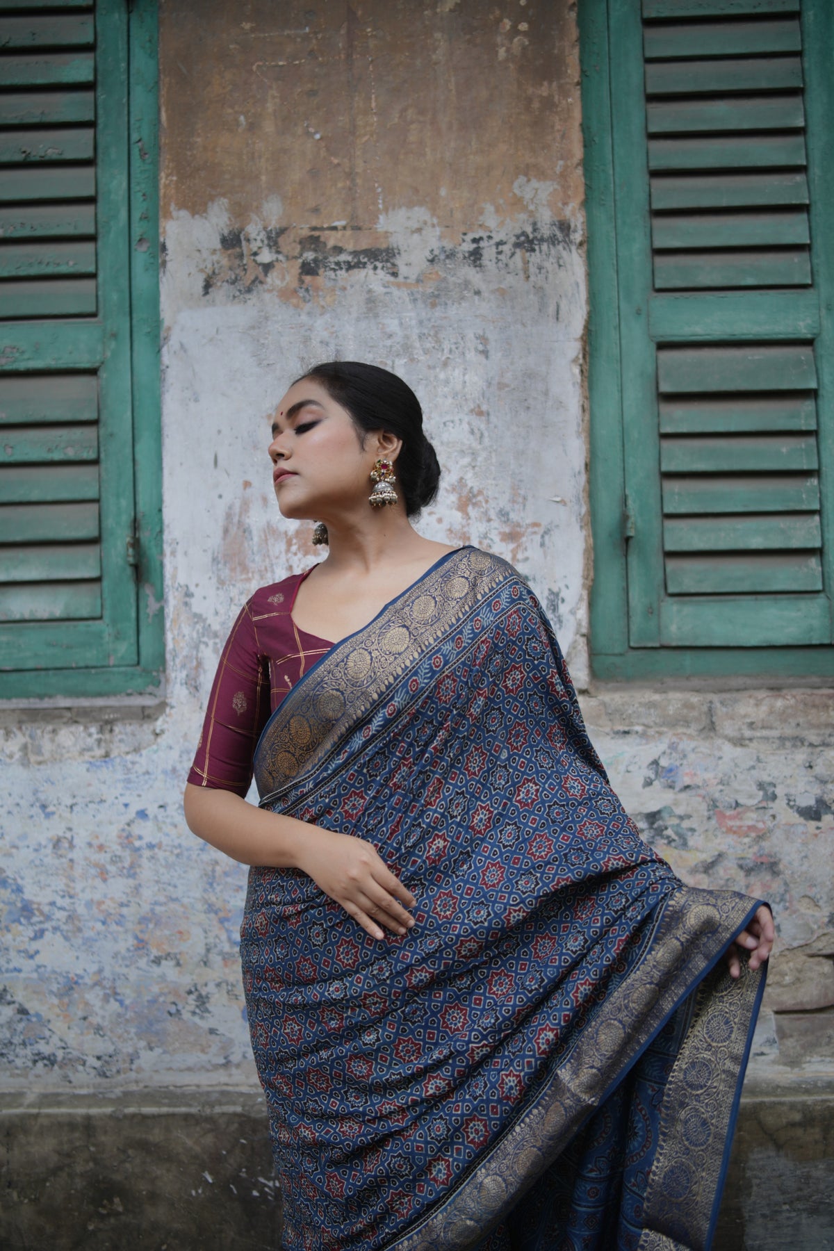 The Blue Ajrakh Hand Block Print on Dola Silk Saree with Fancy Zari Border is a stunning fusion of rich textile tradition and elegant design. Crafted from dola silk, this saree features authentic Ajrakh hand block prints in deep blue hues, showcasing intricate geometric and floral patterns native to this ancient art form. The saree is beautifully accentuated by a fancy zari border, adding a touch of opulence and shimmer that perfectly complements the bold prints. Ideal for festive occasions, weddings, and special celebrations, this saree blends heritage artistry with sophisticated charm.