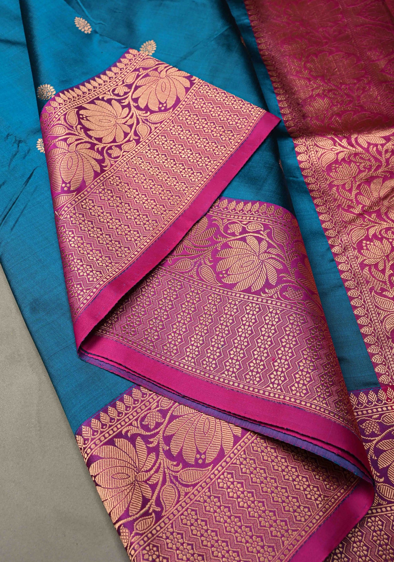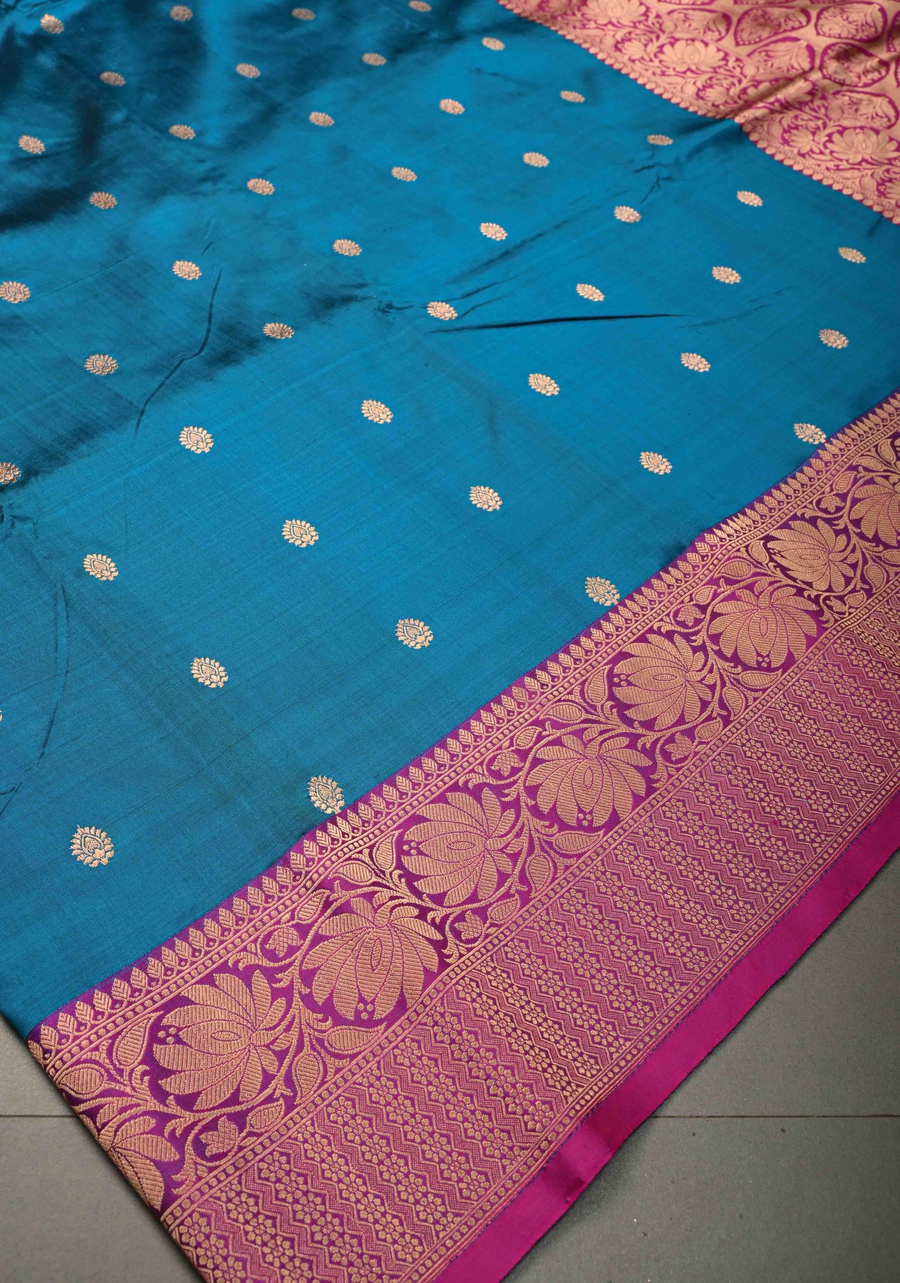 The blue body is beautifully adorned with floral zari buttas woven delicately across the saree, adding a subtle shimmer and charm. Enhancing its regal appeal is the contrast zari border, which frames the saree with a striking yet elegant finish.