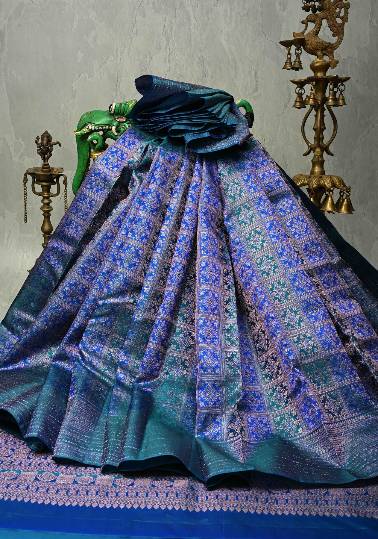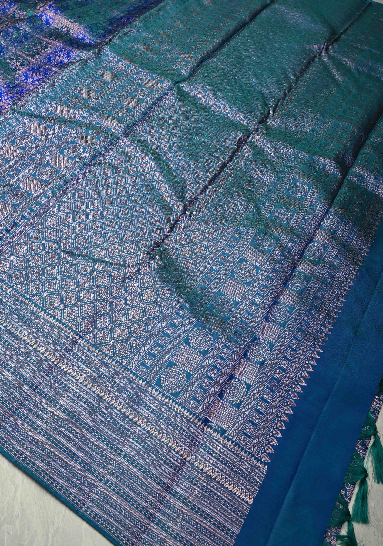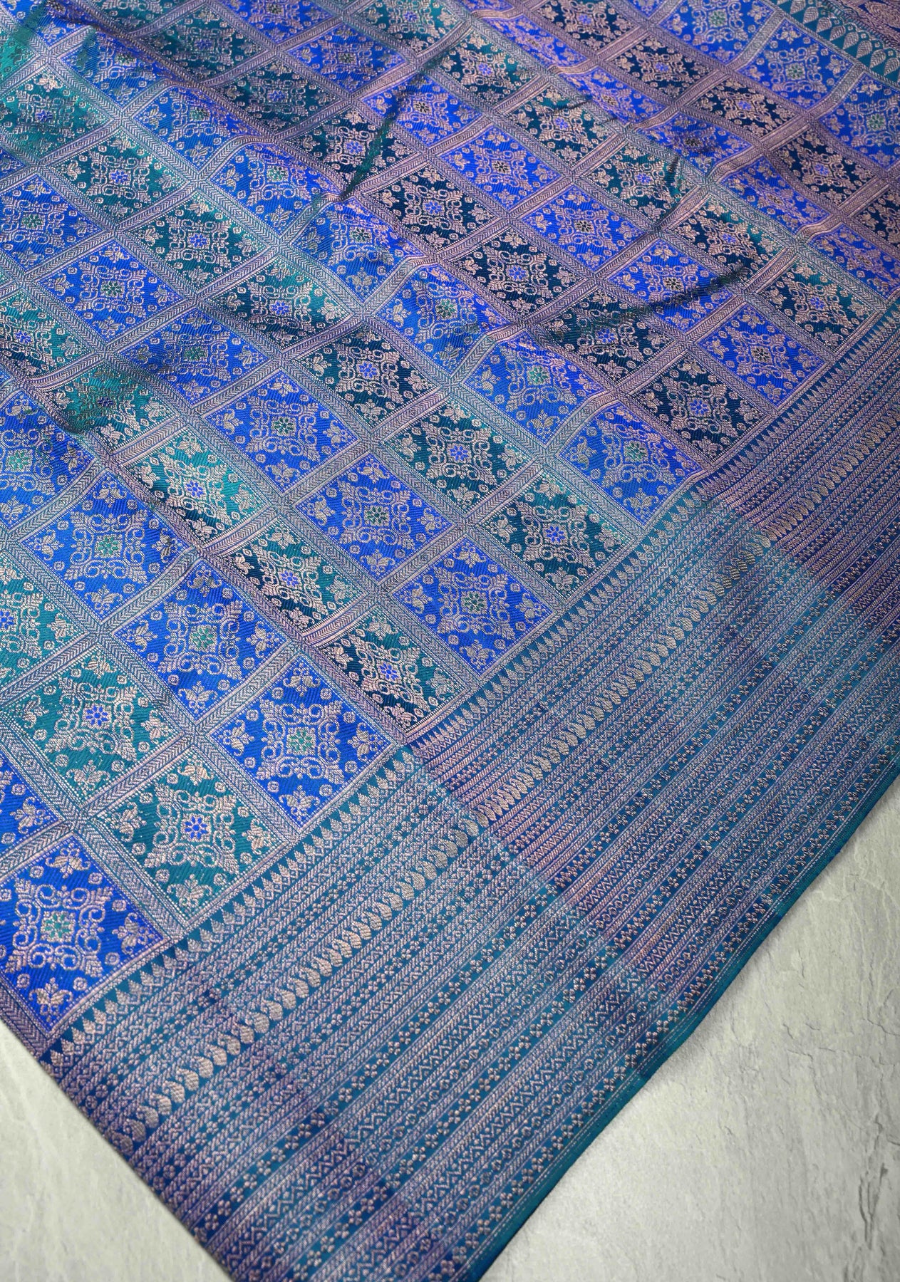 The saree features an intricate Meenakari Patola design brocade, adding vibrant artistry, texture, and detailing to the body. A wide zari border frames the saree, enhancing its grandeur and creating a striking contrast with the blue-green tones.