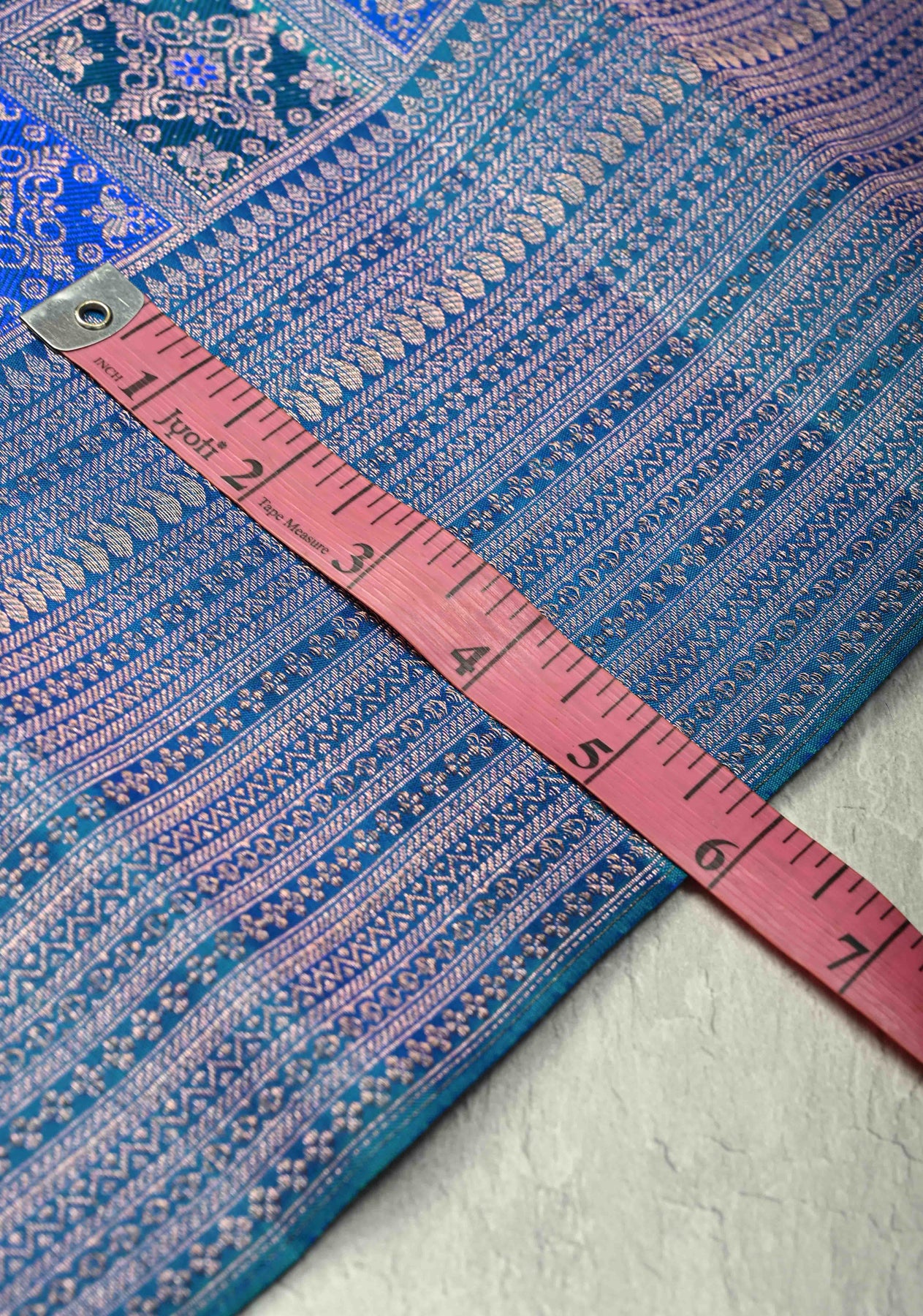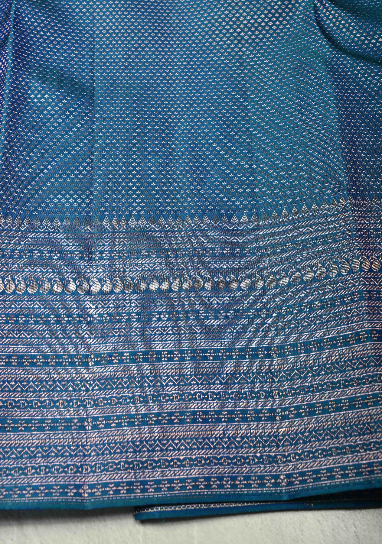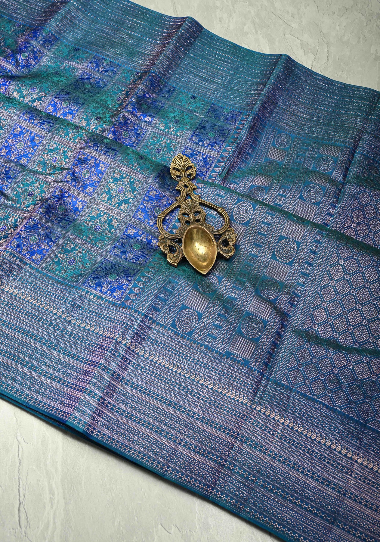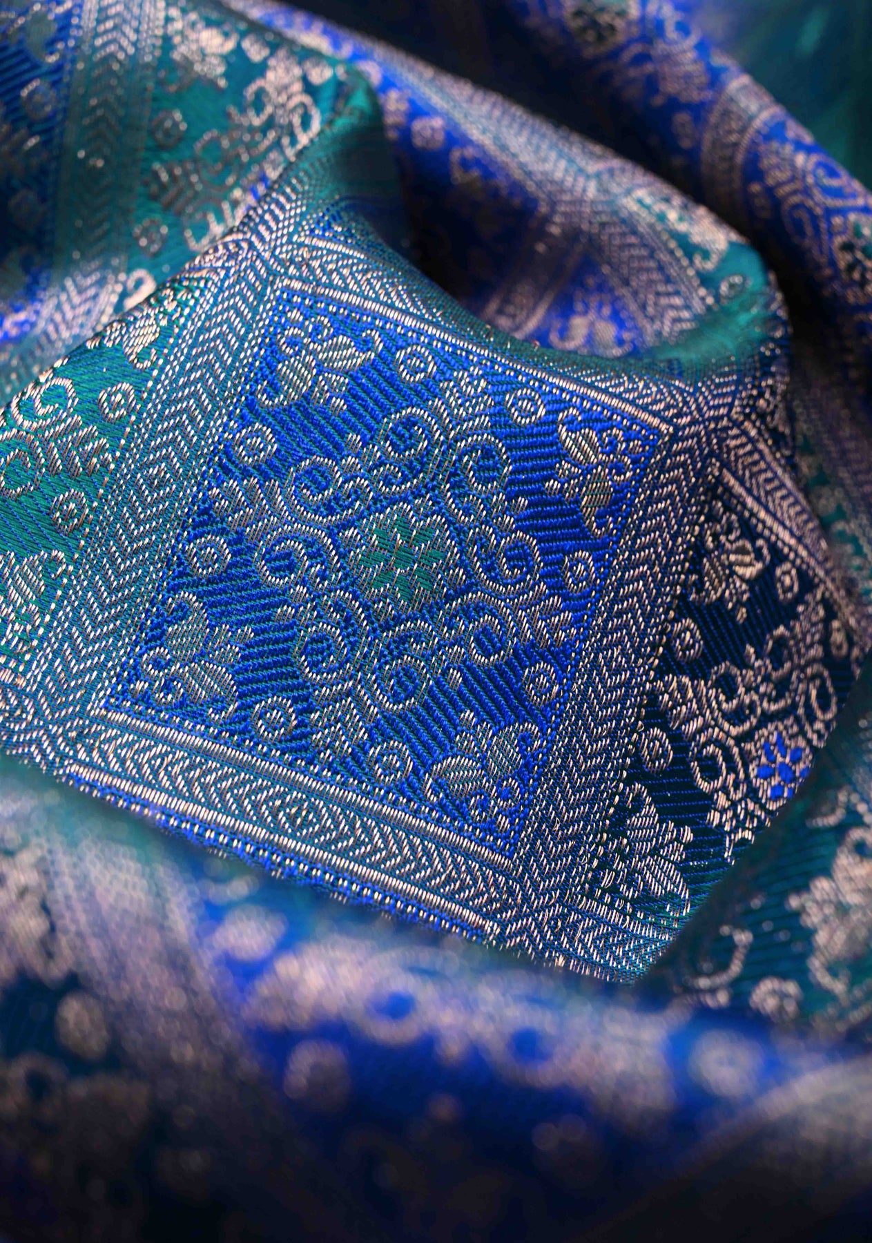Make a statement of timeless elegance with this Blue-Green Kanjivaram Silk Saree, crafted from silk known for its smooth texture, rich sheen, and graceful drape. Perfect for weddings, festive celebrations, and traditional occasions, this saree embodies sophistication and heritage craftsmanship.