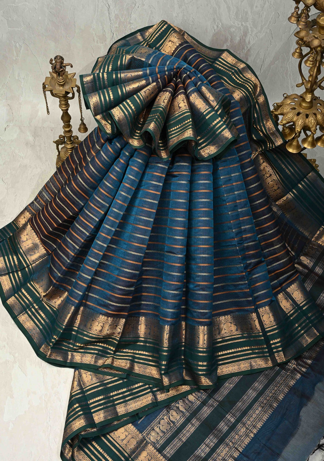 This deep blue Kanchi silk-cotton saree is the kind of classic you’ll keep reaching for — rich in texture, elegant in colour, and woven with love. The body features the traditional Veldhari design, lending the drape a beautiful rhythm and sheen. The dual-shade blue and green borders glow with intricate motifs of Annapakshi and Rudraksham, symbolising prosperity, purity, and grace.