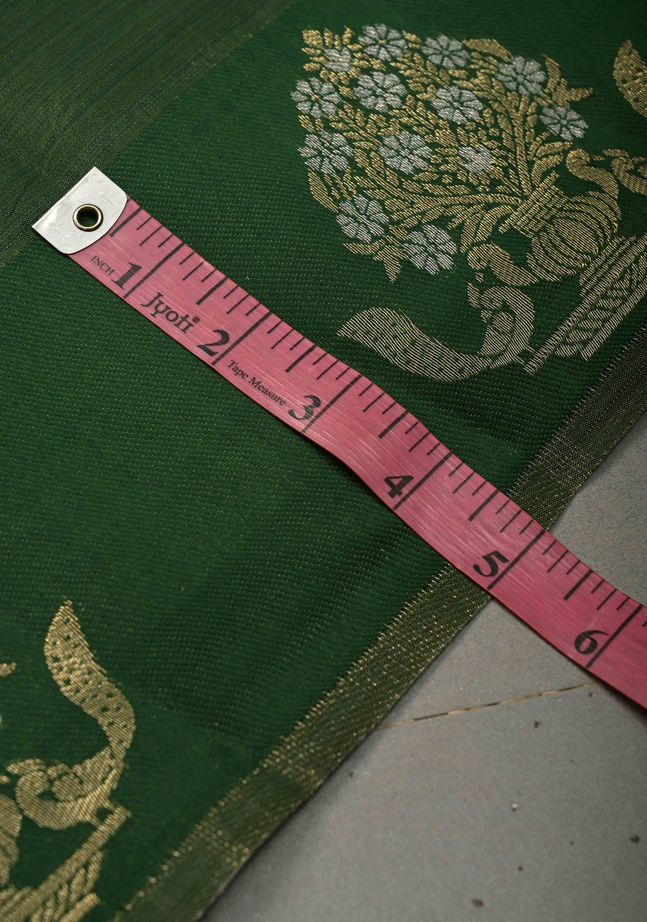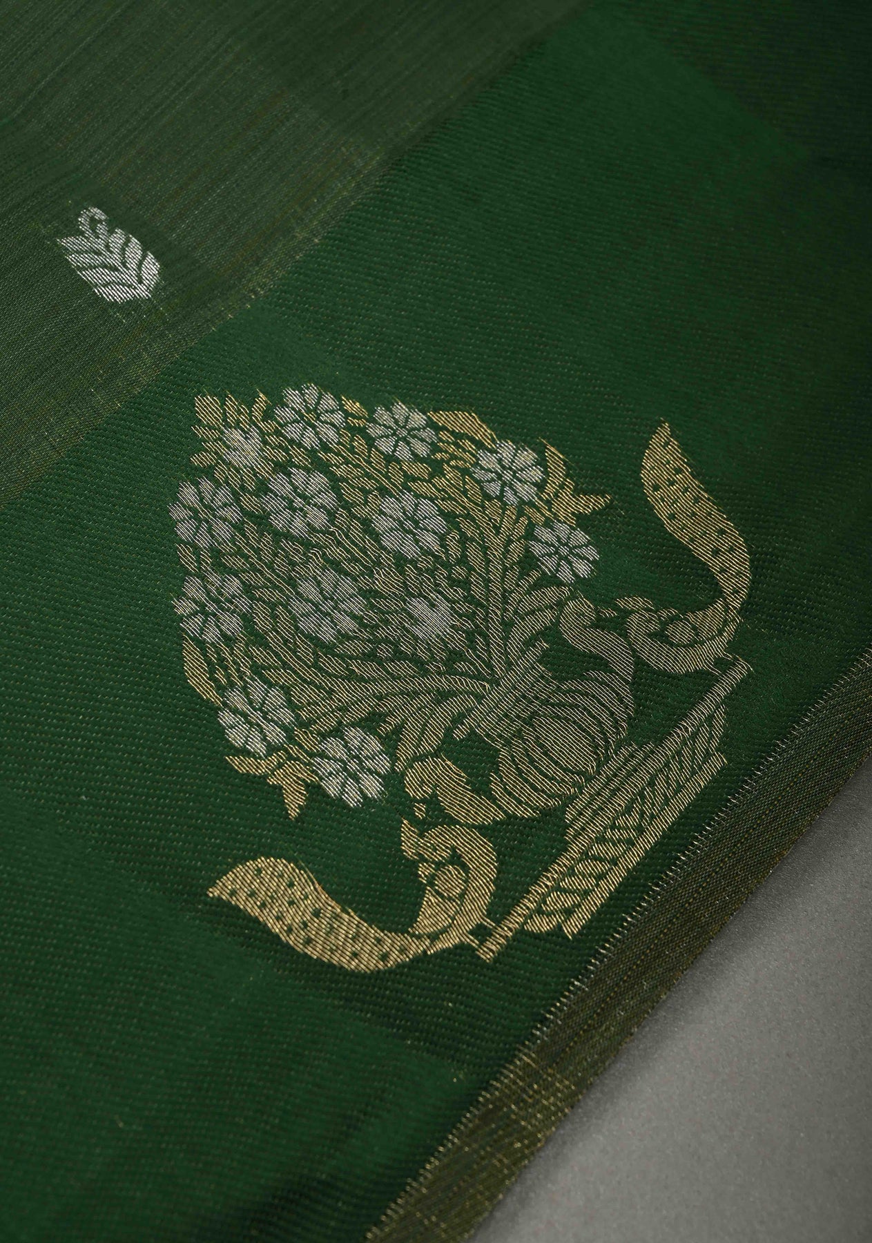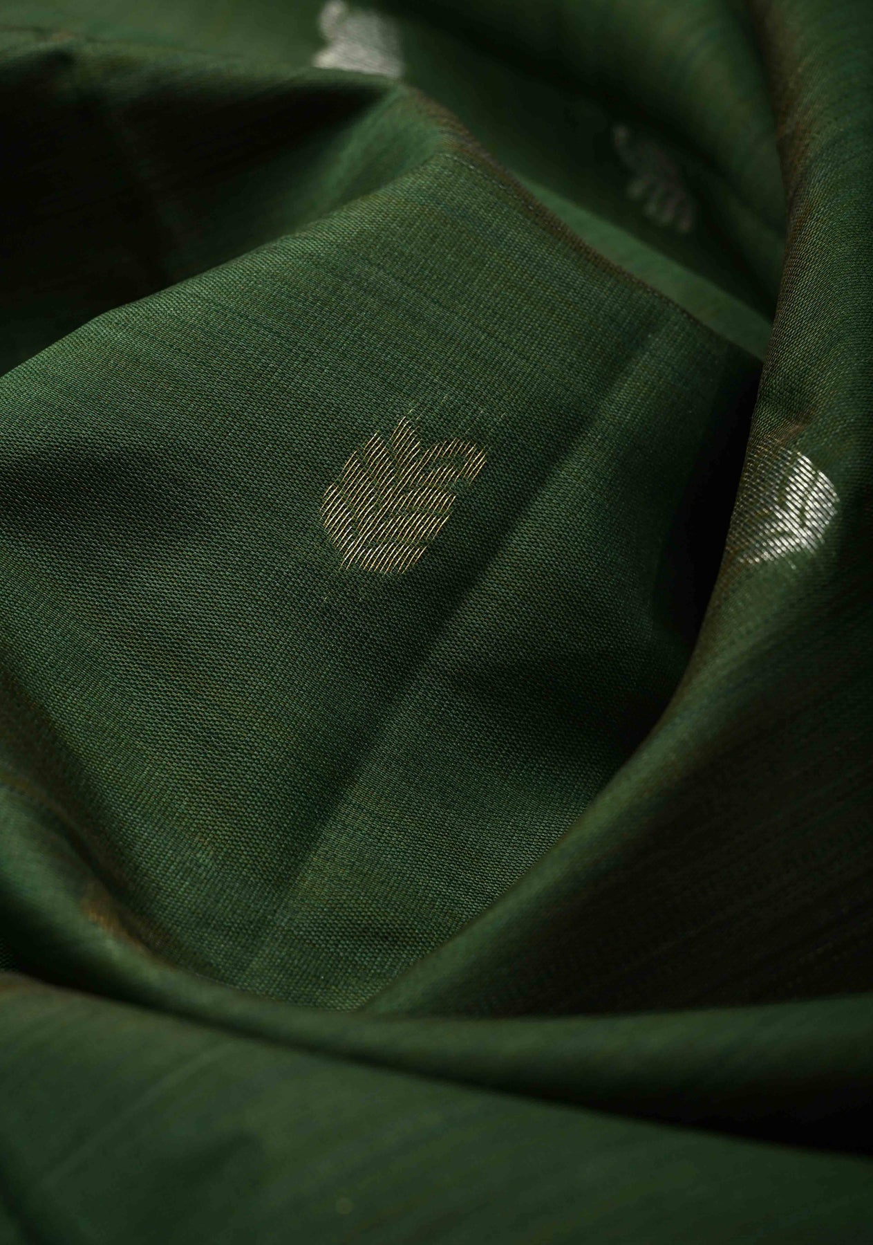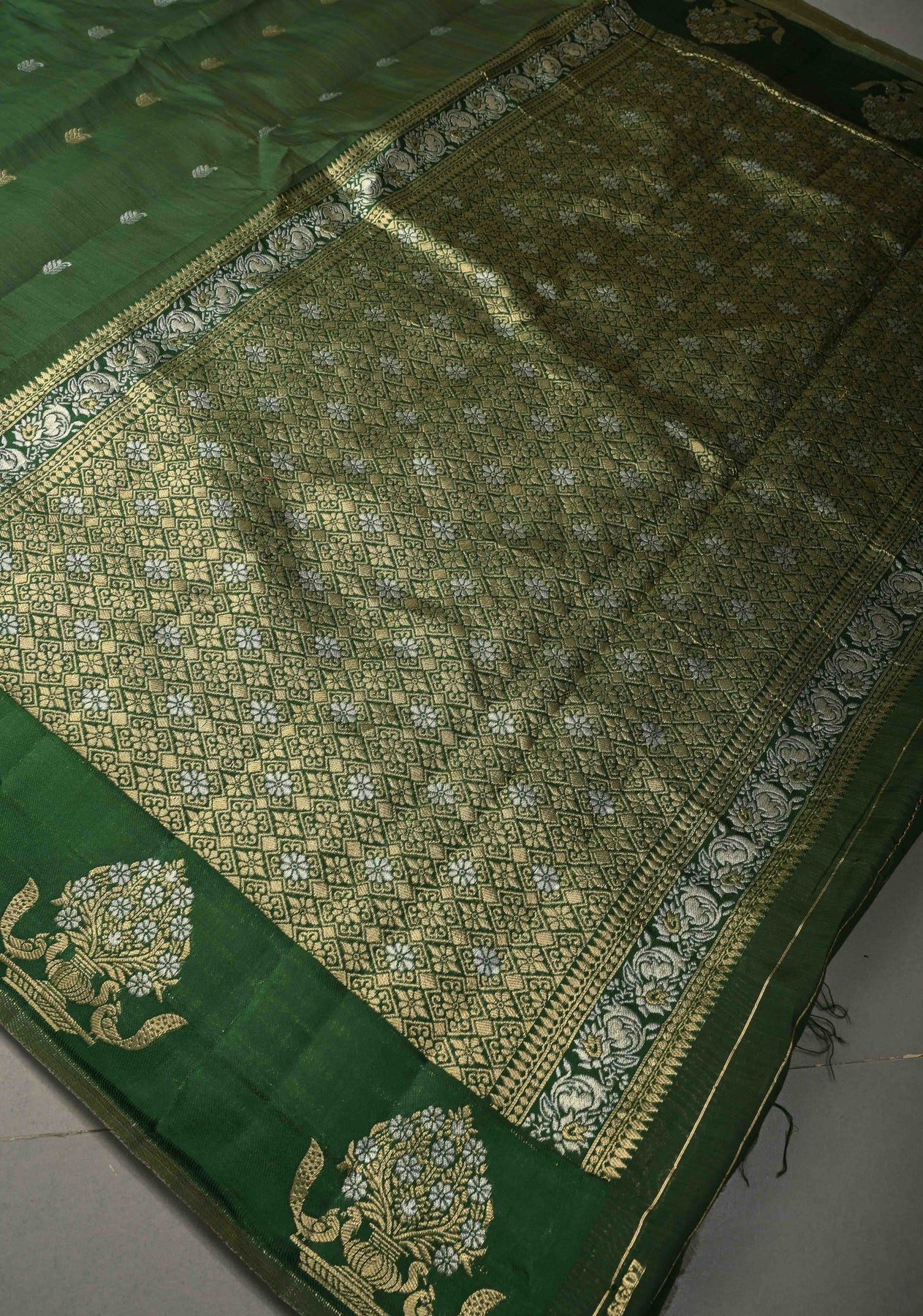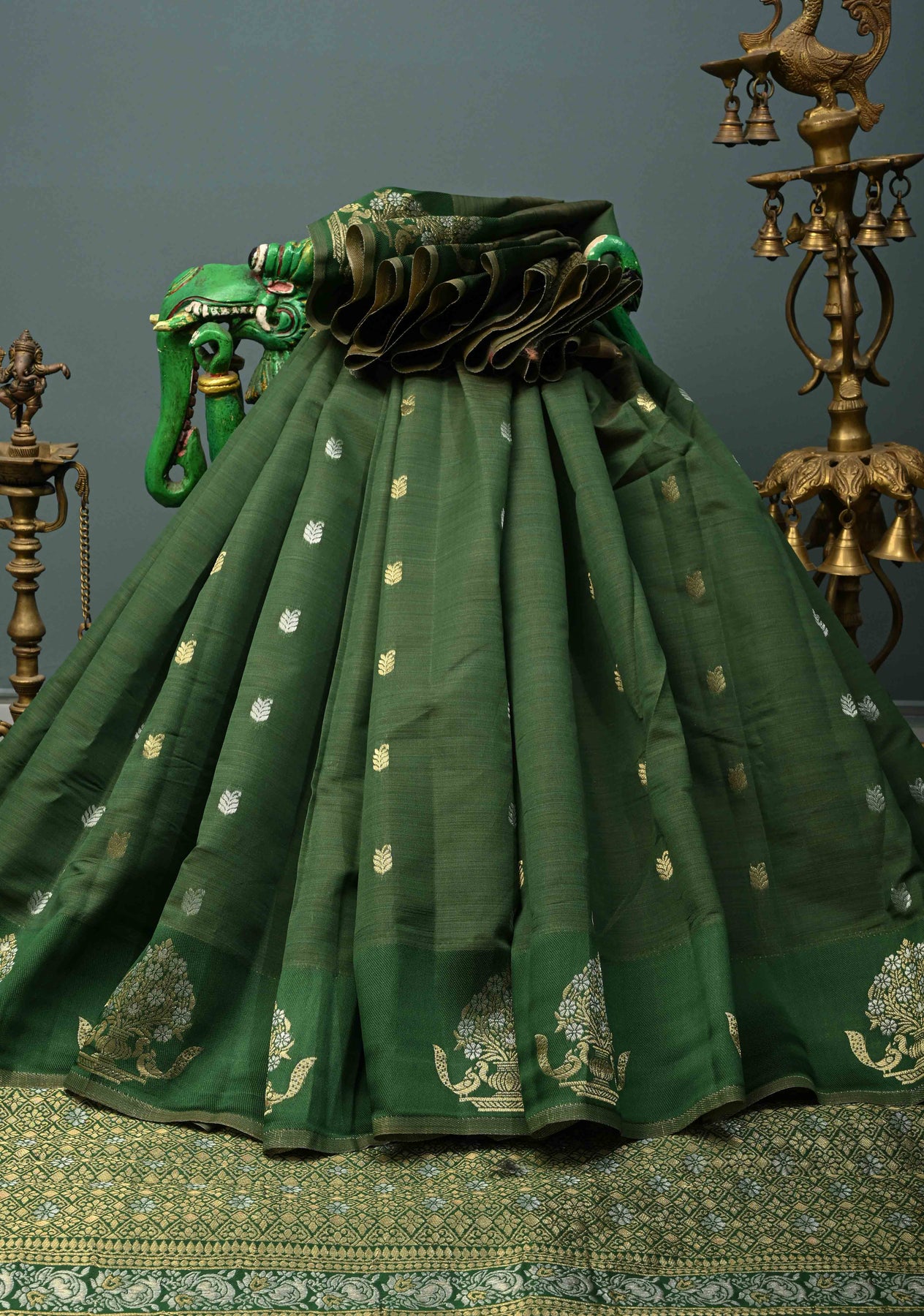 This bottle green Kanjivaram semi-silk saree exudes sophistication and timeless beauty. The green fabric provides a perfect backdrop for the intricate gold and silver buttas that delicately embellish the saree, creating a luxurious shimmer. The saree is further enhanced by distinct zari motifs woven along the border, adding a regal touch of traditional craftsmanship. The semi-silk fabric drapes gracefully, offering a smooth, elegant fit for a variety of occasions. Ideal for weddings, formal events, or festive celebrations, this saree effortlessly combines classic Kanjivaram style with modern charm.