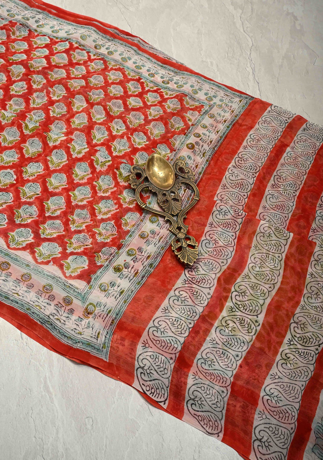Make a bold yet elegant statement with this Brick Red Georgette Saree, beautifully highlighted with traditional Sanganeri hand block prints. Crafted from lightweight georgette fabric, the saree offers a soft, fluid drape that ensures comfort and effortless grace. The rich brick red hue enhances the intricate hand block motifs, celebrating the timeless artistry of Sanganer craftsmanship. Ideal for festive gatherings, daytime functions, and cultural occasions, this saree blends heritage charm with contemporary appeal.