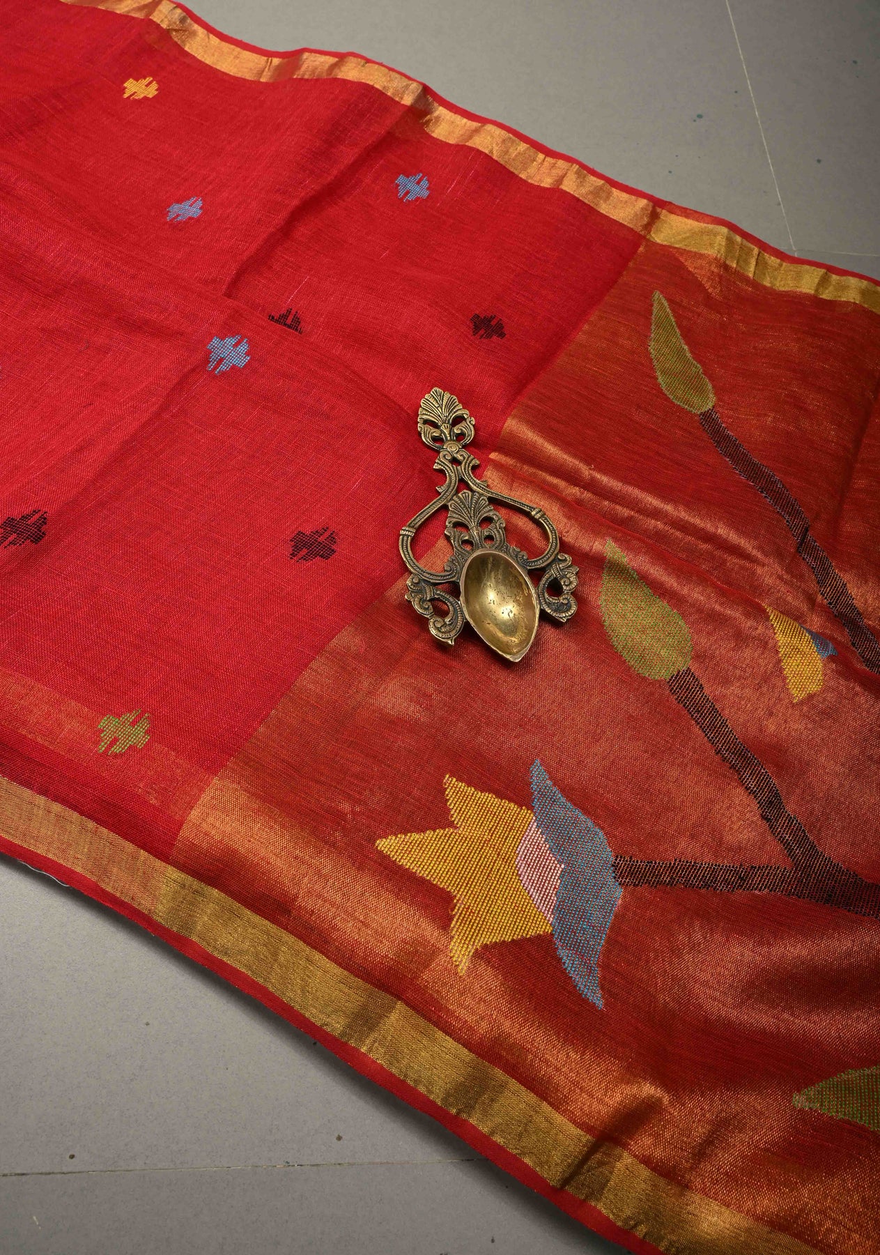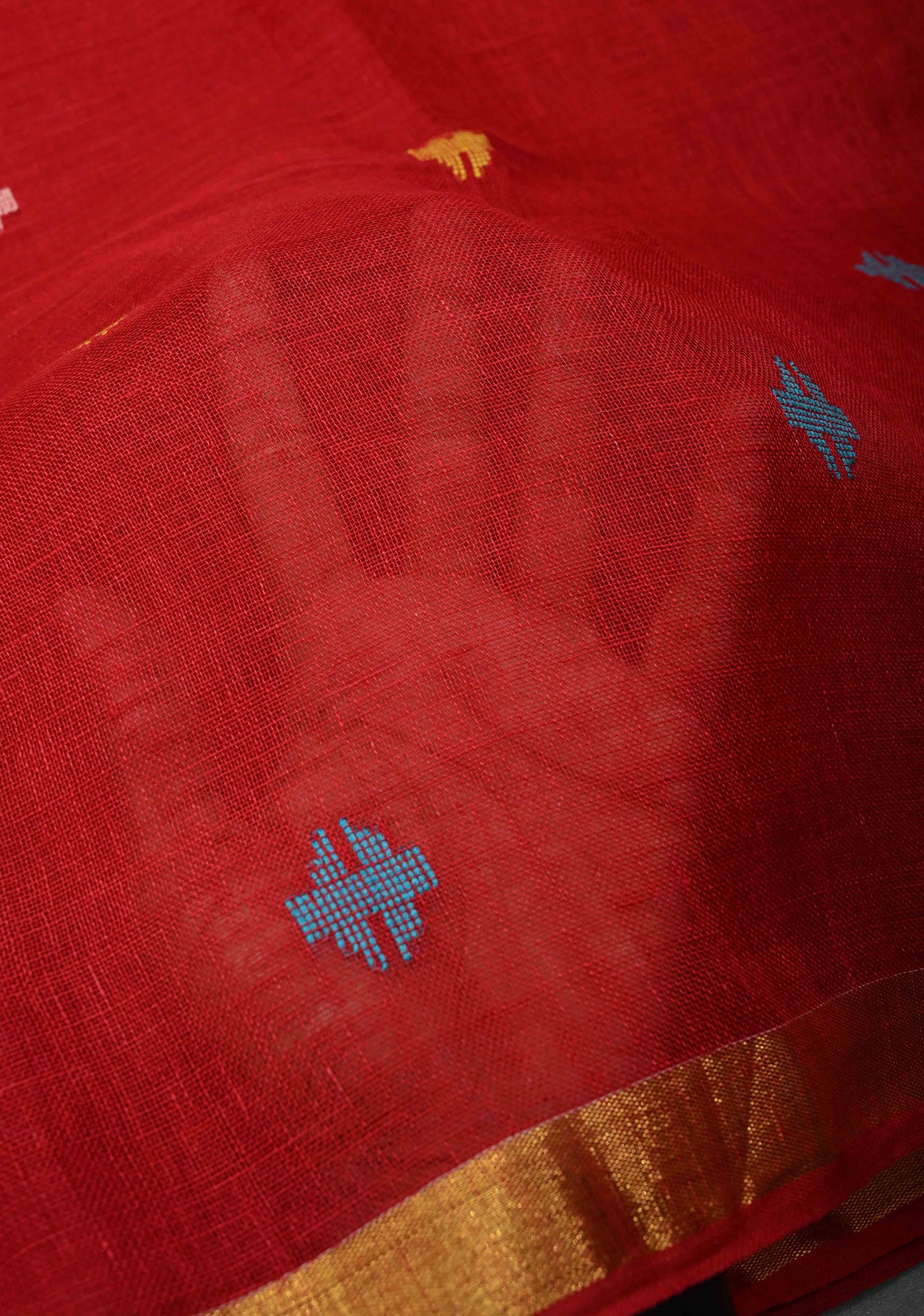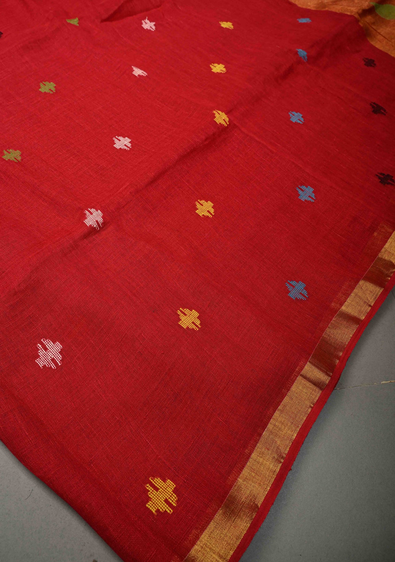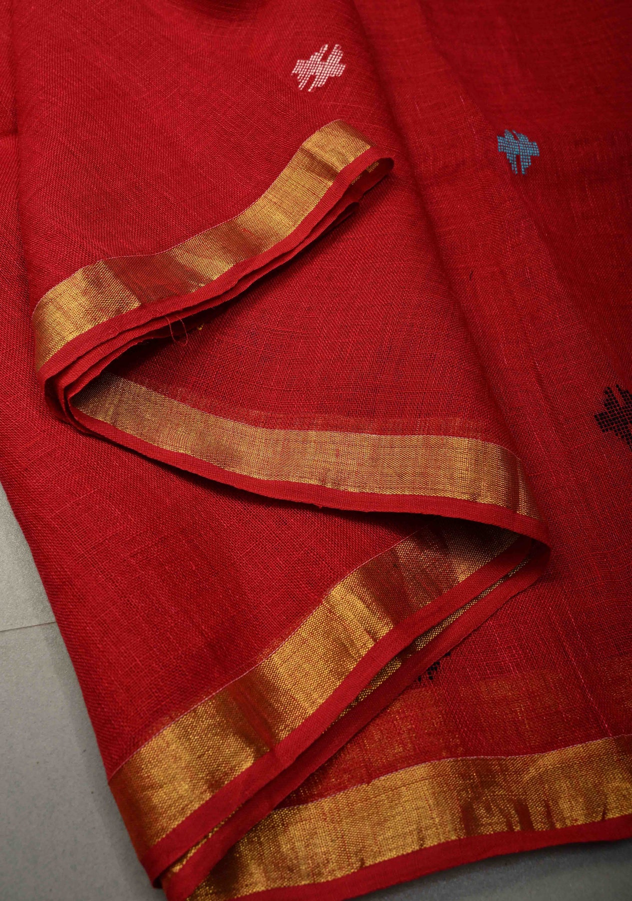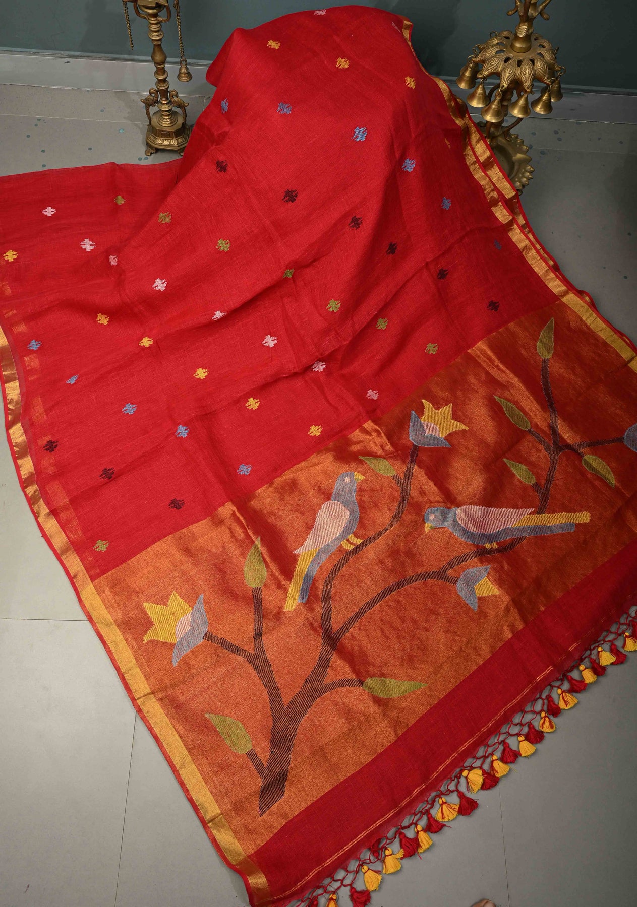 Bright Red Meenakari Thread Buttas on Linen Saree with Paithani Pallu and Minimal Tissue Border