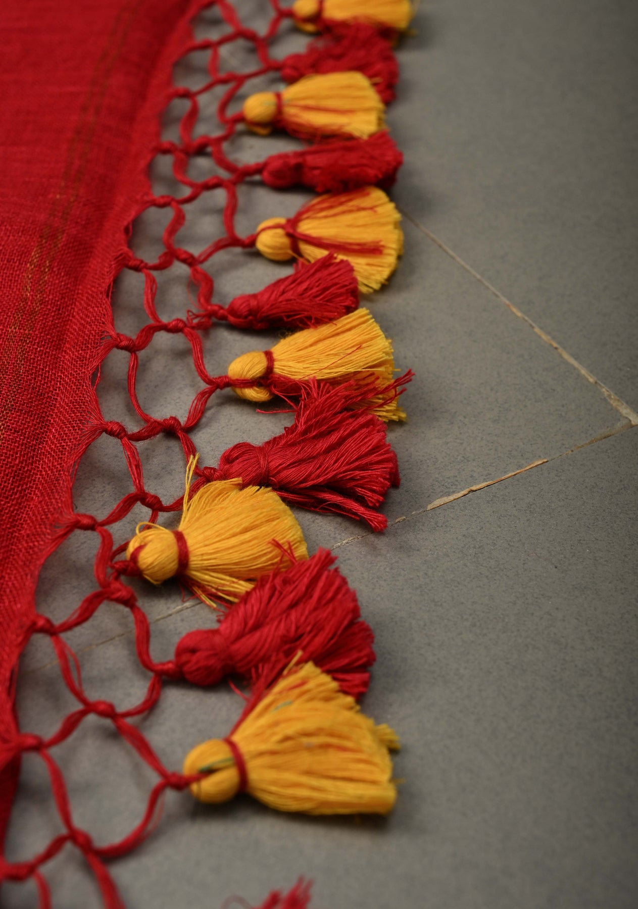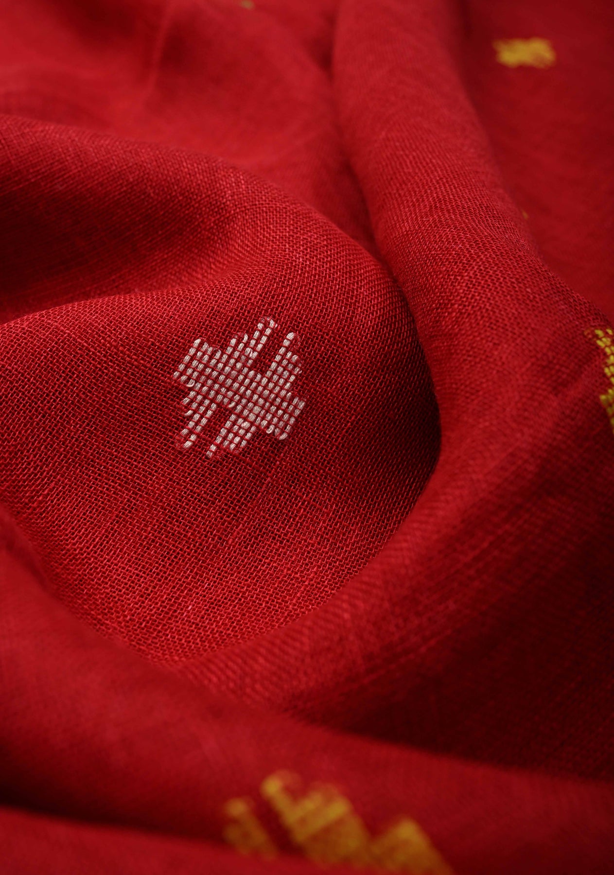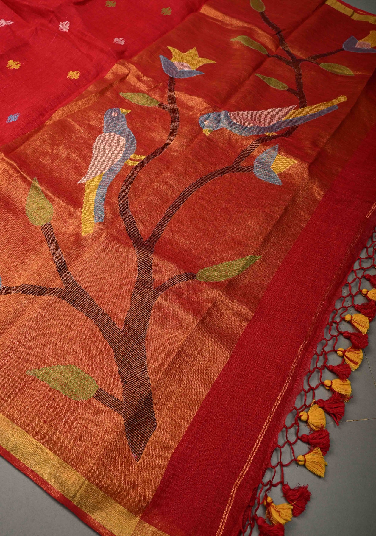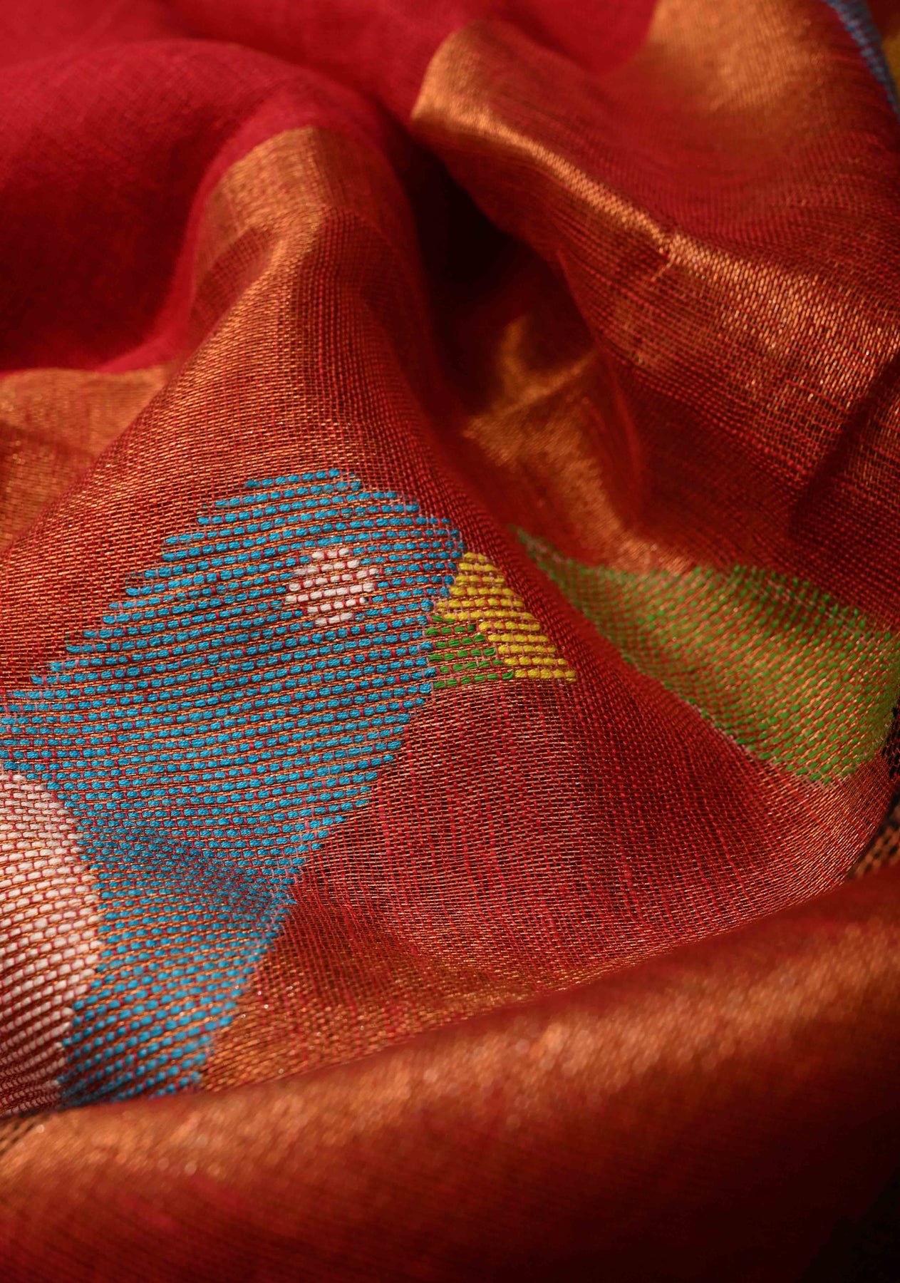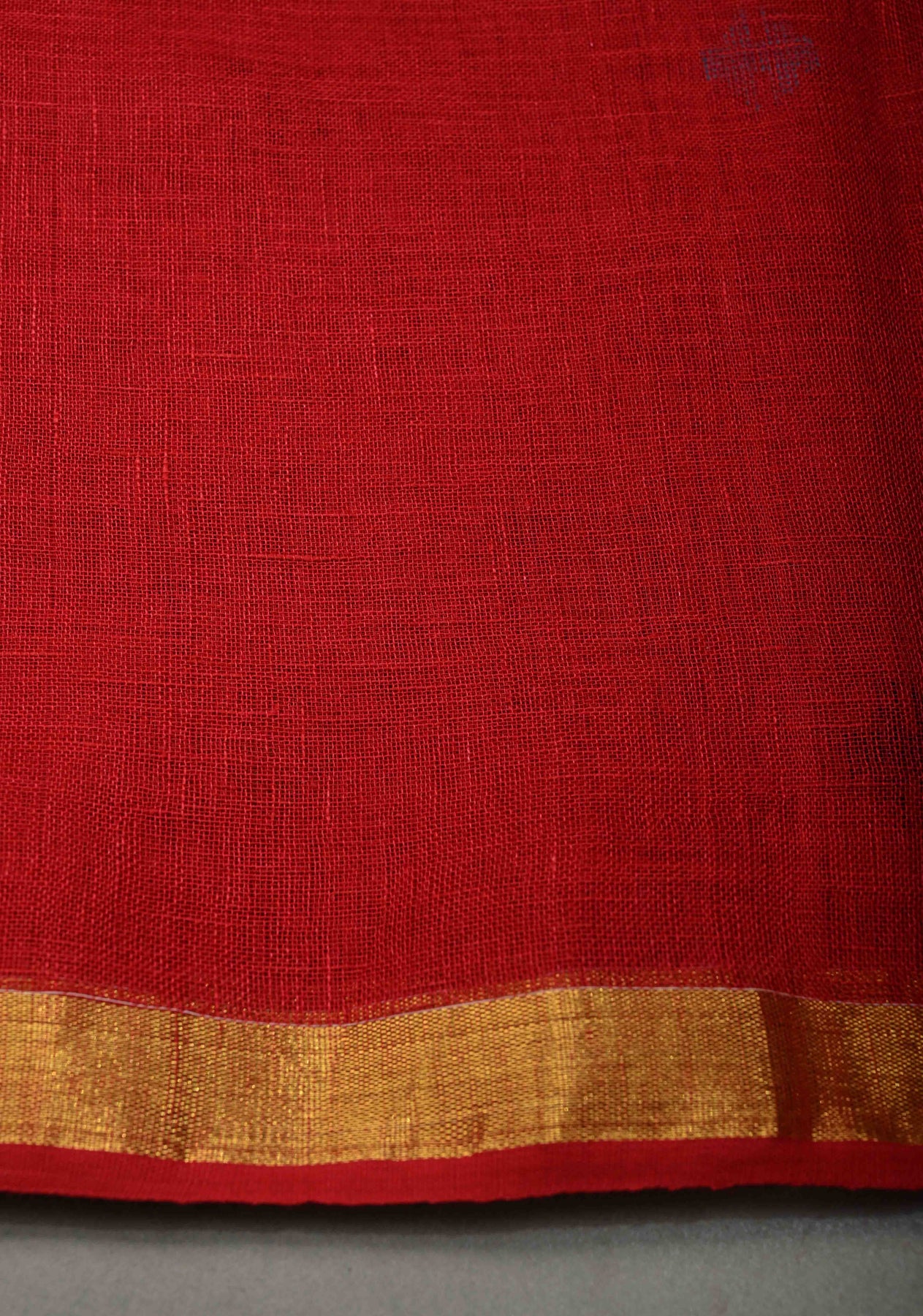 Bright Red Meenakari Thread Buttas on Linen Saree with Paithani Pallu and Minimal Tissue Border