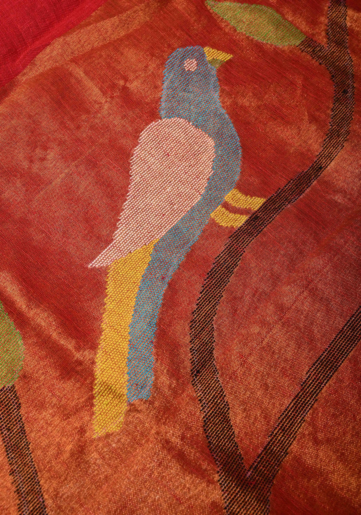 The striking kumkum red body is adorned with delicate Meenakari thread buttas, adding intricate detail and refined charm. A richly woven Paithani-inspired pallu lends heritage elegance, while the minimal tissue border frames the saree with understated sophistication. Perfect for festive daytime celebrations, cultural gatherings, and semi-formal occasions, this saree reflects timeless beauty with a contemporary edge.