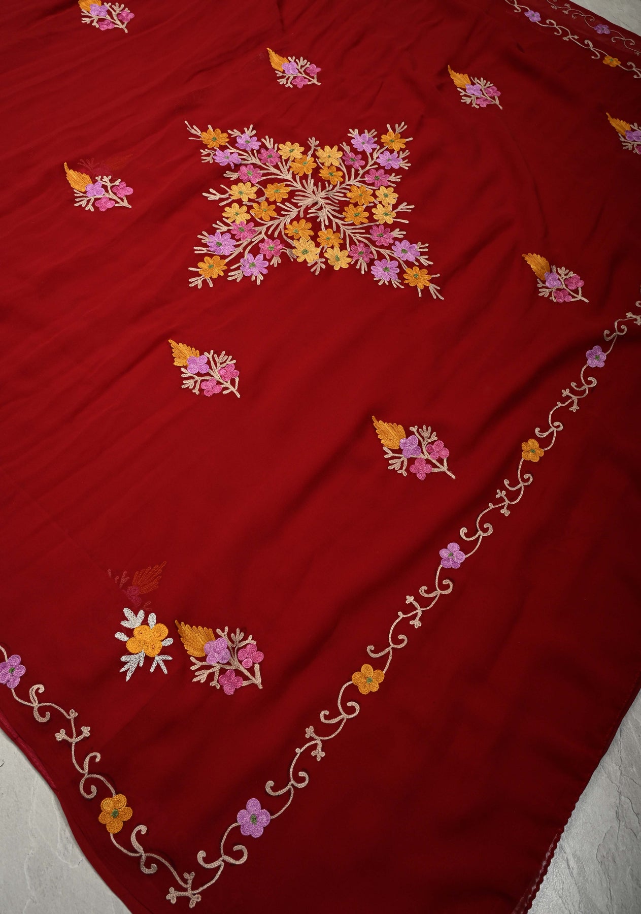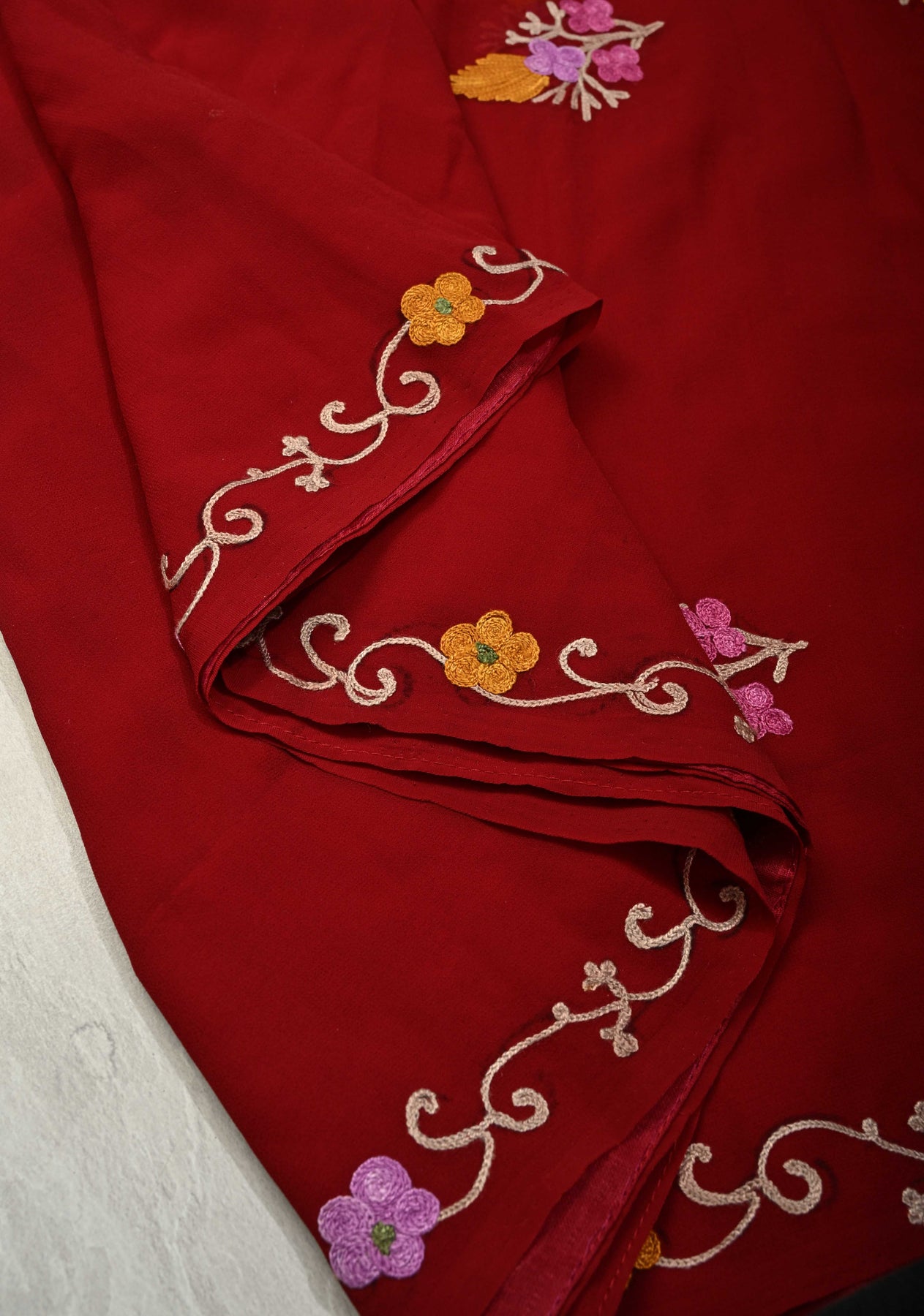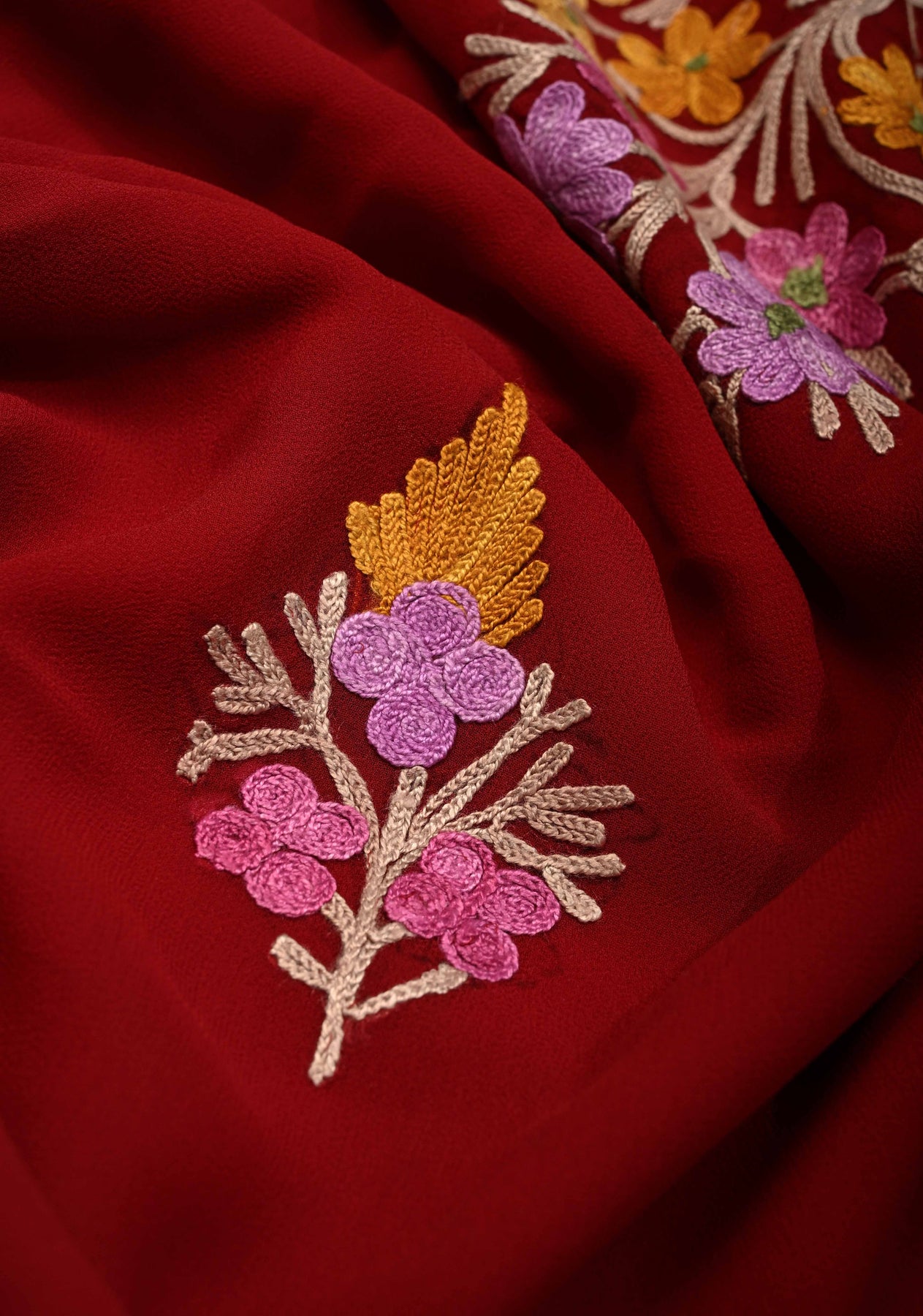 Experience timeless elegance with this Burgundy Kashmiri Aari Georgette Saree, adorned with exquisite floral embroidery crafted using traditional Kashmiri Aari techniques. Made from lightweight georgette fabric, the saree drapes gracefully, offering both comfort and sophistication. The deep burgundy hue enhances the intricate embroidery, making it perfect for weddings, festive occasions, and evening gatherings. A blend of heritage craftsmanship and contemporary style, this saree is ideal for those who appreciate artisanal elegance.