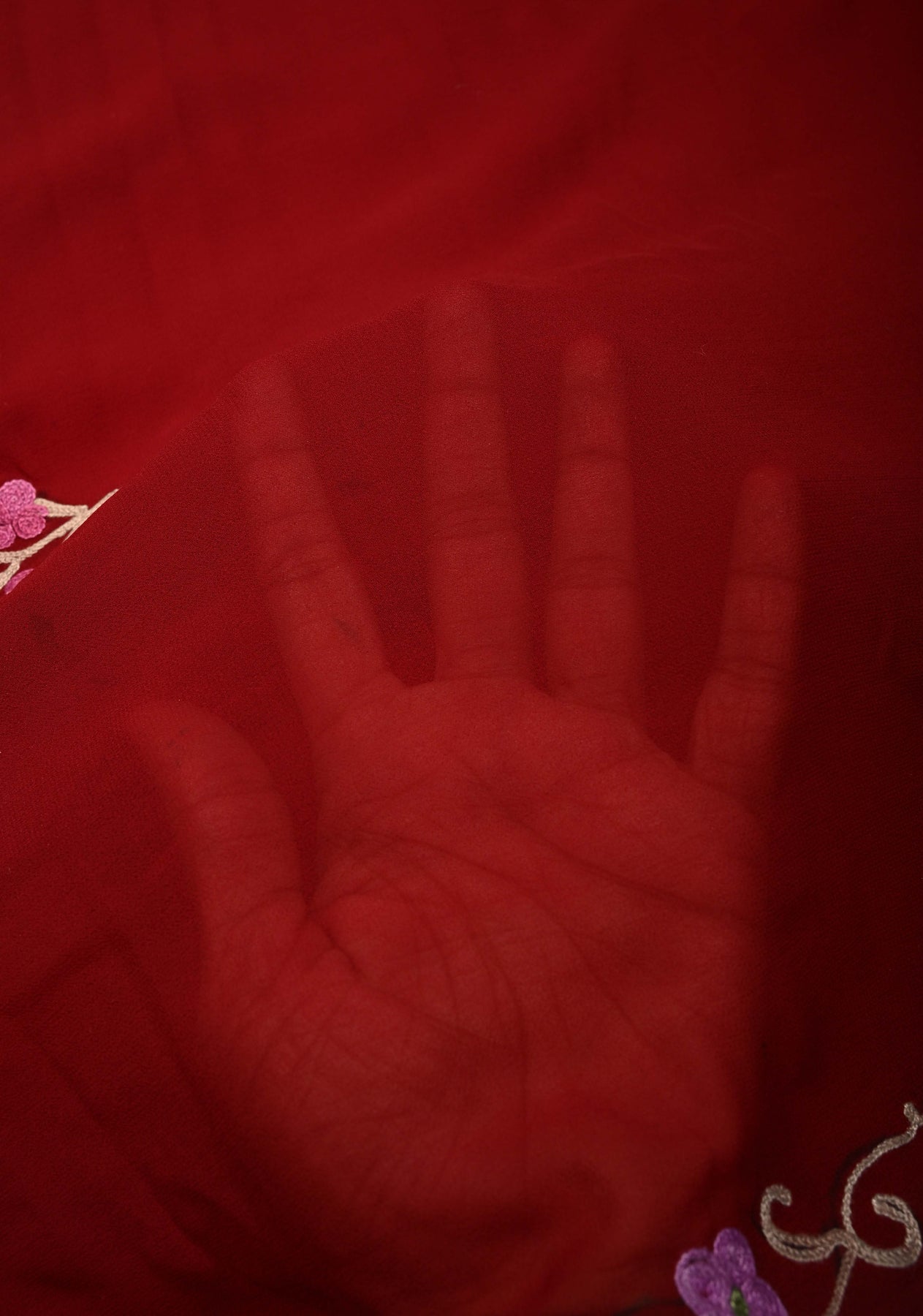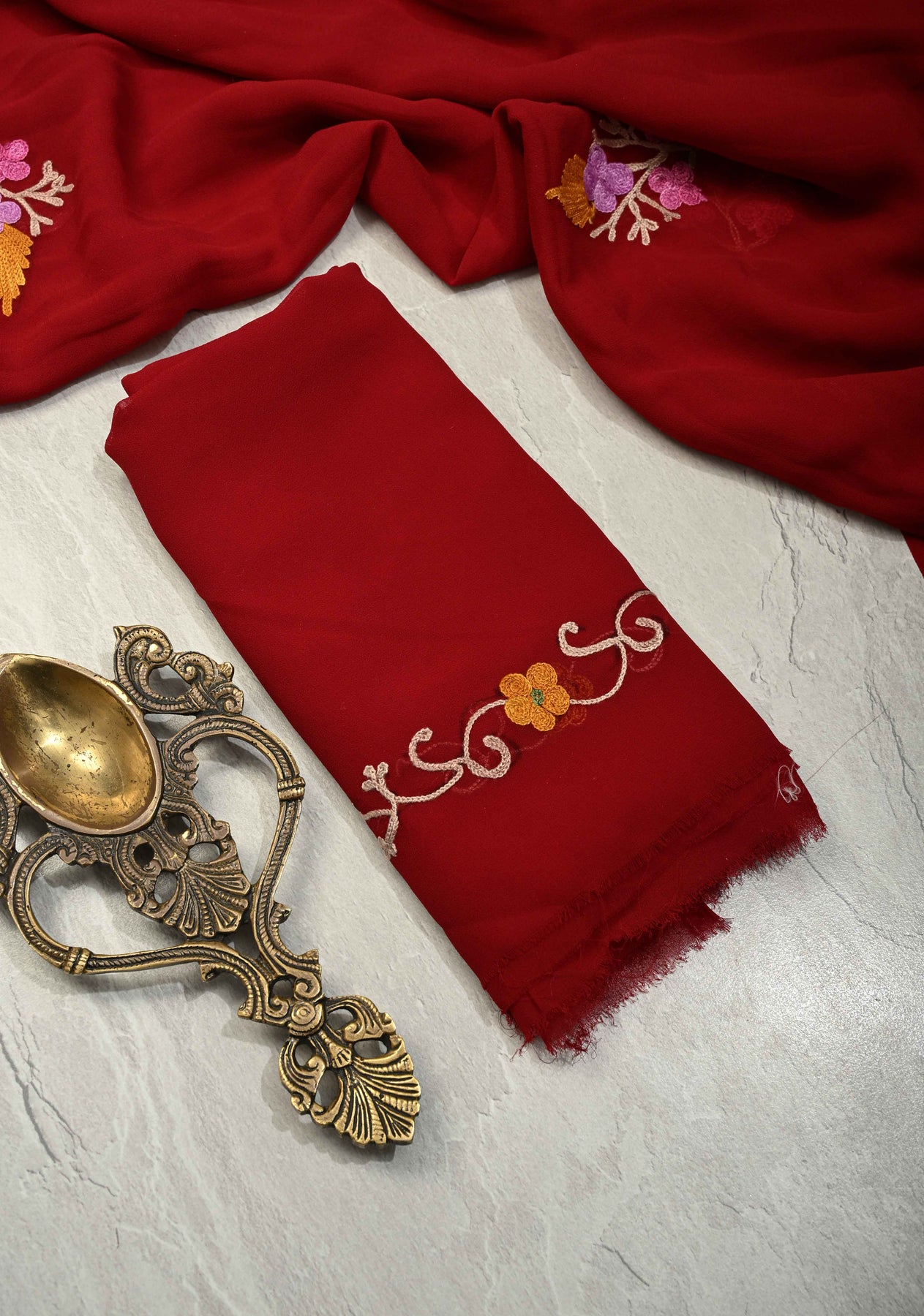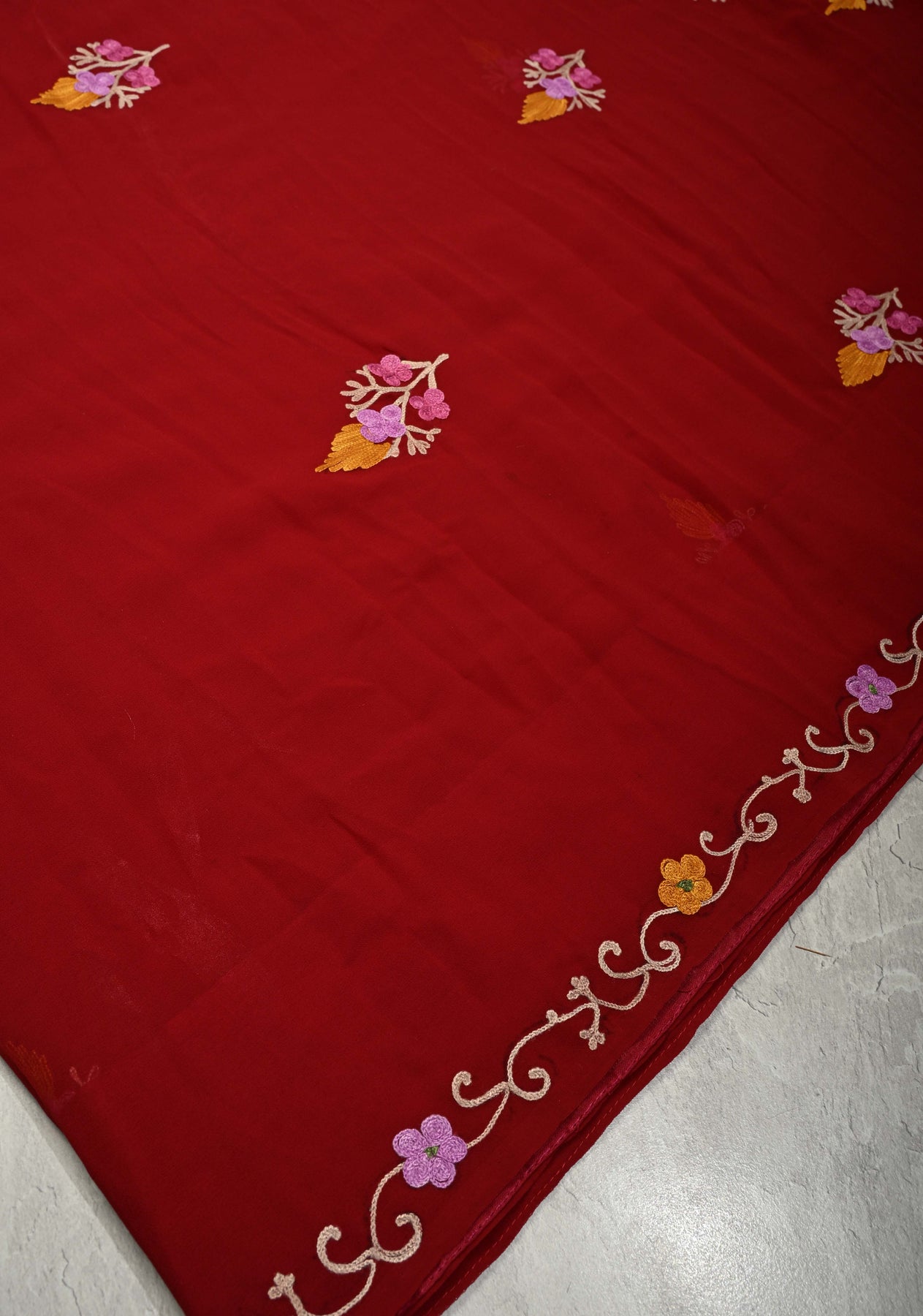 Experience timeless elegance with this Burgundy Kashmiri Aari Georgette Saree, adorned with exquisite floral embroidery crafted using traditional Kashmiri Aari techniques. Made from lightweight georgette fabric, the saree drapes gracefully, offering both comfort and sophistication. The deep burgundy hue enhances the intricate embroidery, making it perfect for weddings, festive occasions, and evening gatherings. A blend of heritage craftsmanship and contemporary style, this saree is ideal for those who appreciate artisanal elegance.