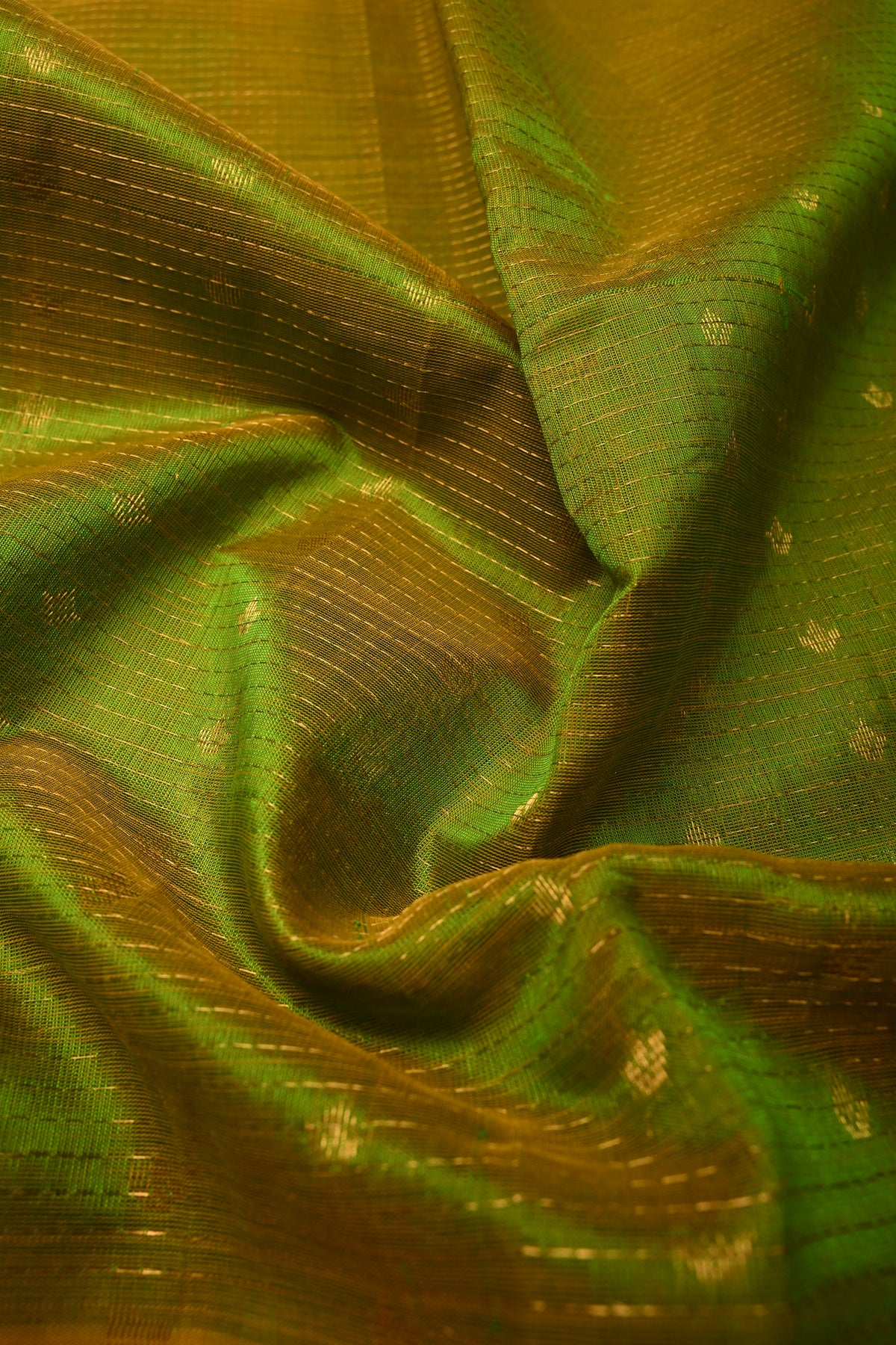 Brighten your ethnic wardrobe with this Chartreuse Dual Tone Vairaoosi Zari Stripes Kanchi Silk Cotton Handloom Saree, a graceful blend of vibrancy and tradition. The enchanting dual-tone chartreuse body shimmers subtly with every movement, enhanced by finely woven Vairaoosi zari stripes that add texture and luminous appeal. Delicate zari buttas are scattered across the saree, lending understated elegance and classic charm. Finished with a striking contrast zari border, this handloom creation beautifully reflects the heritage of Kanchi weaving. Lightweight and comfortable yet richly detailed, it is perfect for festive occasions, weddings, and cultural celebrations.
