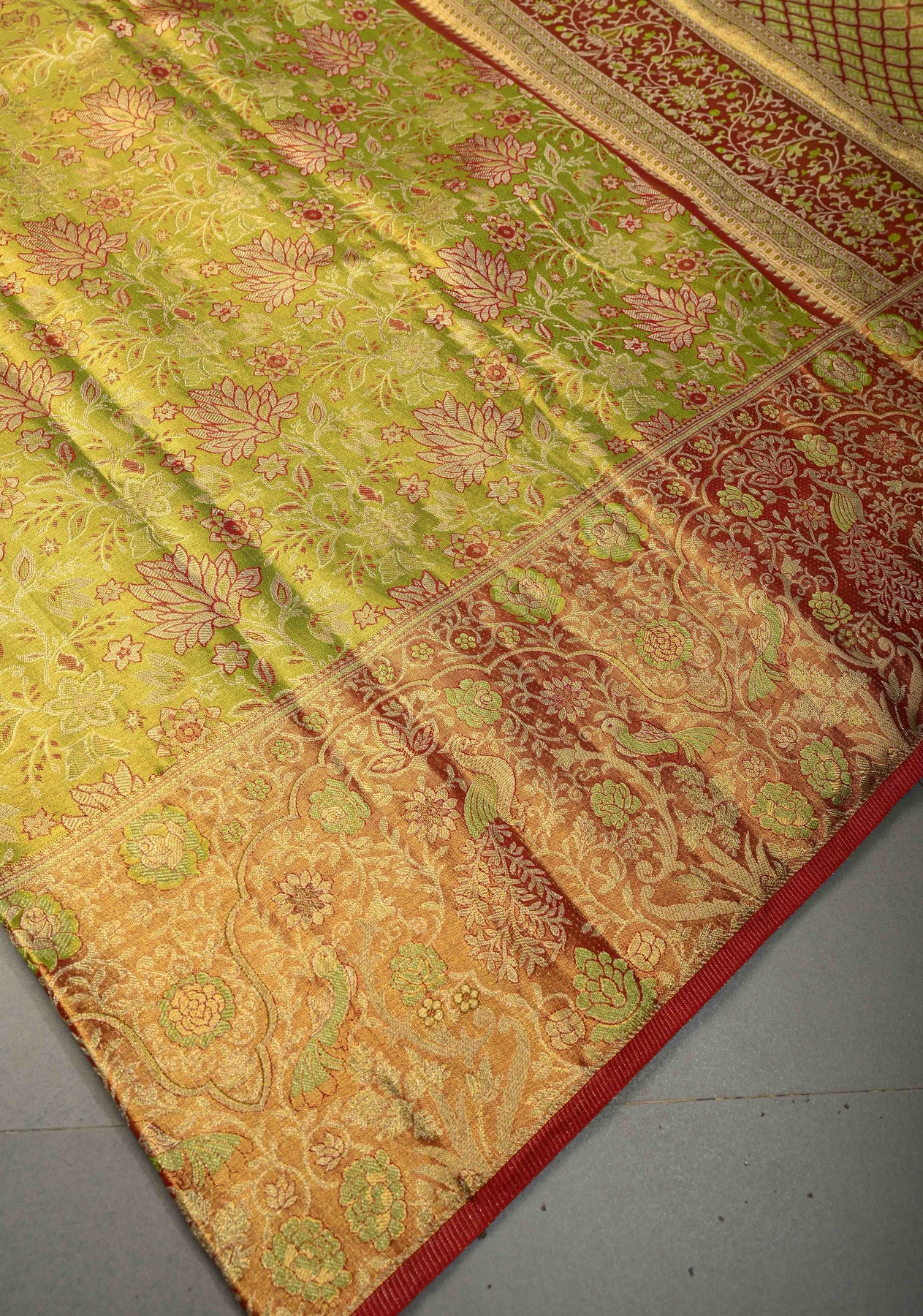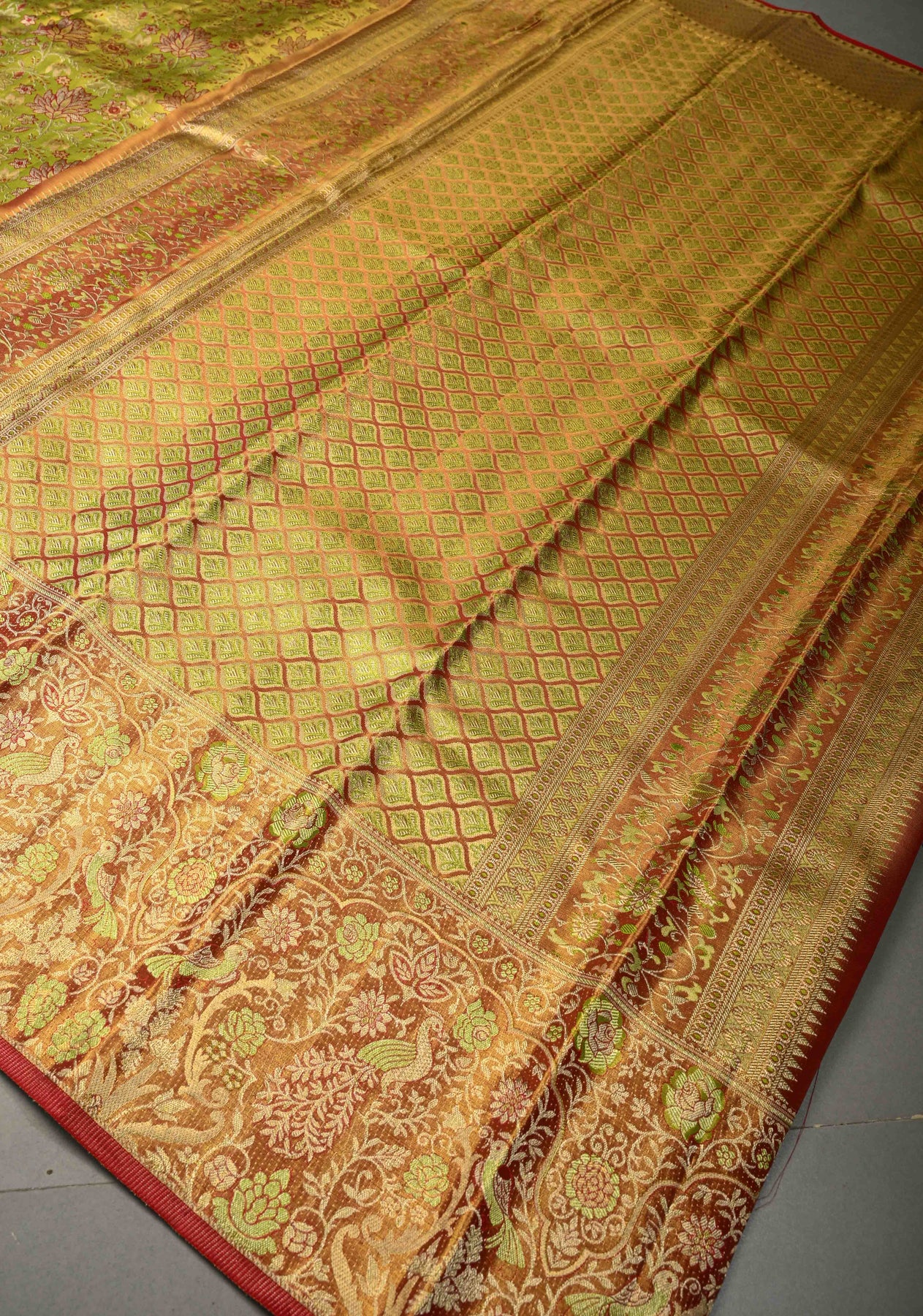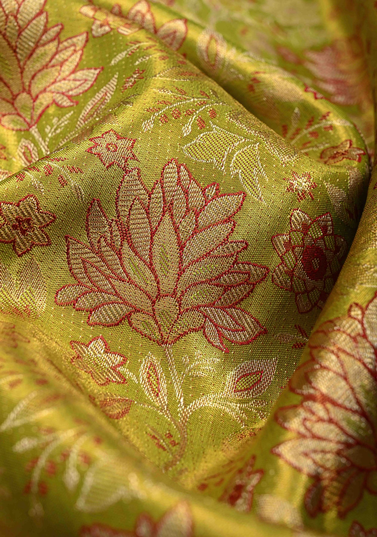 The soothing chartreuse body is adorned with an intricate Meenakari floral brocade jaal, bringing delicate artistry and subtle vibrance to the design. A classic zari border frames the saree, accentuating its elegance while maintaining the timeless sophistication of a Kanjivaram weave. Perfect for weddings, festive occasions, and cultural celebrations, this saree is ideal for women who love heritage weaves with a refined modern touch.