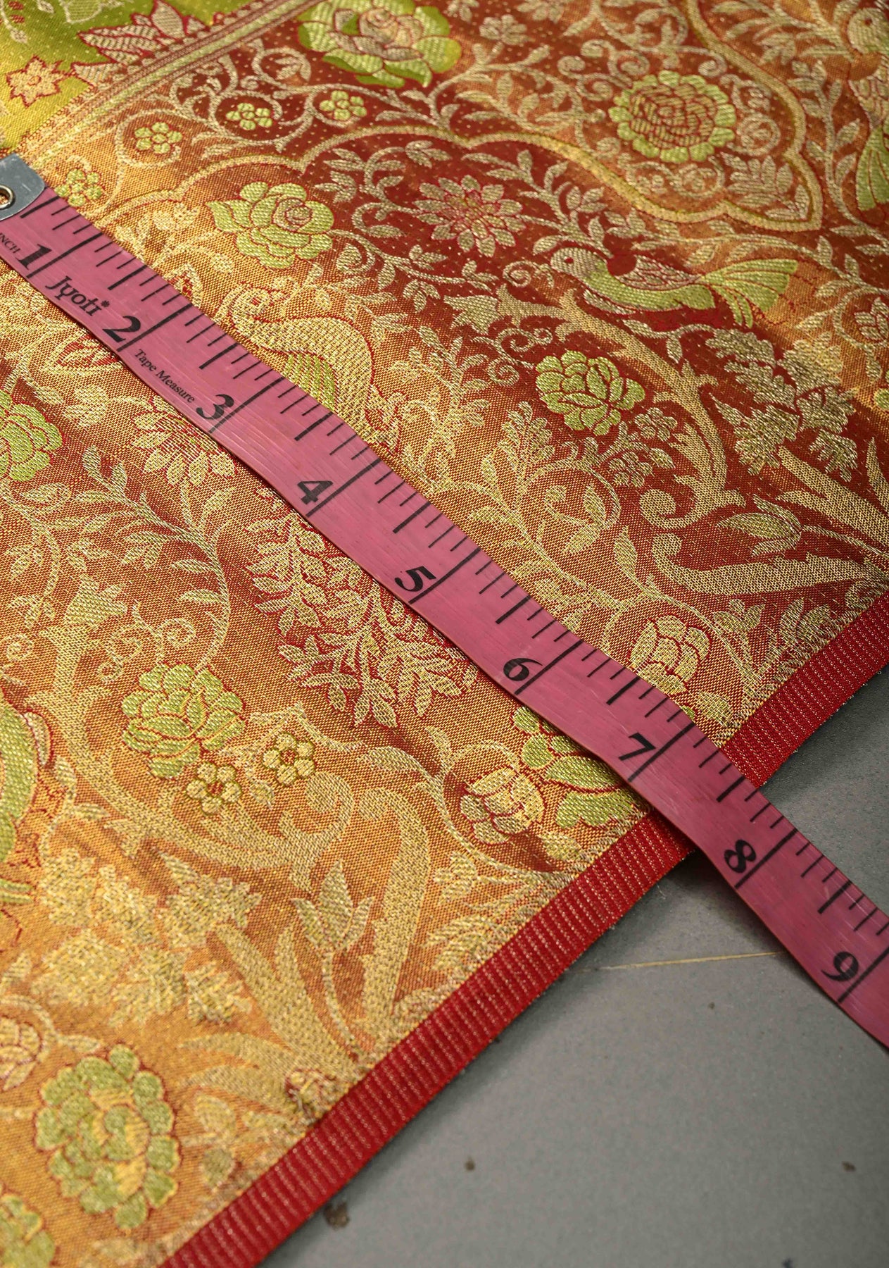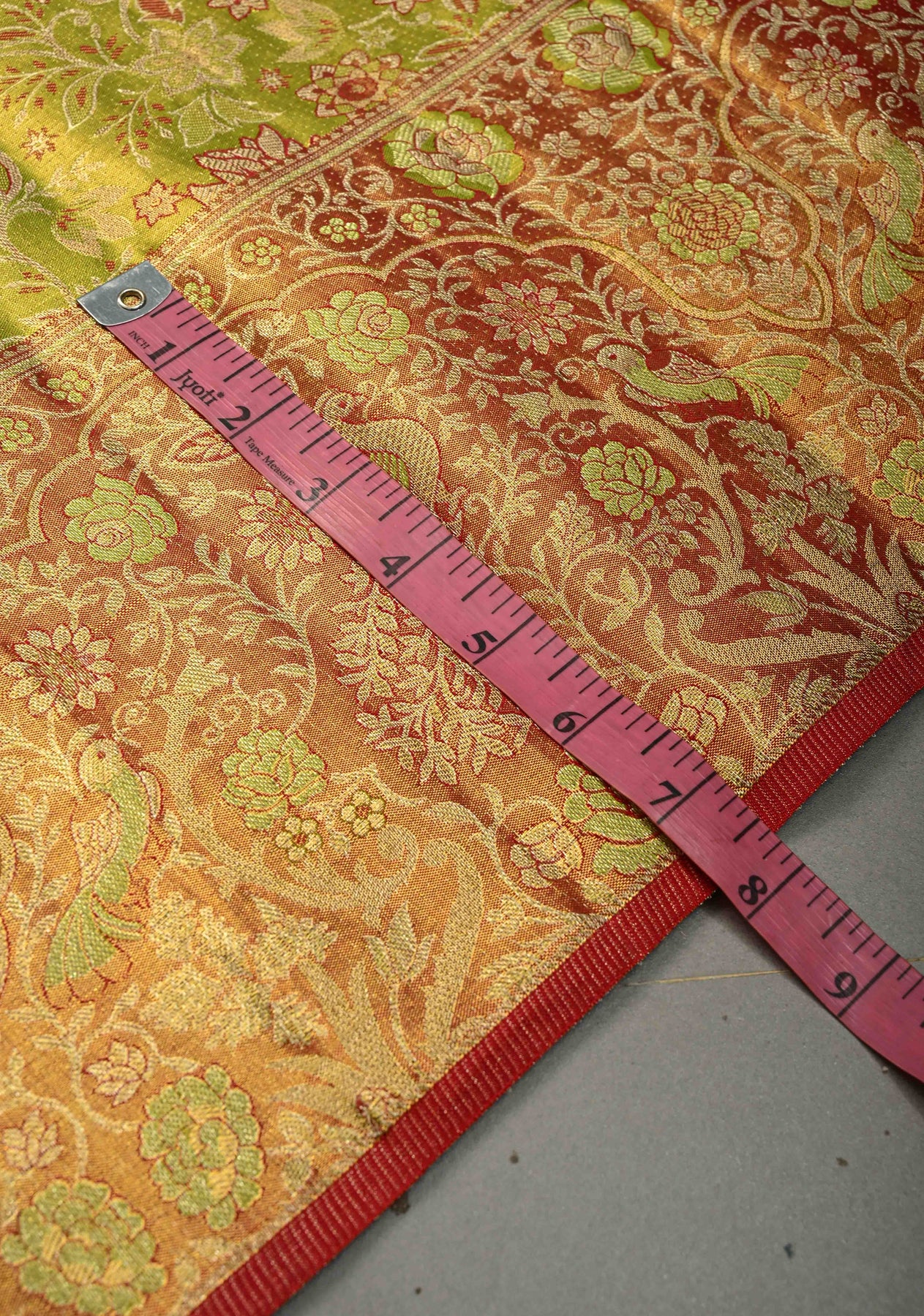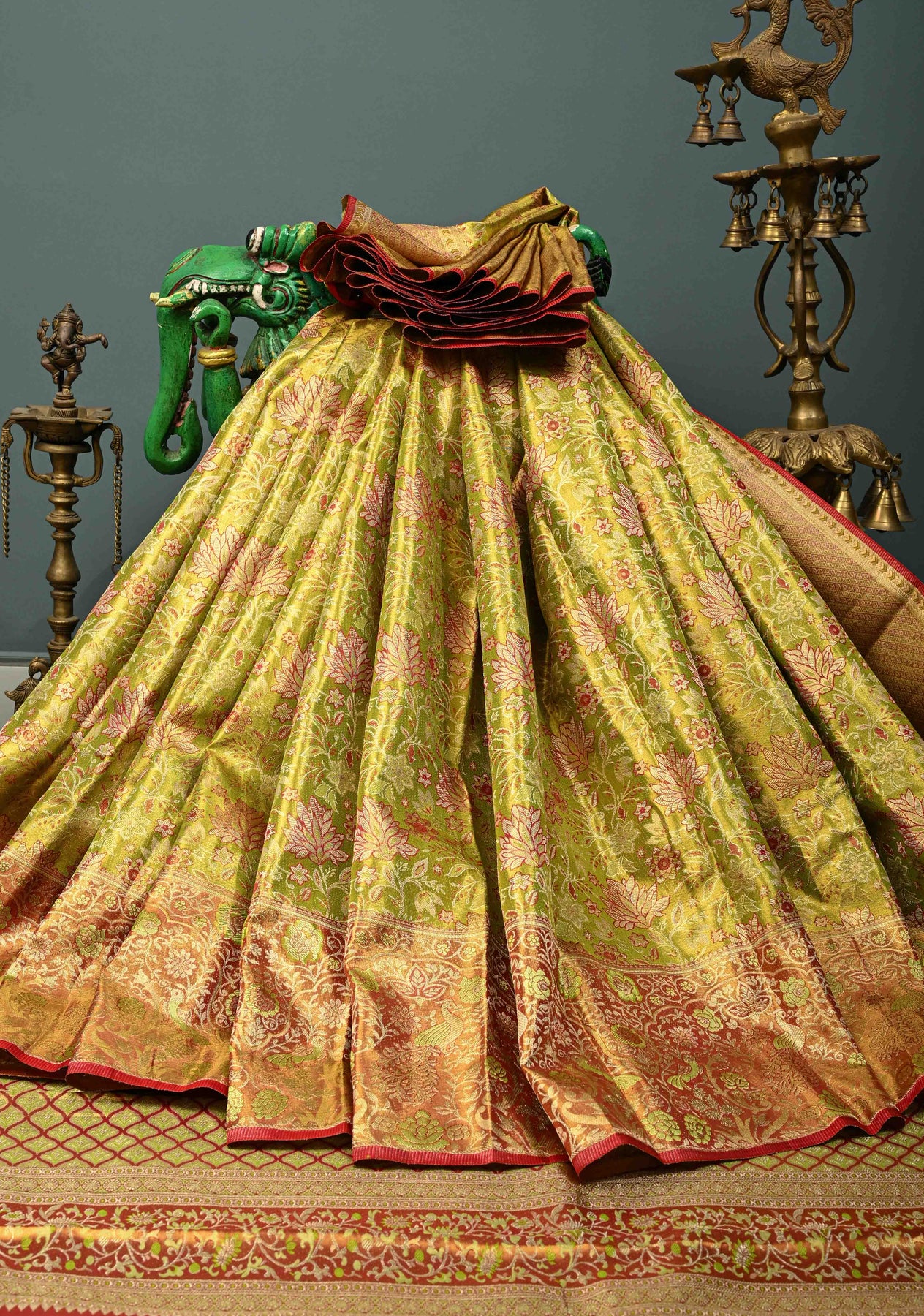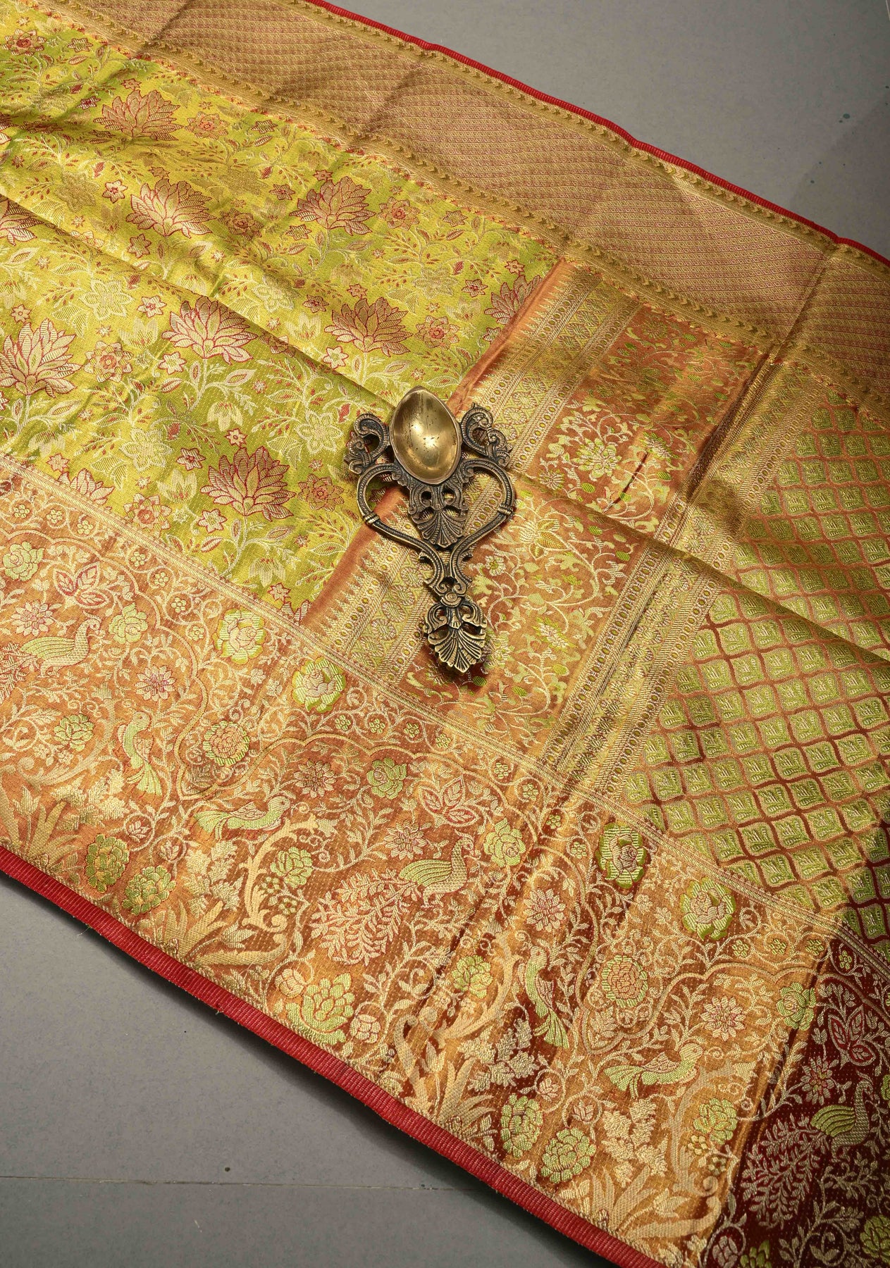 The soothing chartreuse body is adorned with an intricate Meenakari floral brocade jaal, bringing delicate artistry and subtle vibrance to the design. A classic zari border frames the saree, accentuating its elegance while maintaining the timeless sophistication of a Kanjivaram weave. Perfect for weddings, festive occasions, and cultural celebrations, this saree is ideal for women who love heritage weaves with a refined modern touch.