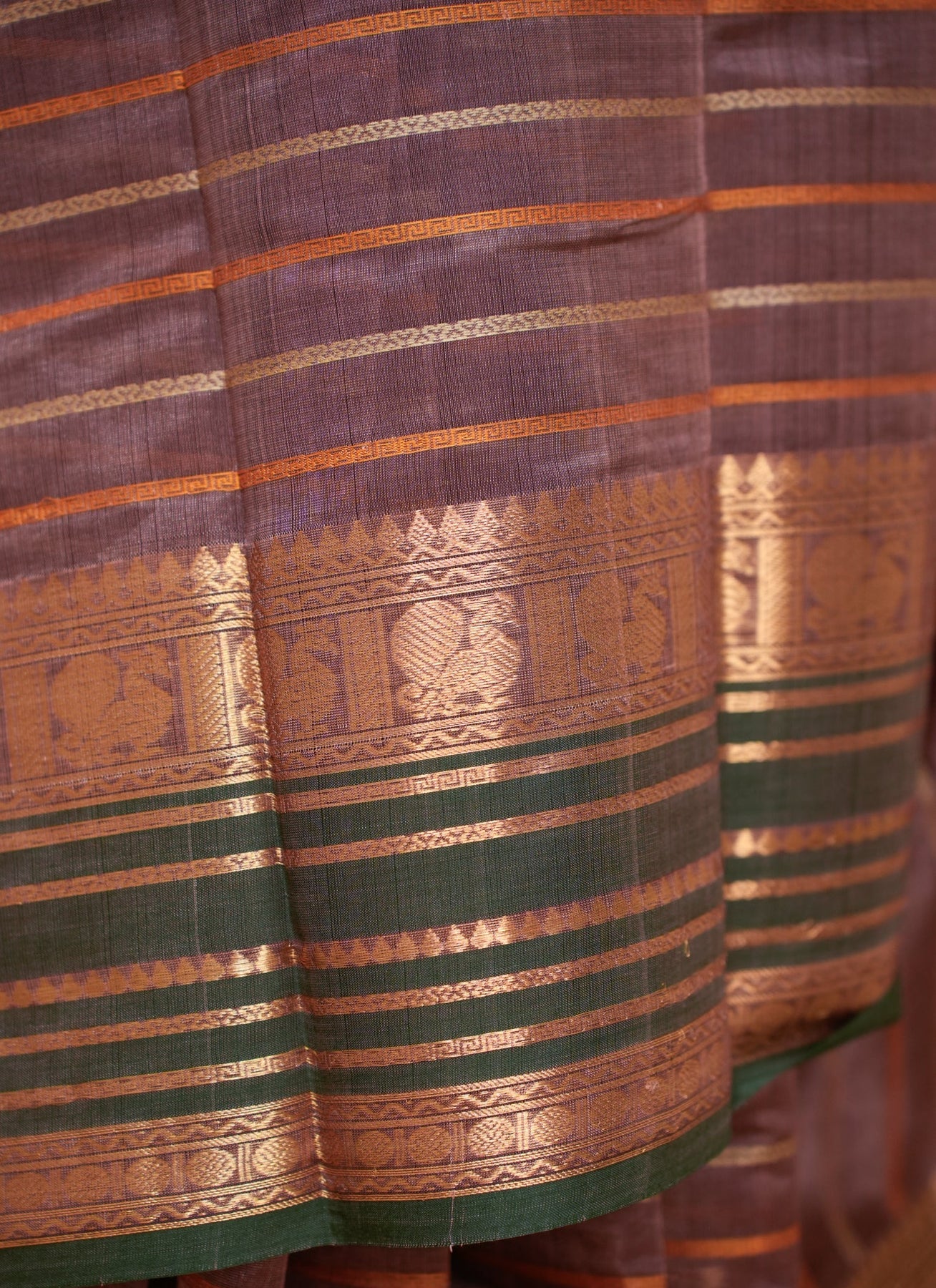 This Kanchi silk-cotton saree in a deep cocoa brown hue is a picture of quiet sophistication. The body glows with Veldhari stripes running through — a classic Kanchipuram design brought to life in soft sheen. The rich borders and pallu woven in fine zari add just the right amount of festive glimmer, keeping it elegant yet celebratory.