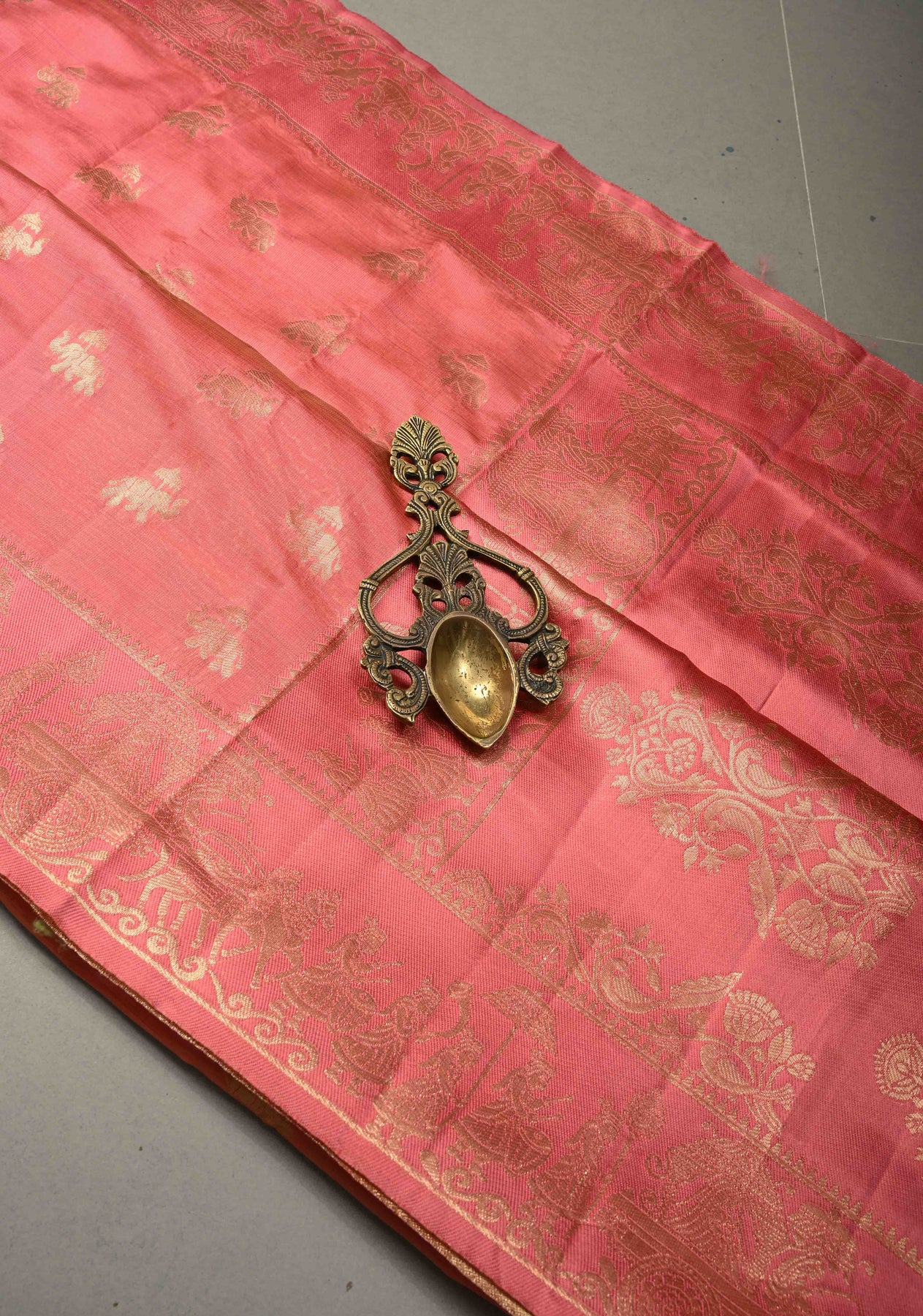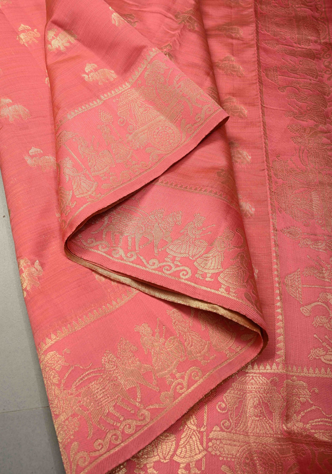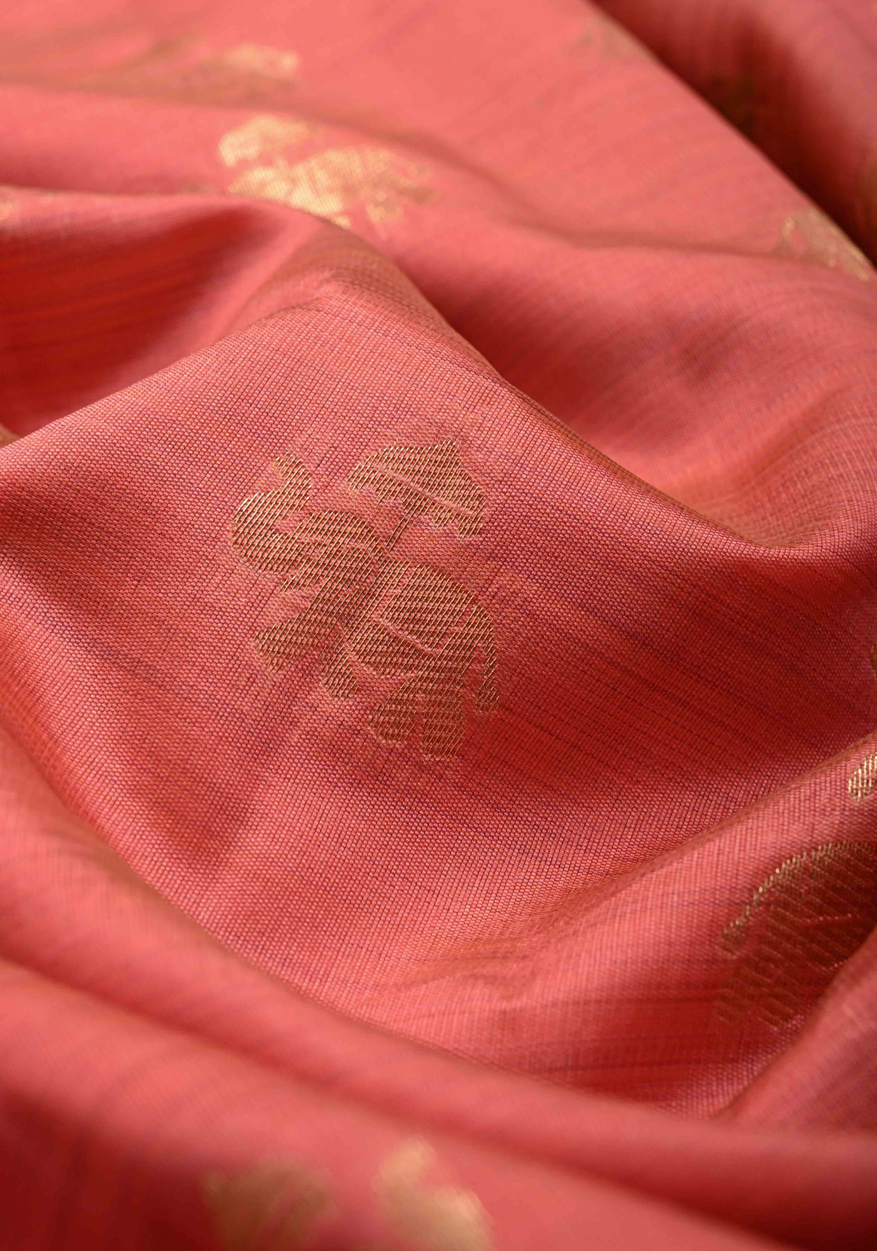 The soft coral pink body is beautifully adorned with elephant-inspired zari buttas, symbolizing strength and prosperity, adding a playful yet elegant motif to the design. A procession-style zari border completes the look with grandeur, while the Kanjivaram-inspired pallu adds a traditional finishing touch. Perfect for weddings, festive occasions, and cultural celebrations, this saree is ideal for women who love heritage-inspired weaves with a modern twist.